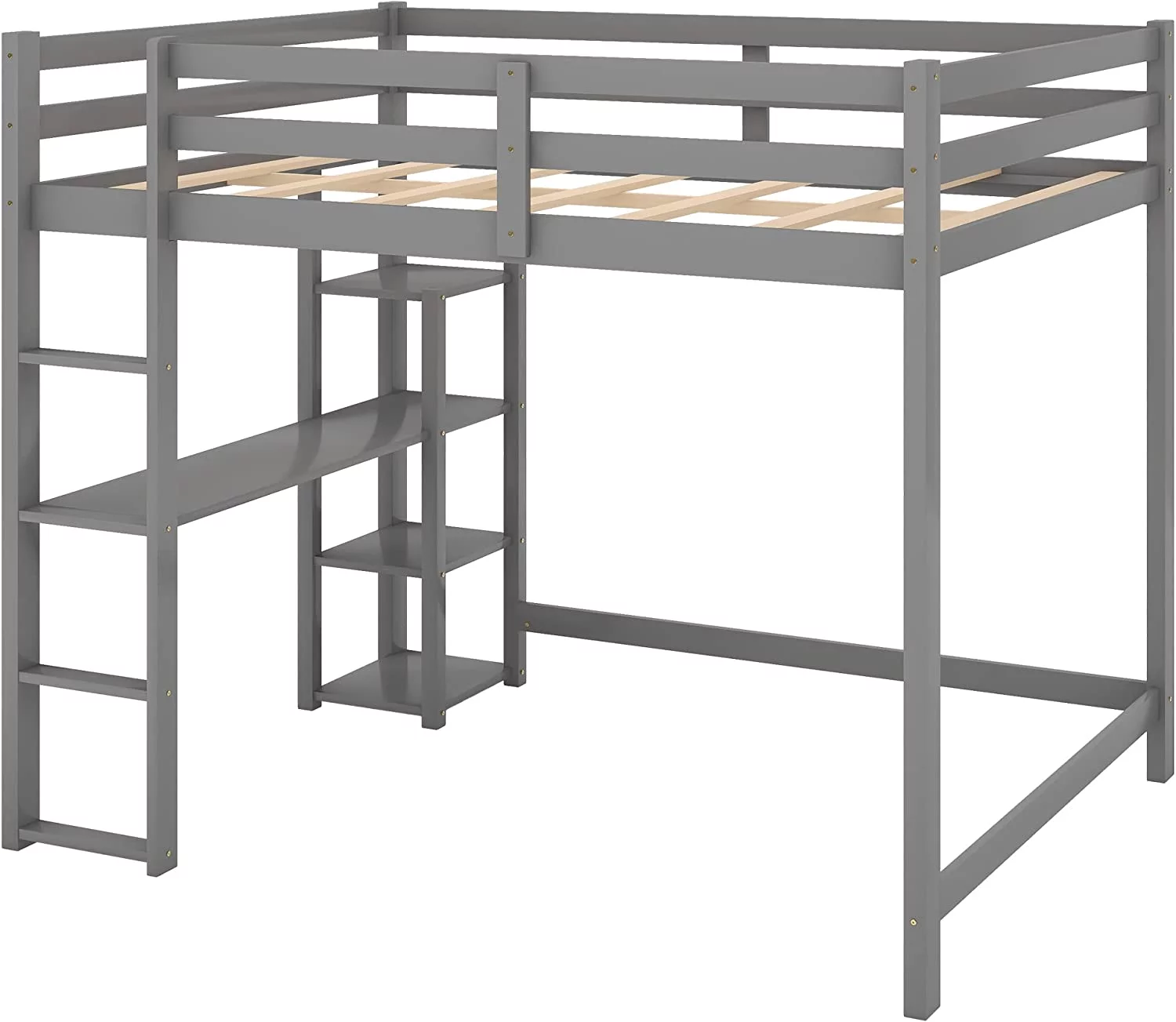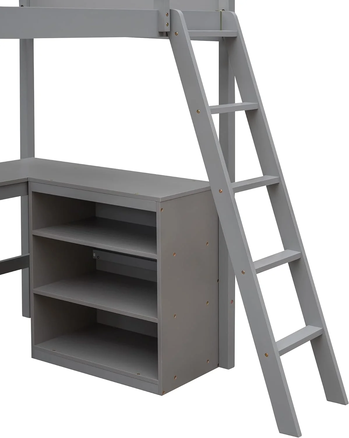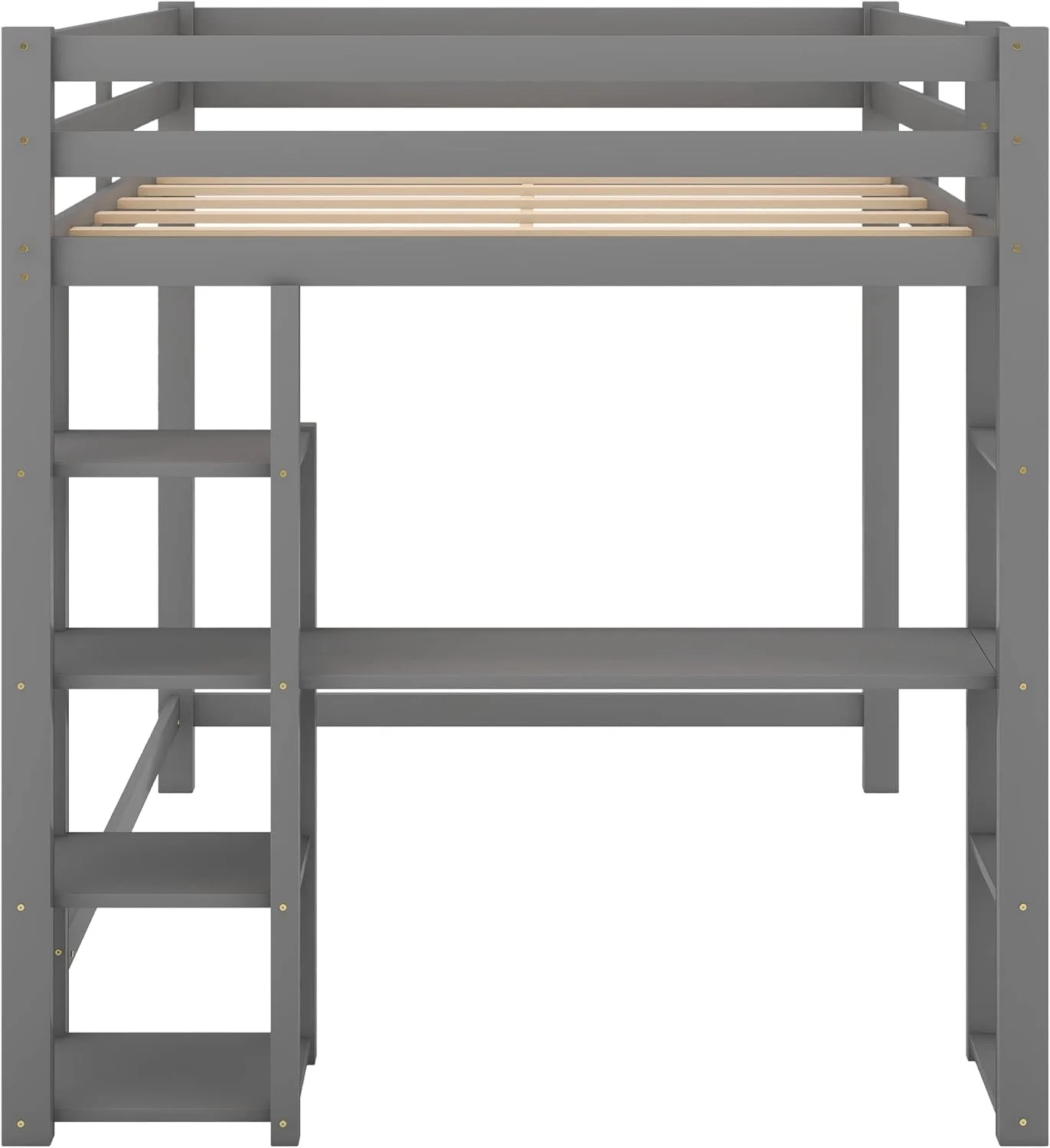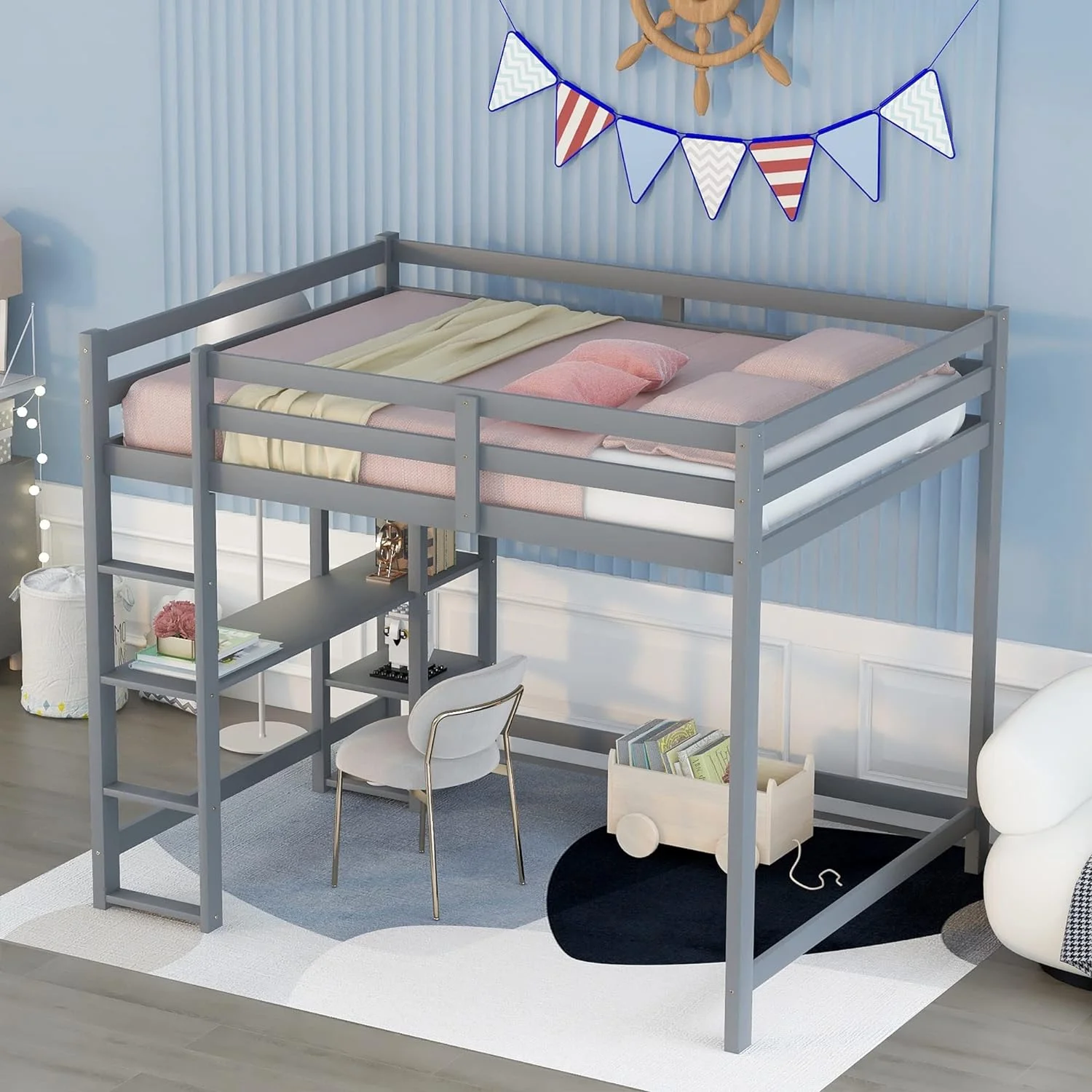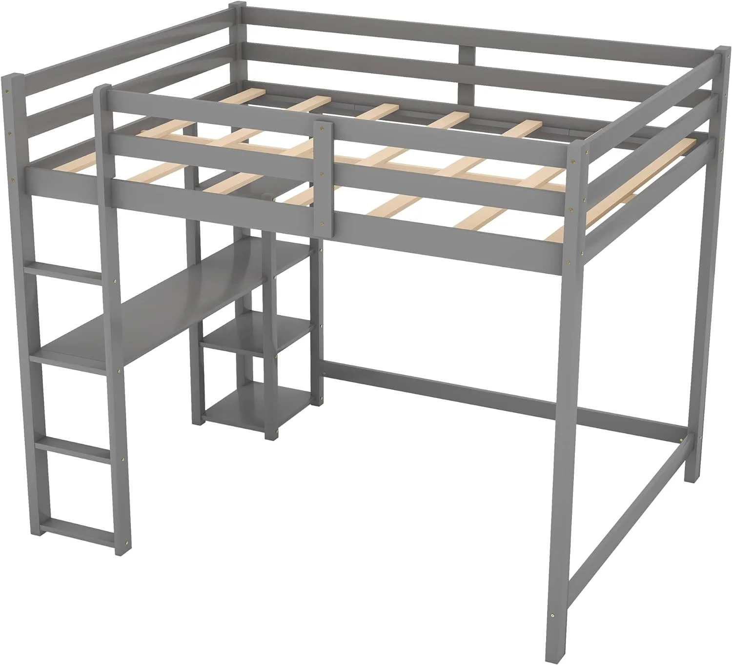 Full Size Loft Bed With Desk And Shelves, Wooden Loft Bed Frame For Kids Teens Adults (Gray)