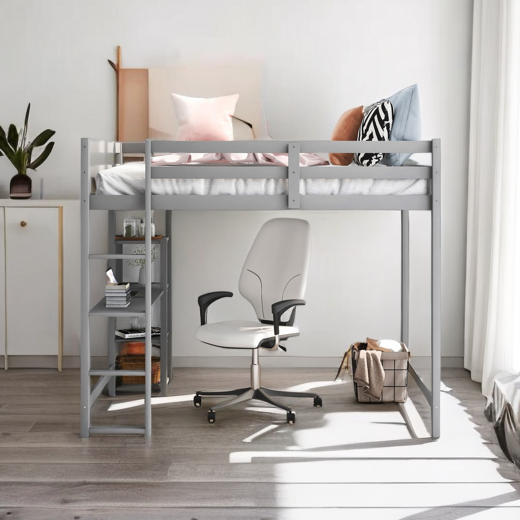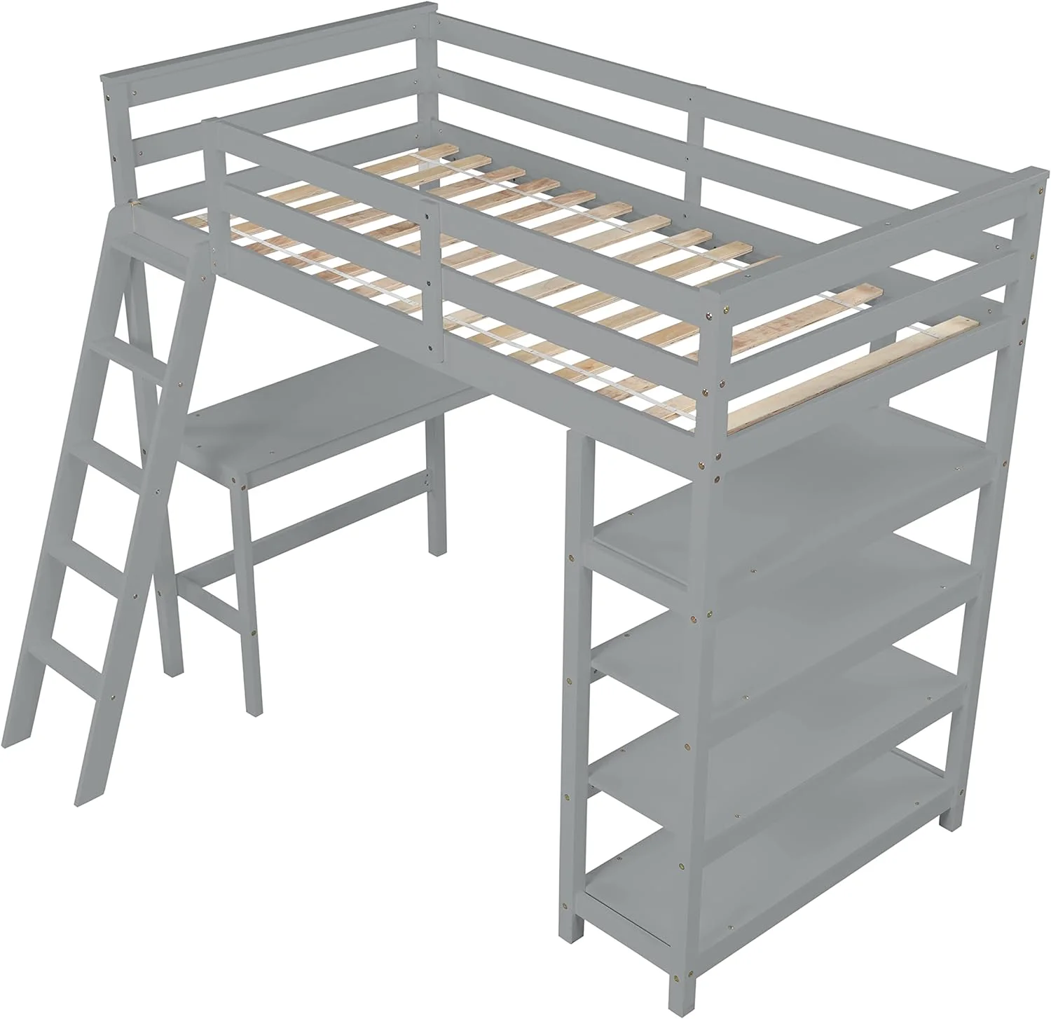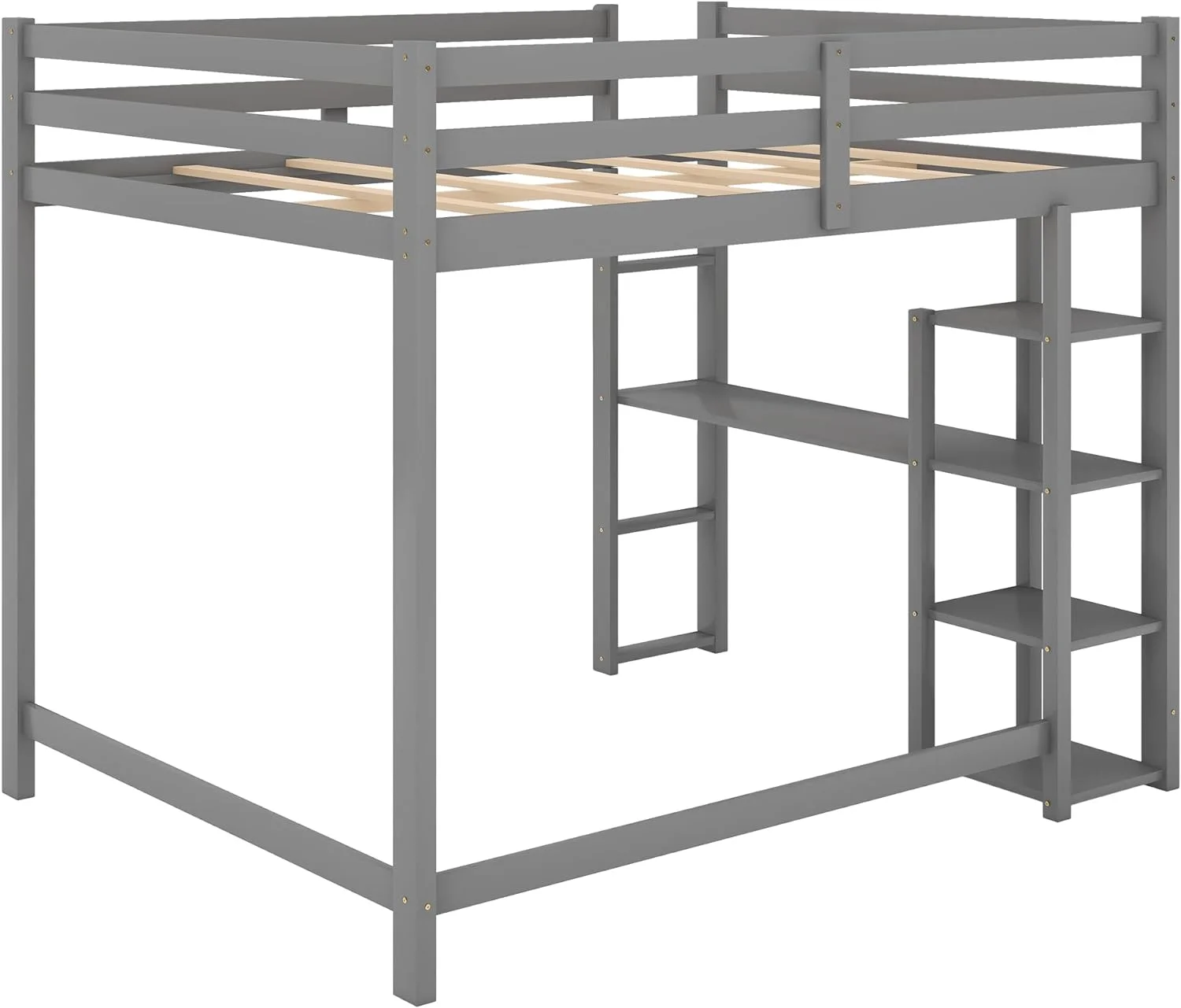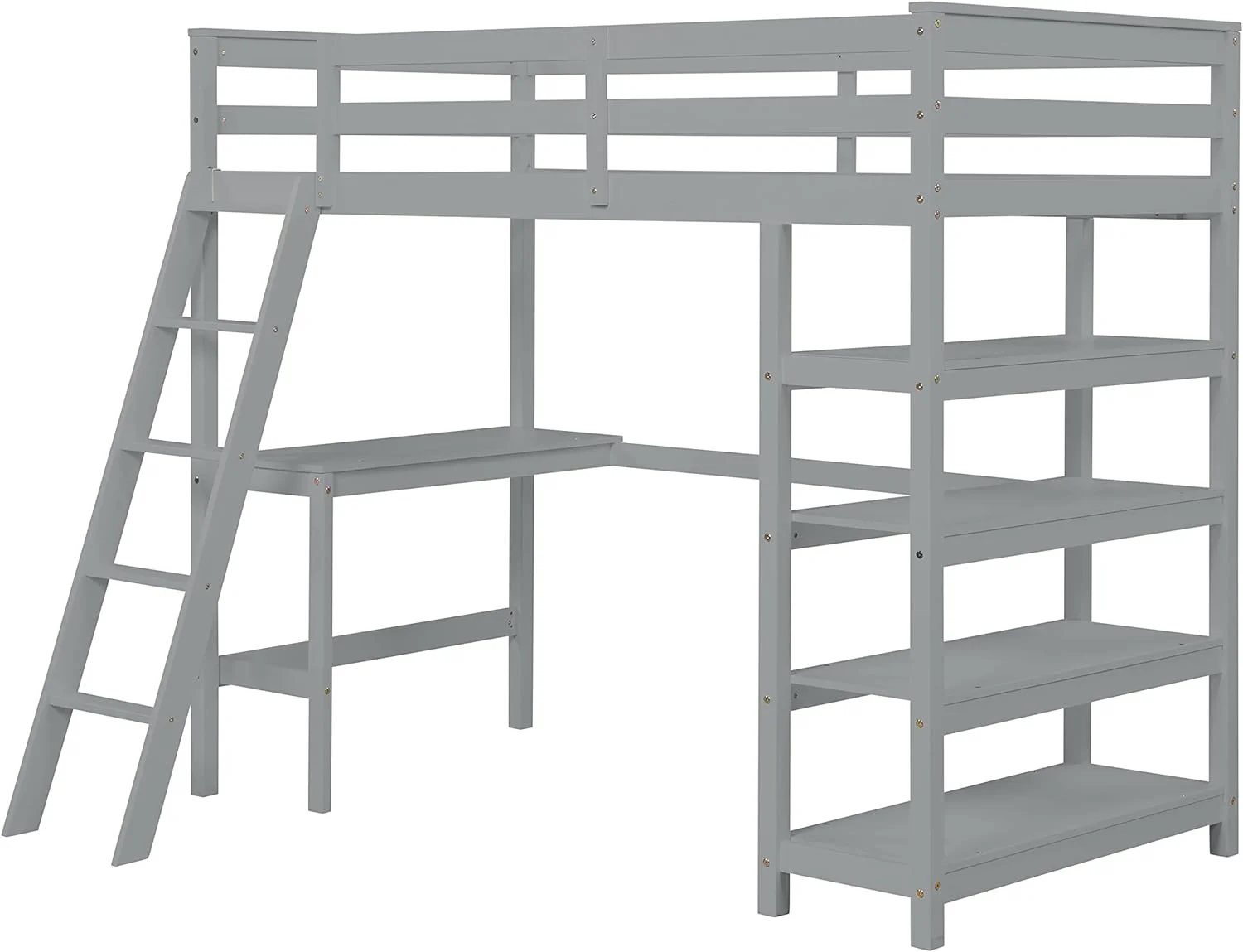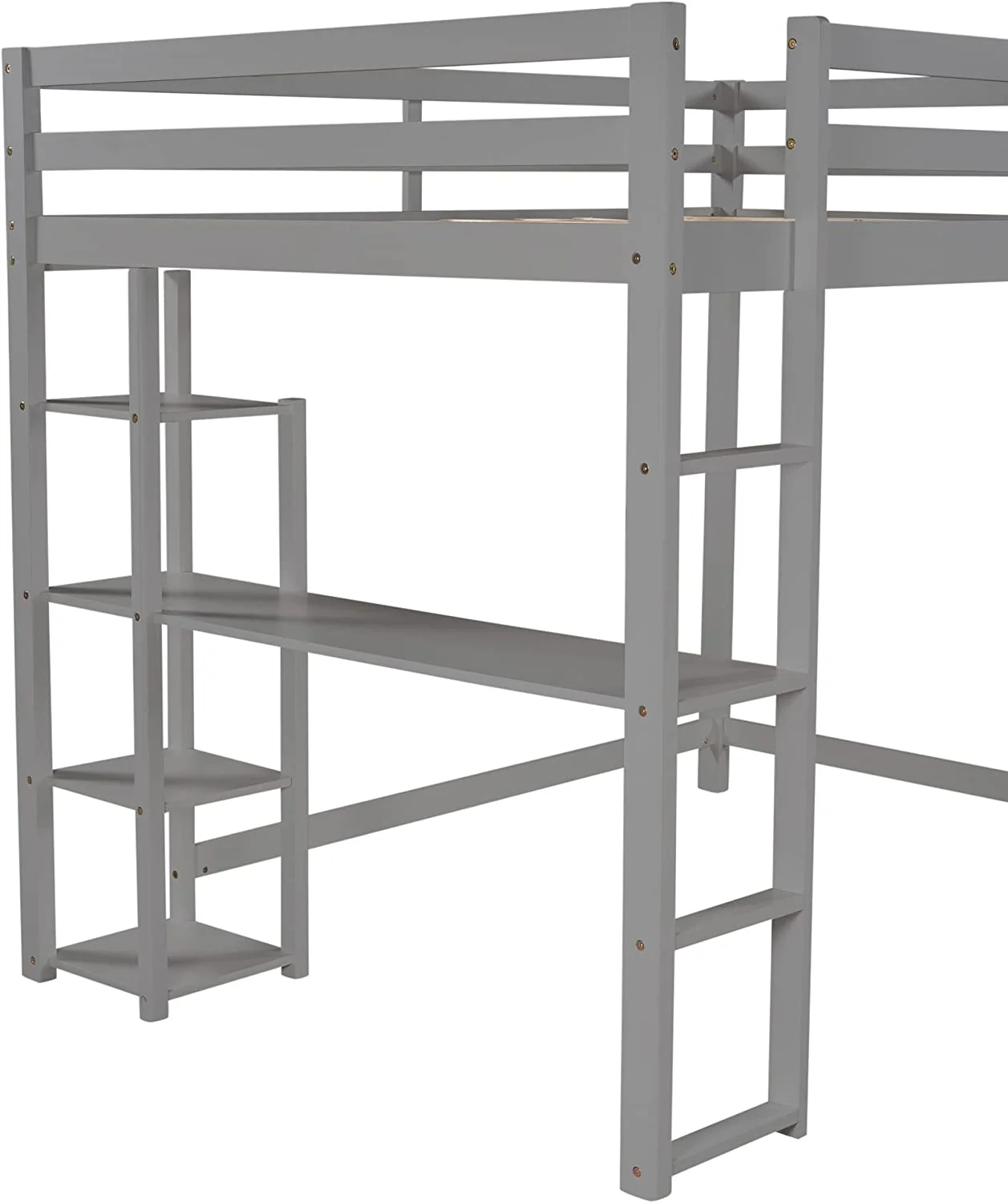 Full Size Loft Bed With Desk And Shelves, Wooden Loft Bed Frame For Kids Teens Adults (Gray)