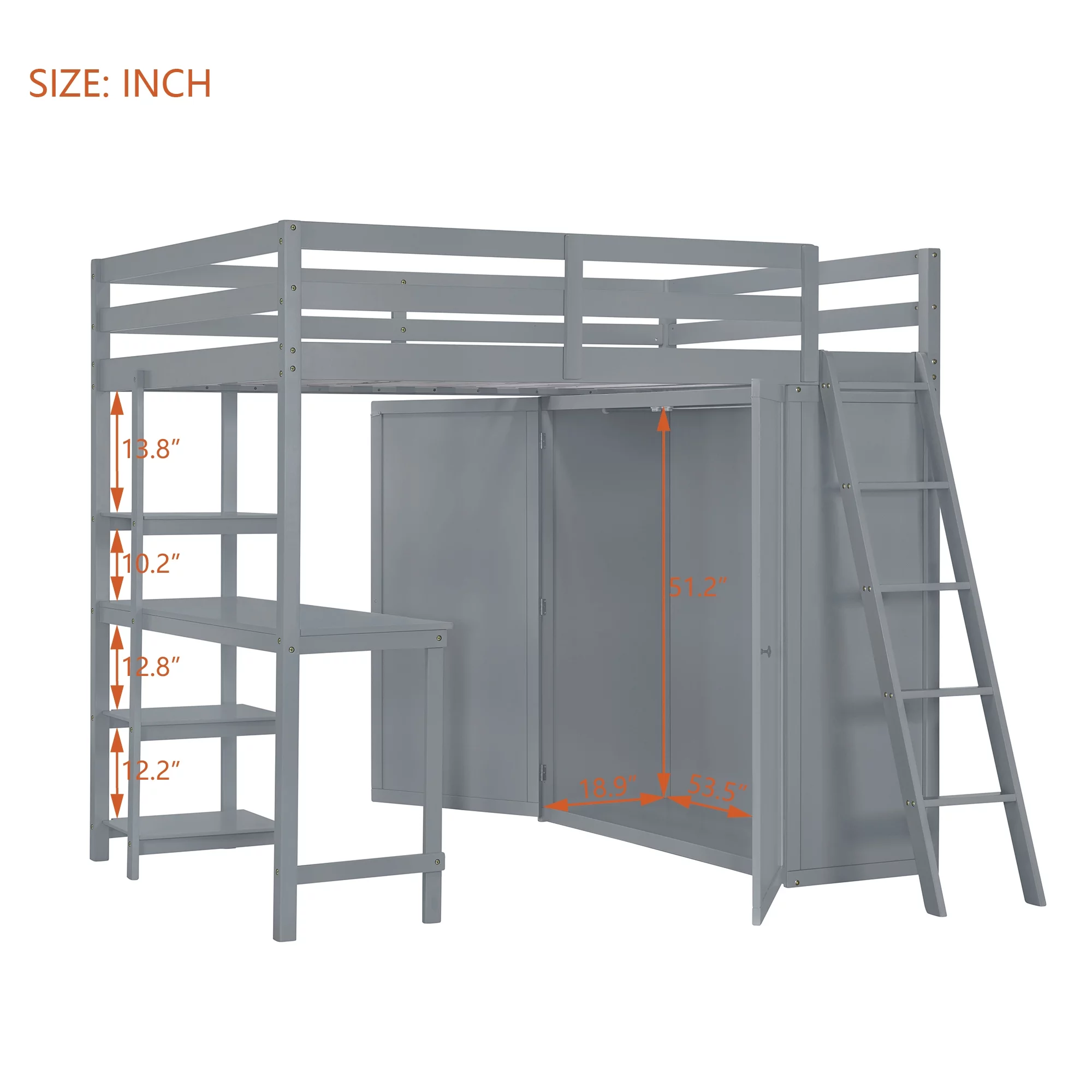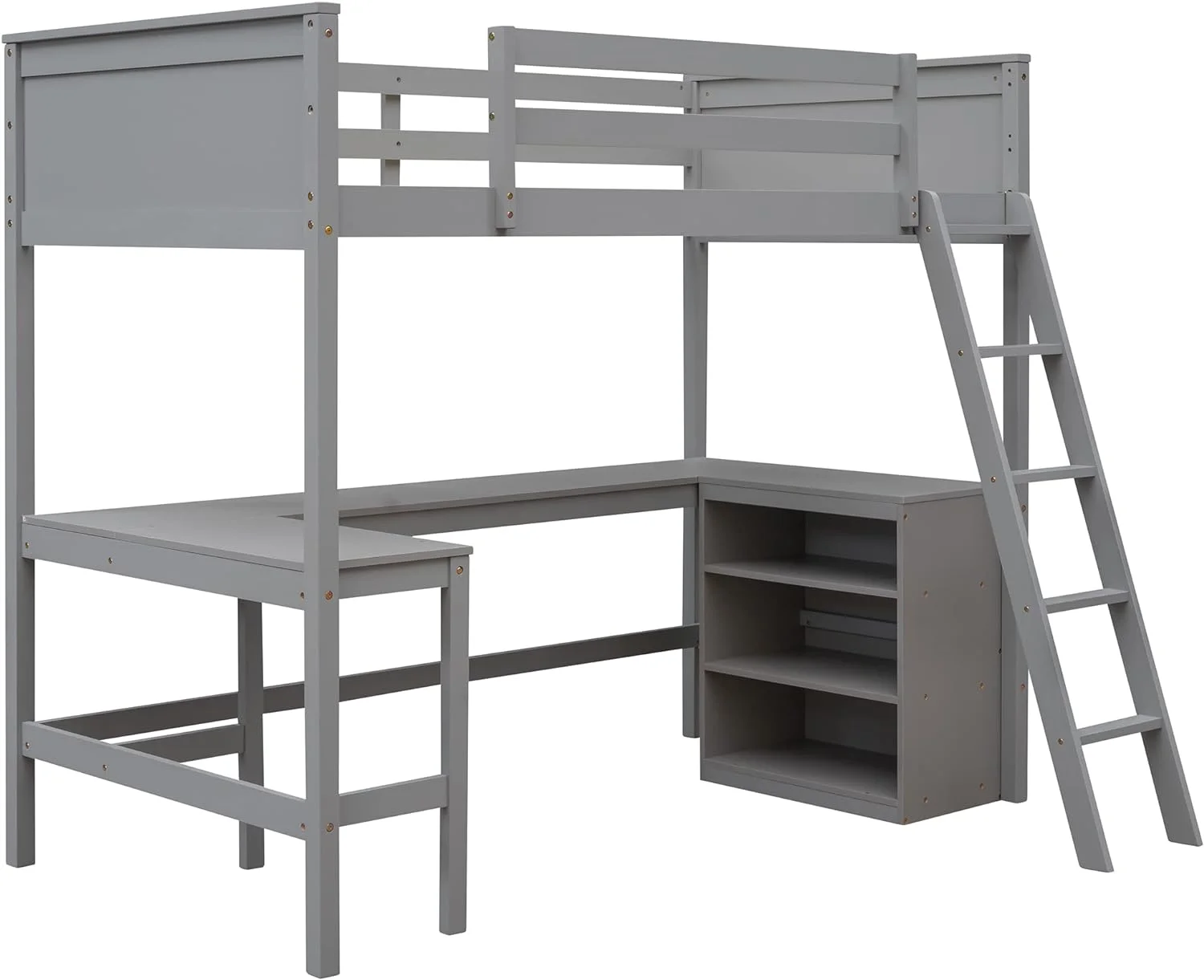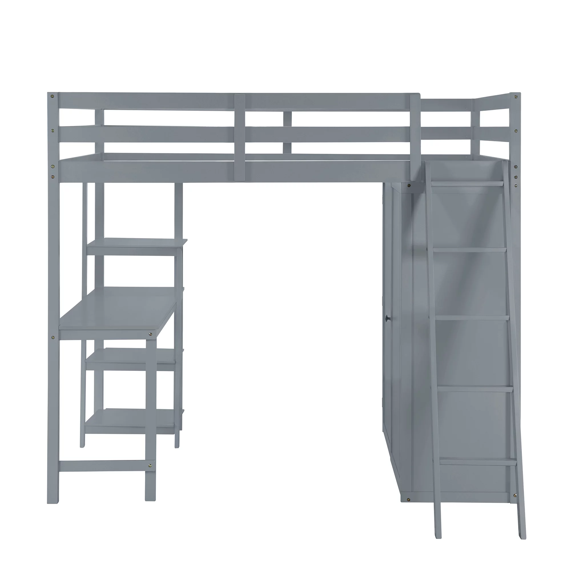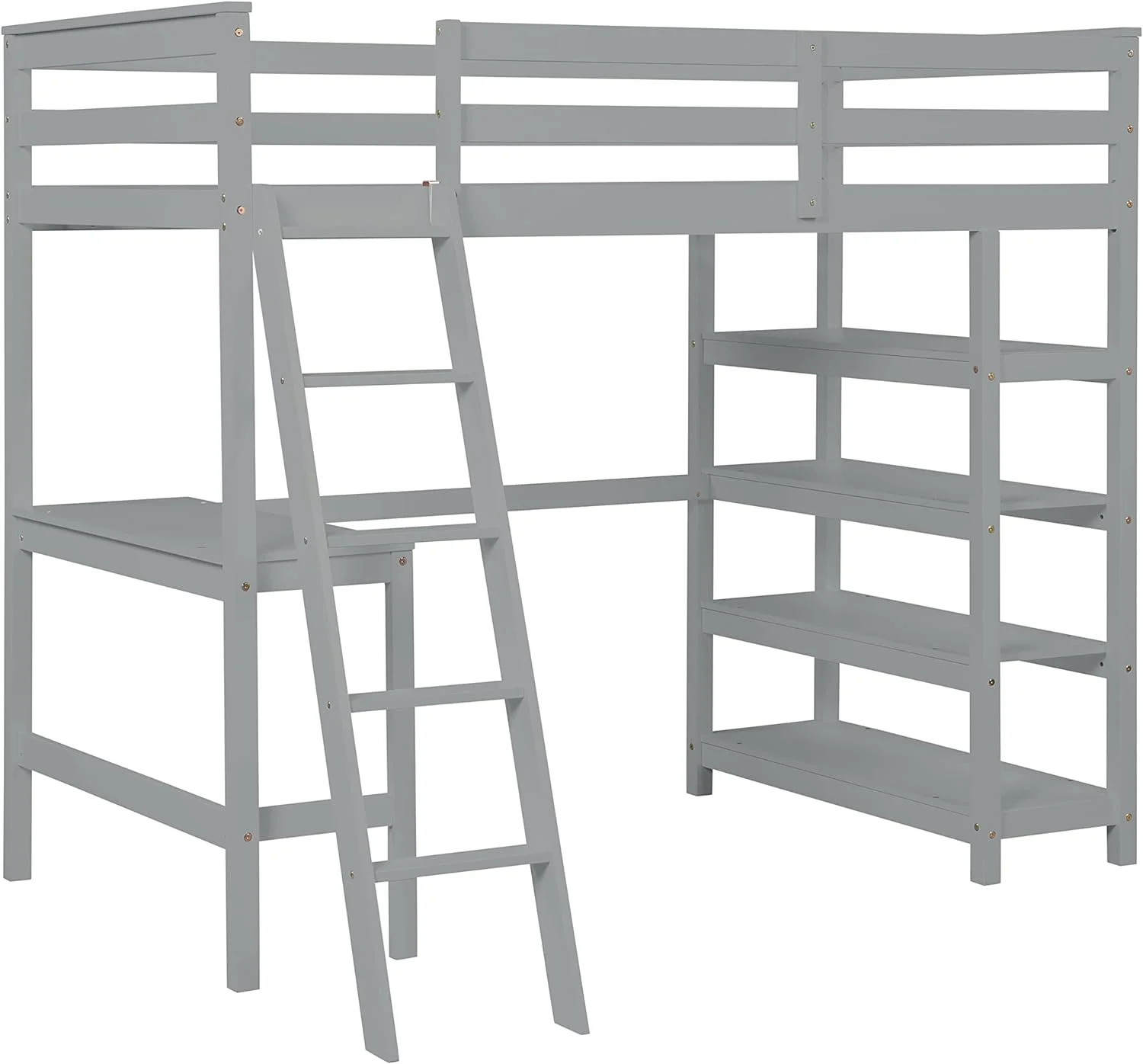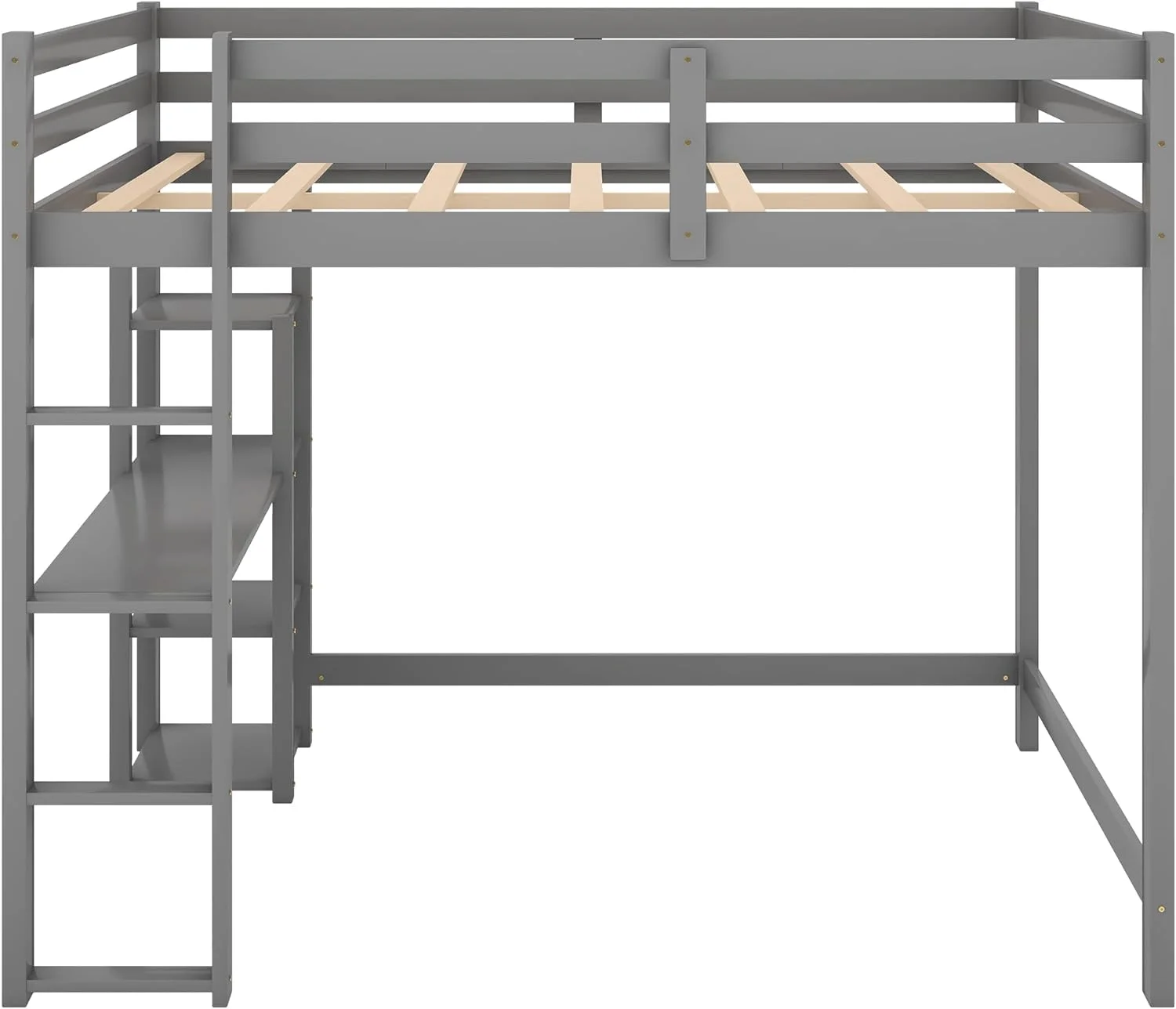 Full Size Loft Bed With Desk And Shelves, Wooden Loft Bed Frame For Kids Teens Adults (Gray)