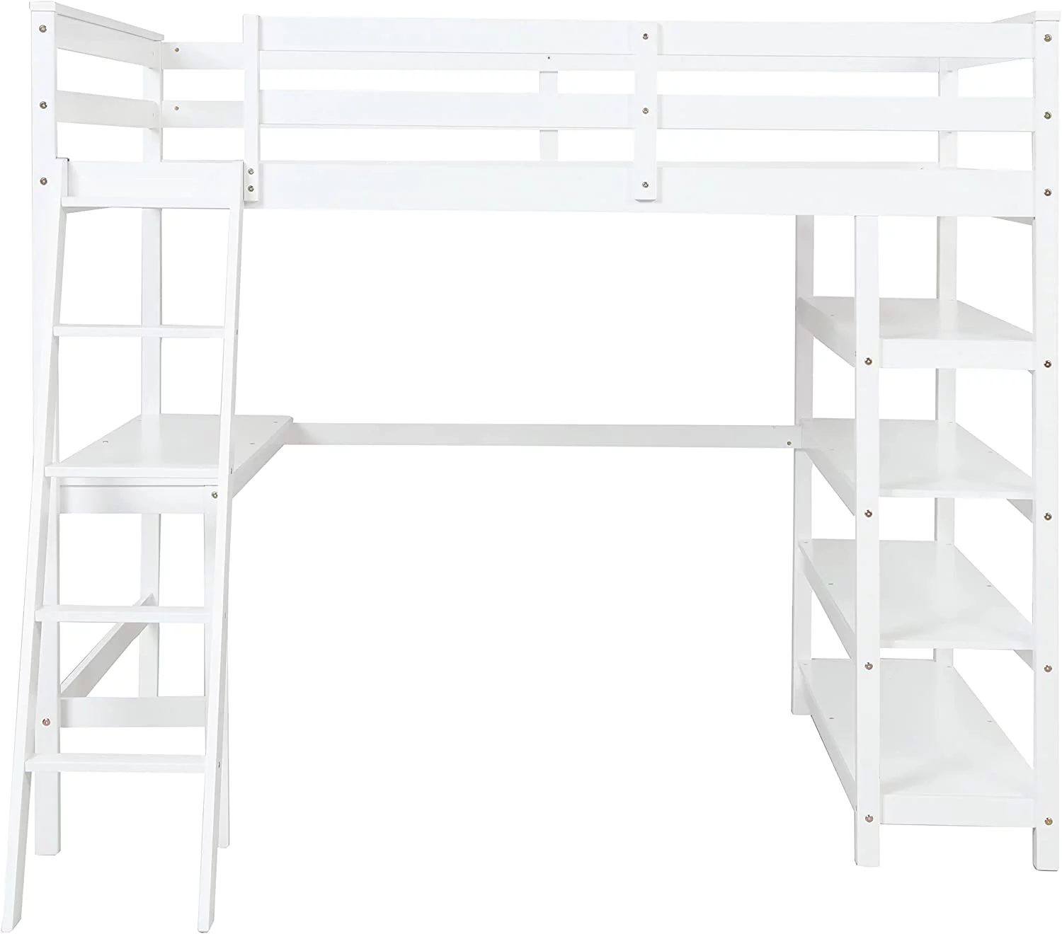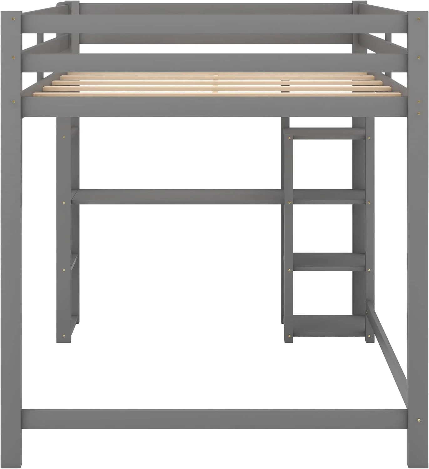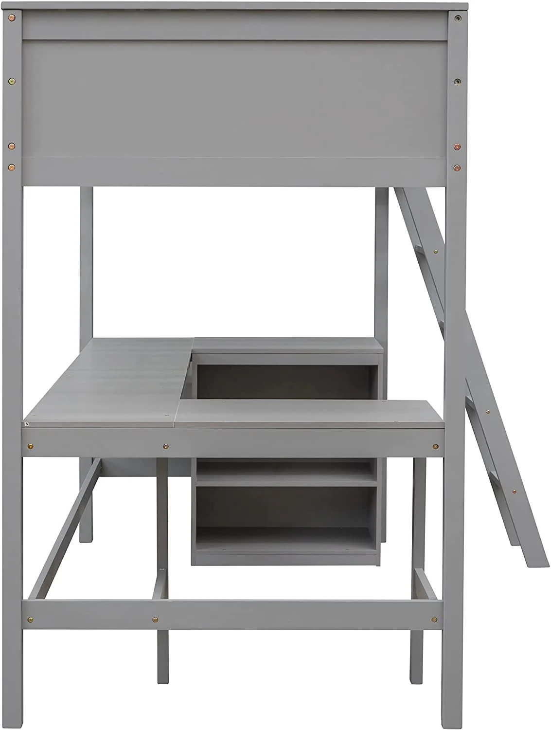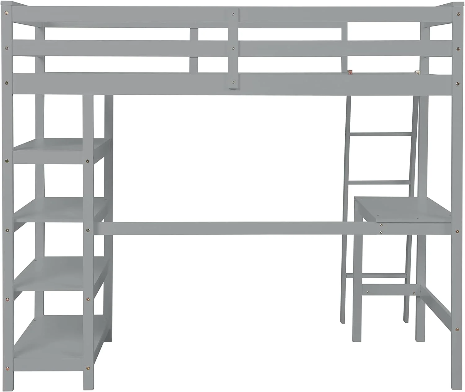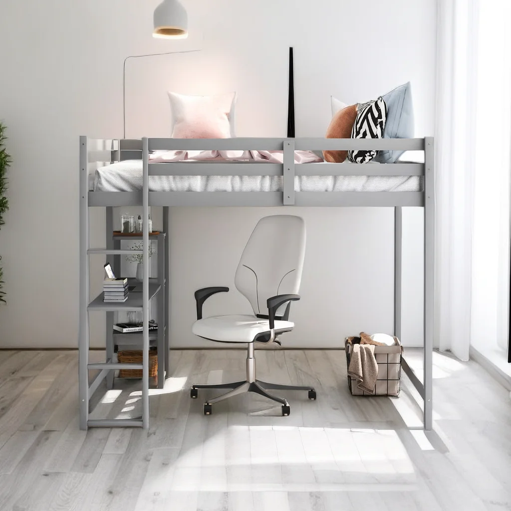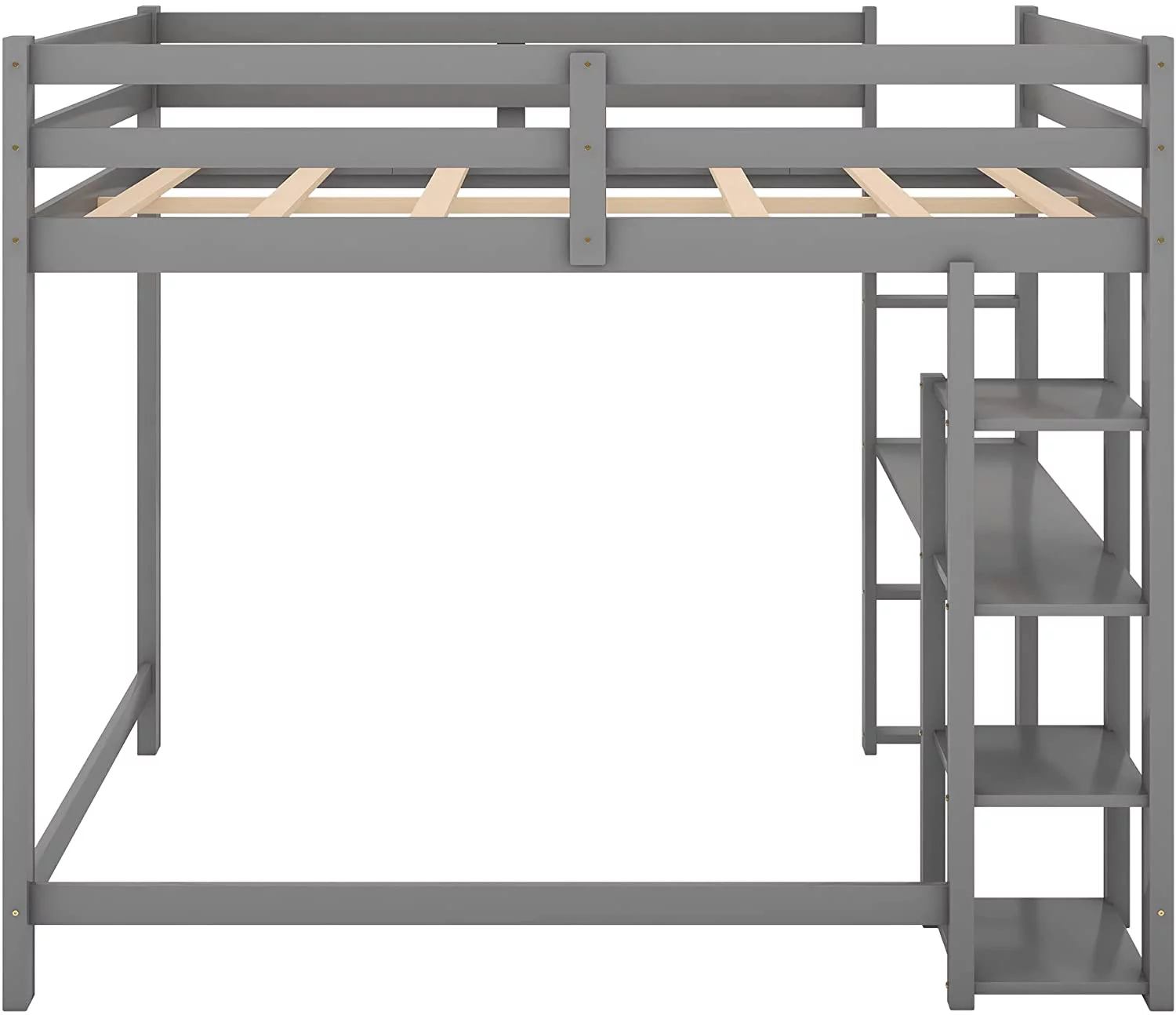 Full Size Loft Bed With Desk And Shelves, Wooden Loft Bed Frame For Kids Teens Adults (Gray)