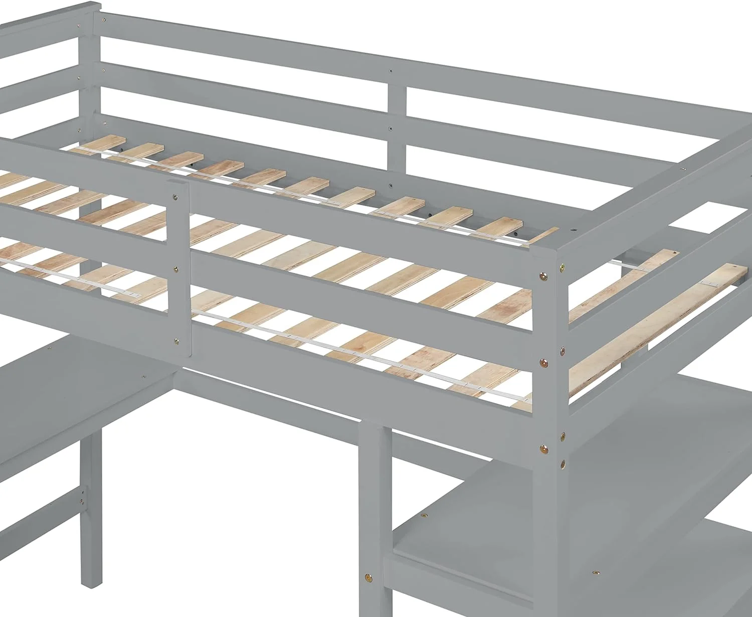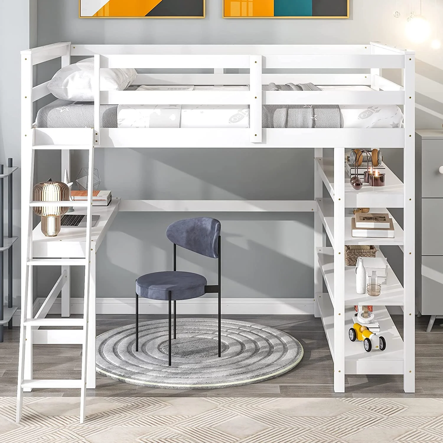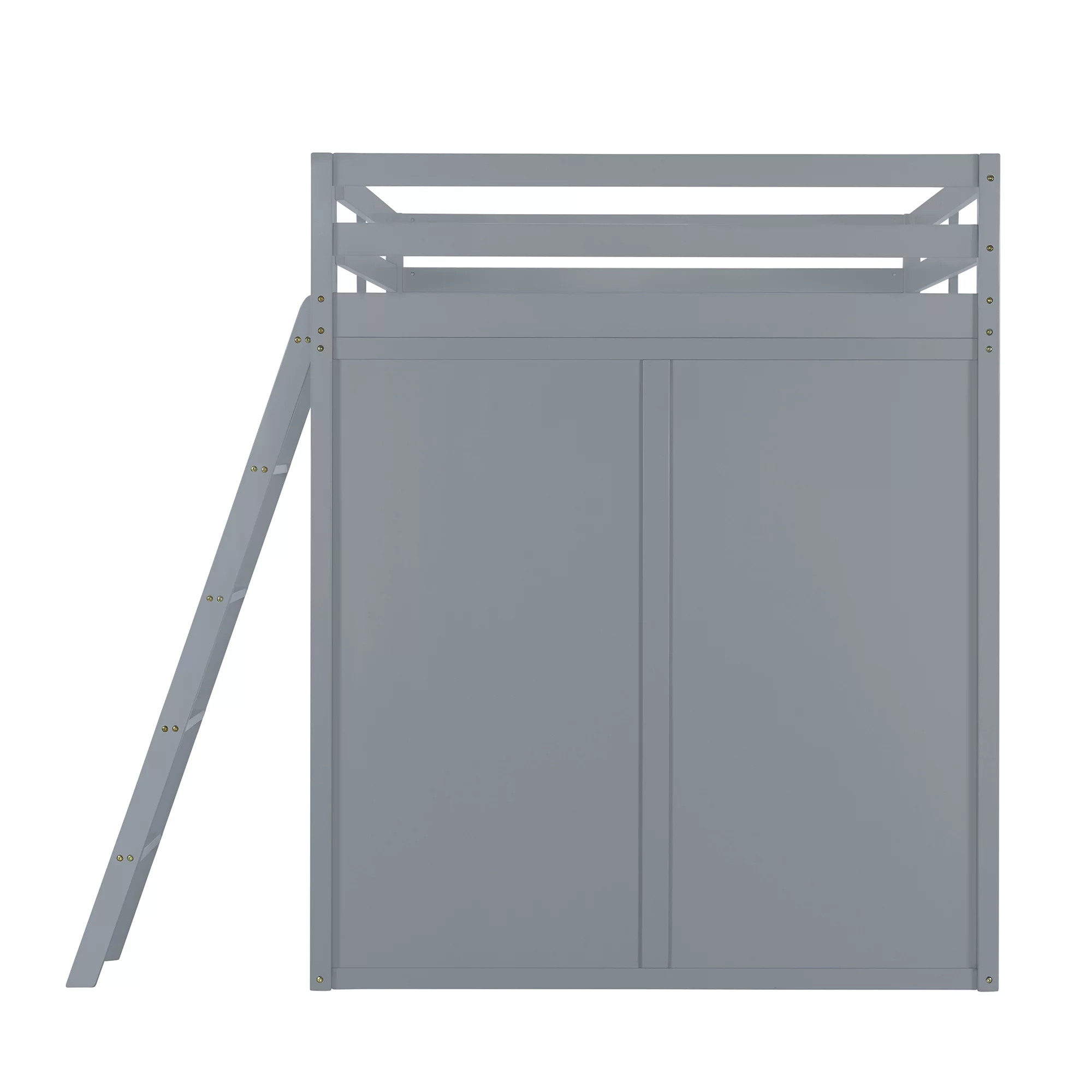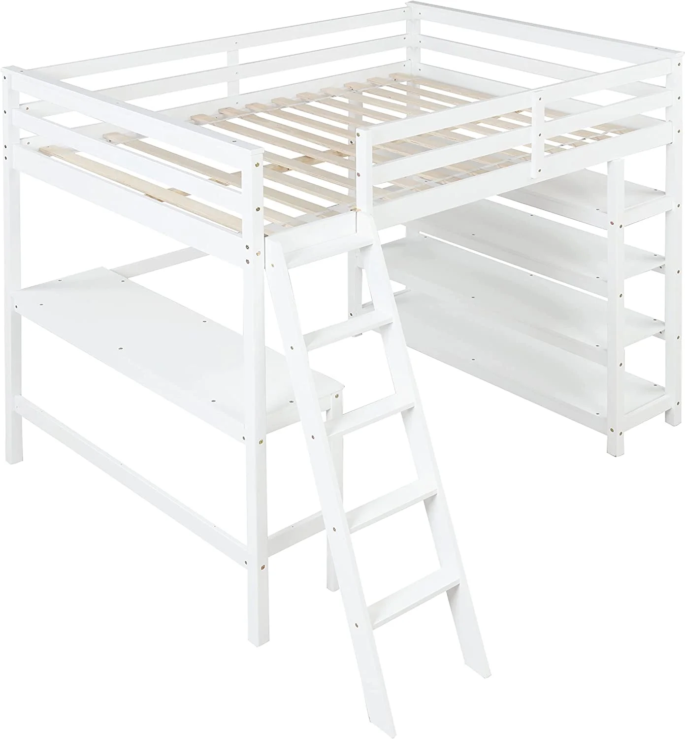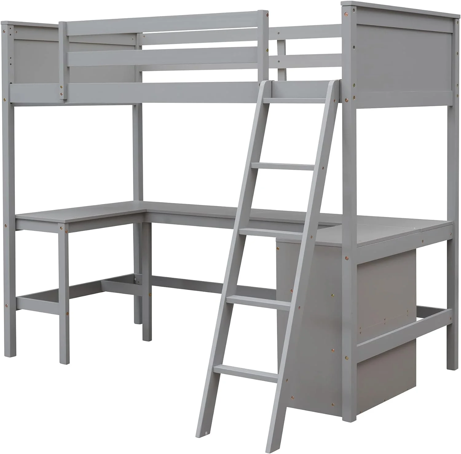 Full Size Loft Bed With Desk And Shelves, Wooden Loft Bed Frame For Kids Teens Adults (Gray)