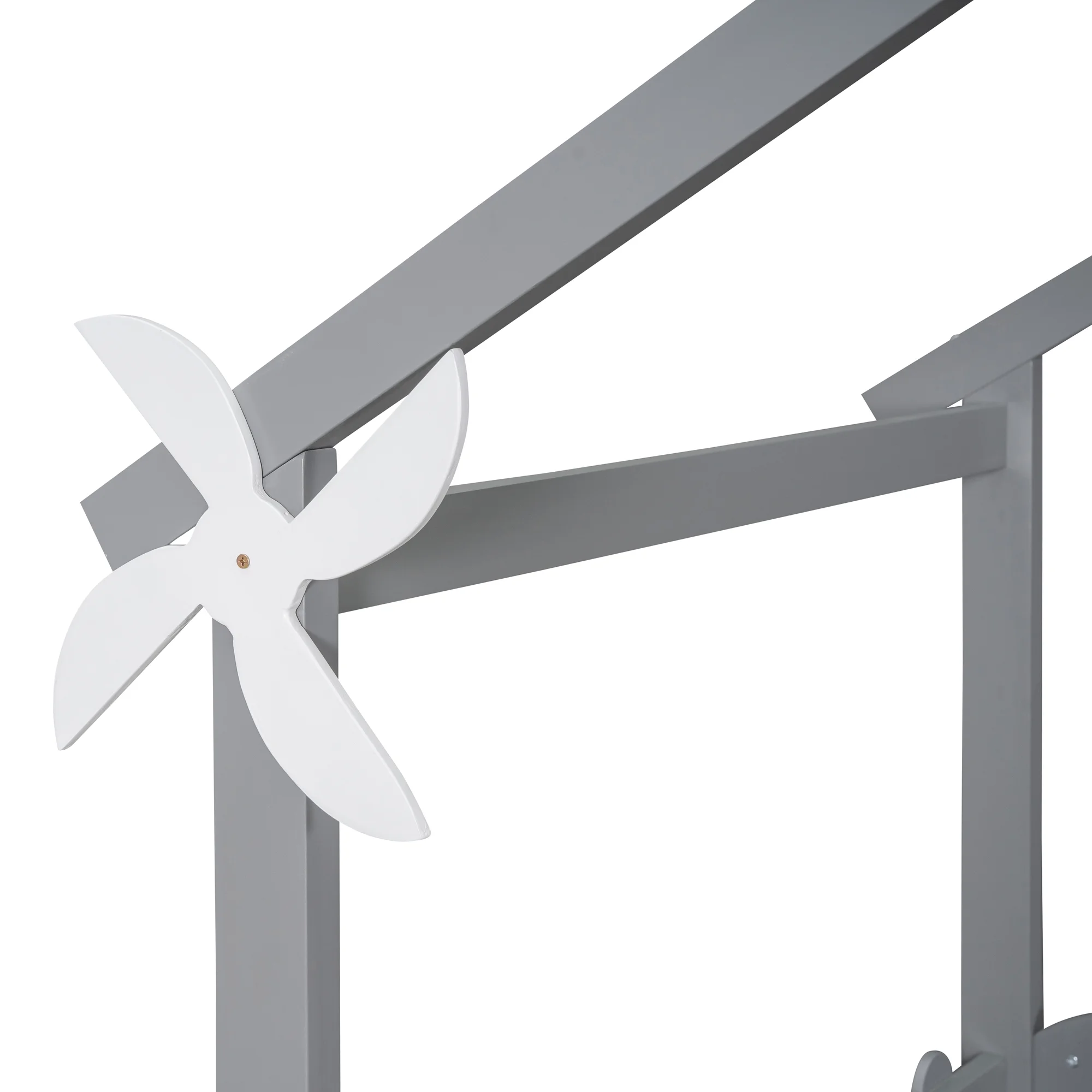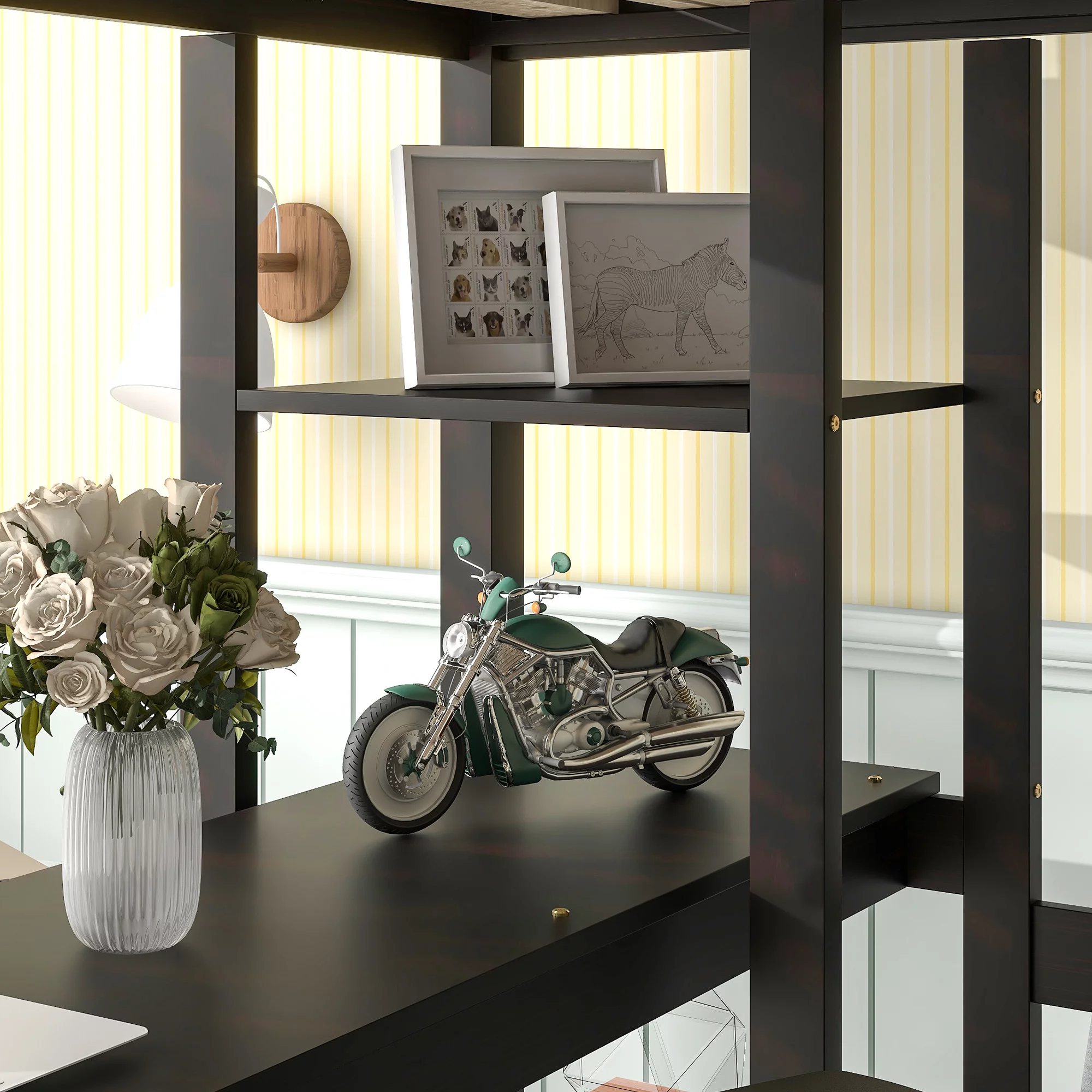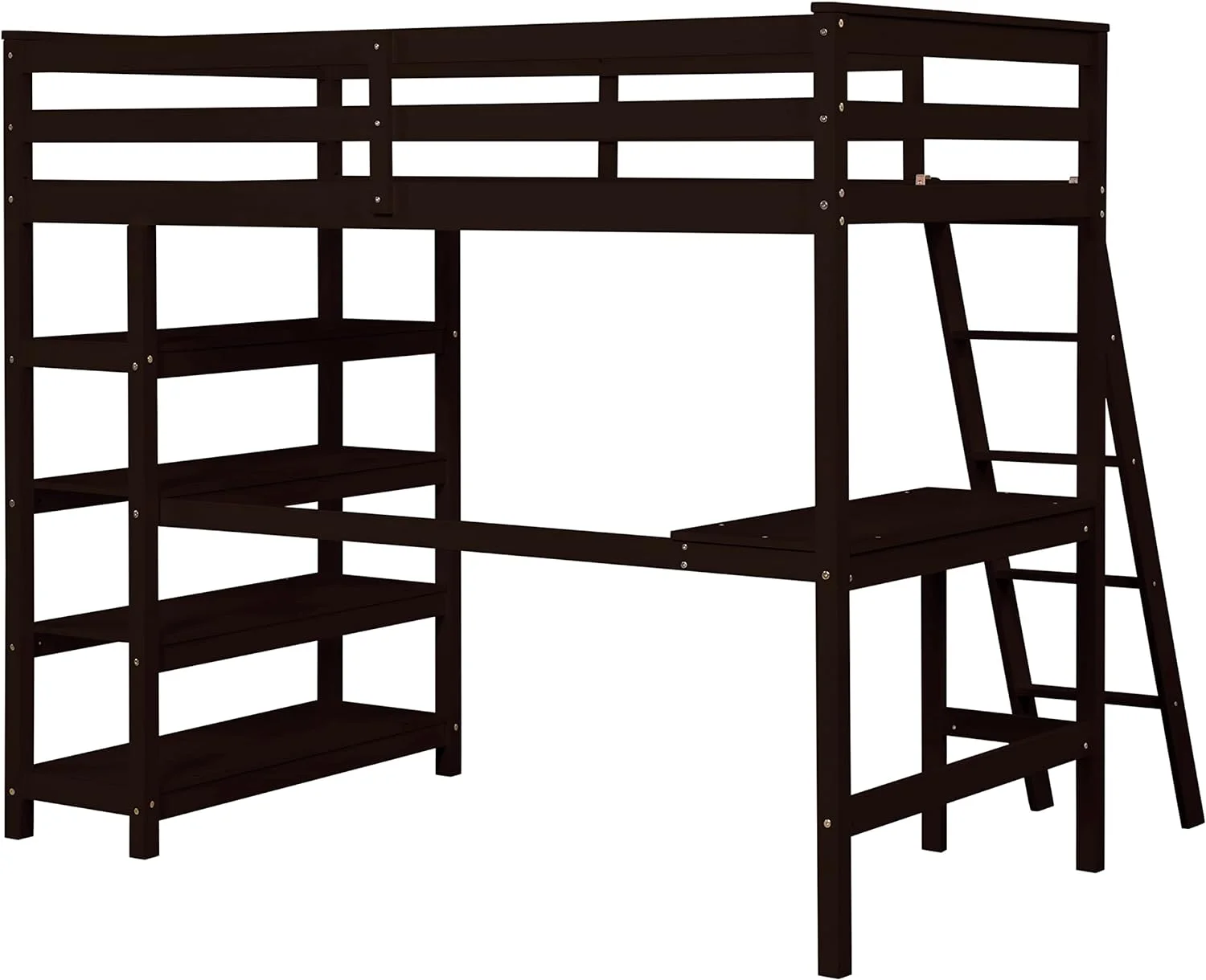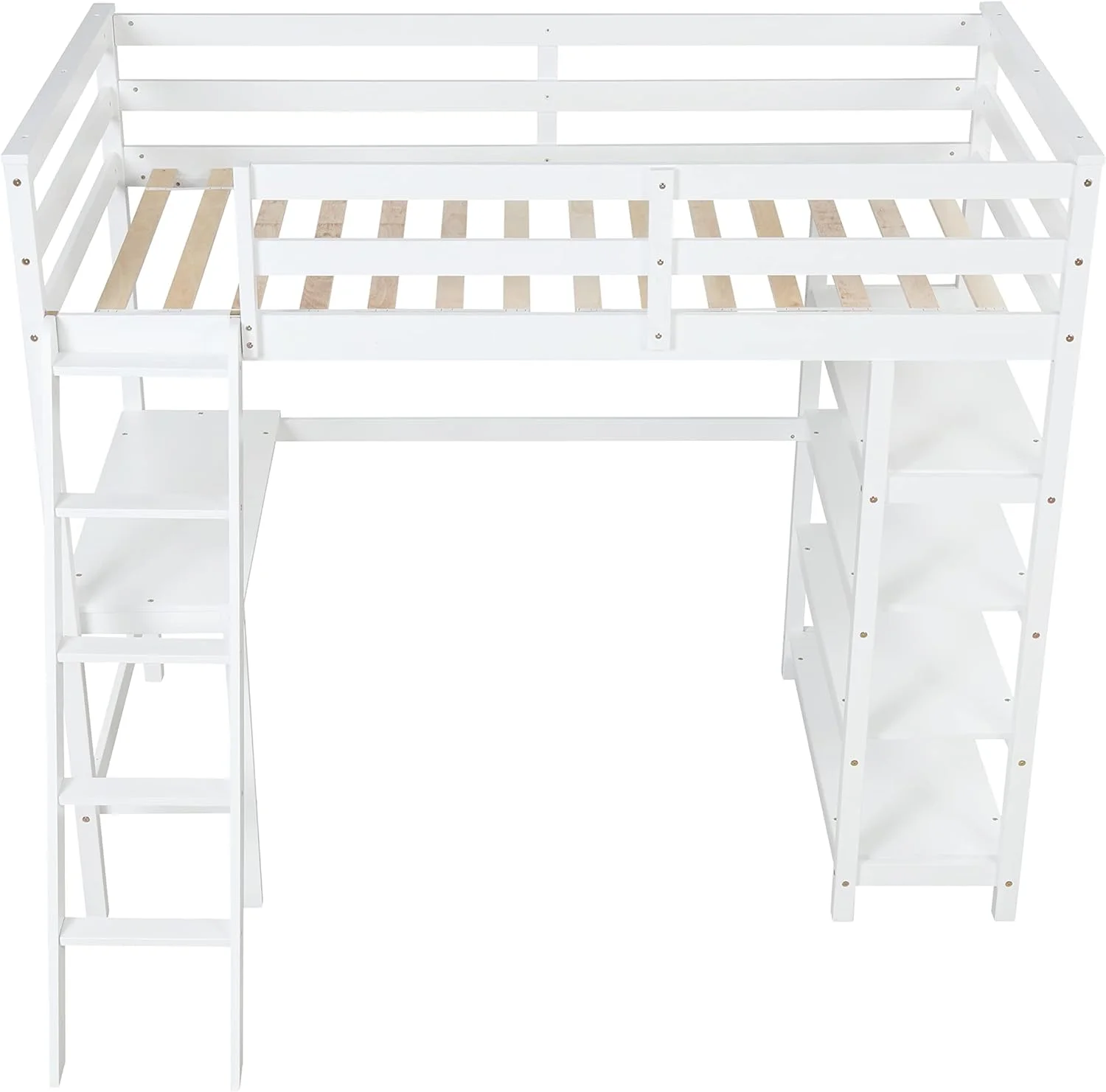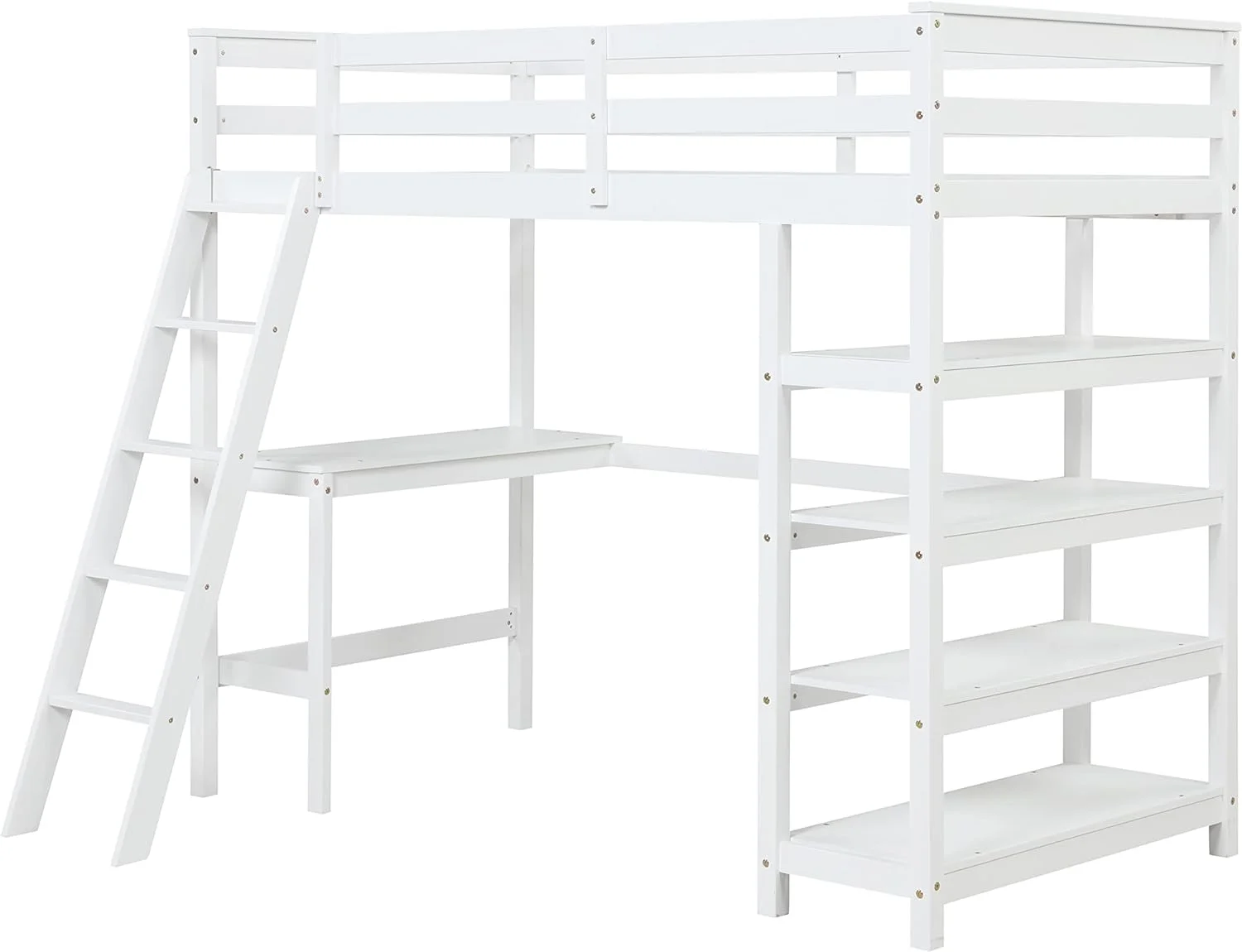 Full Size Loft Bed With Desk And Shelves, Wooden Loft Bed Frame For Kids Teens Adults (Gray)