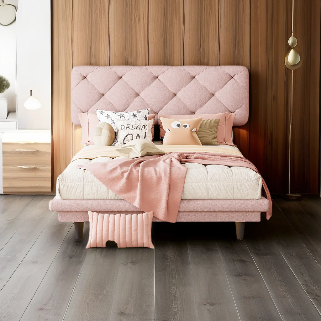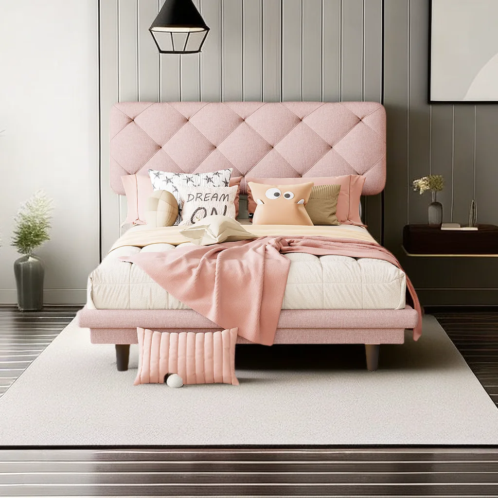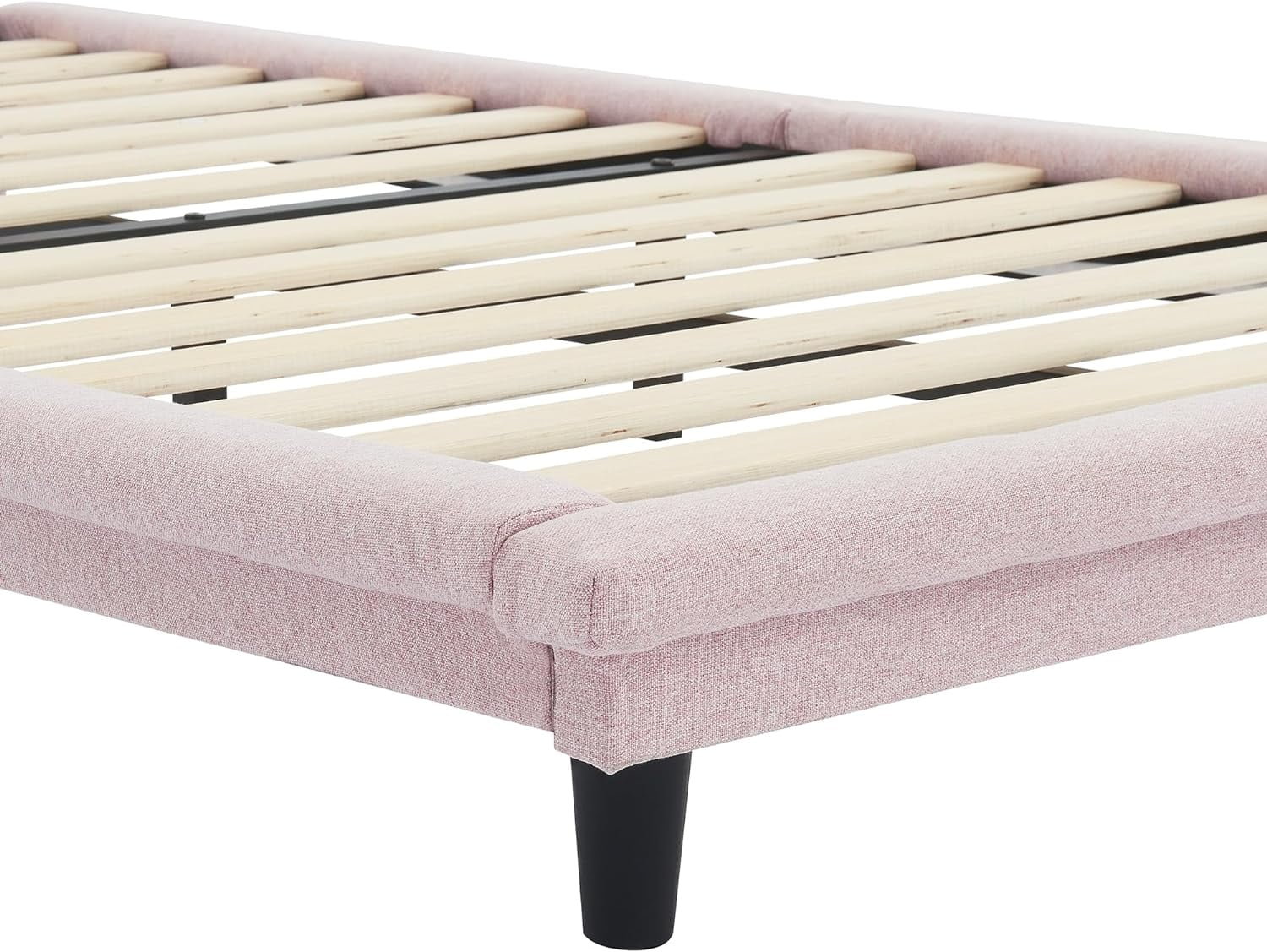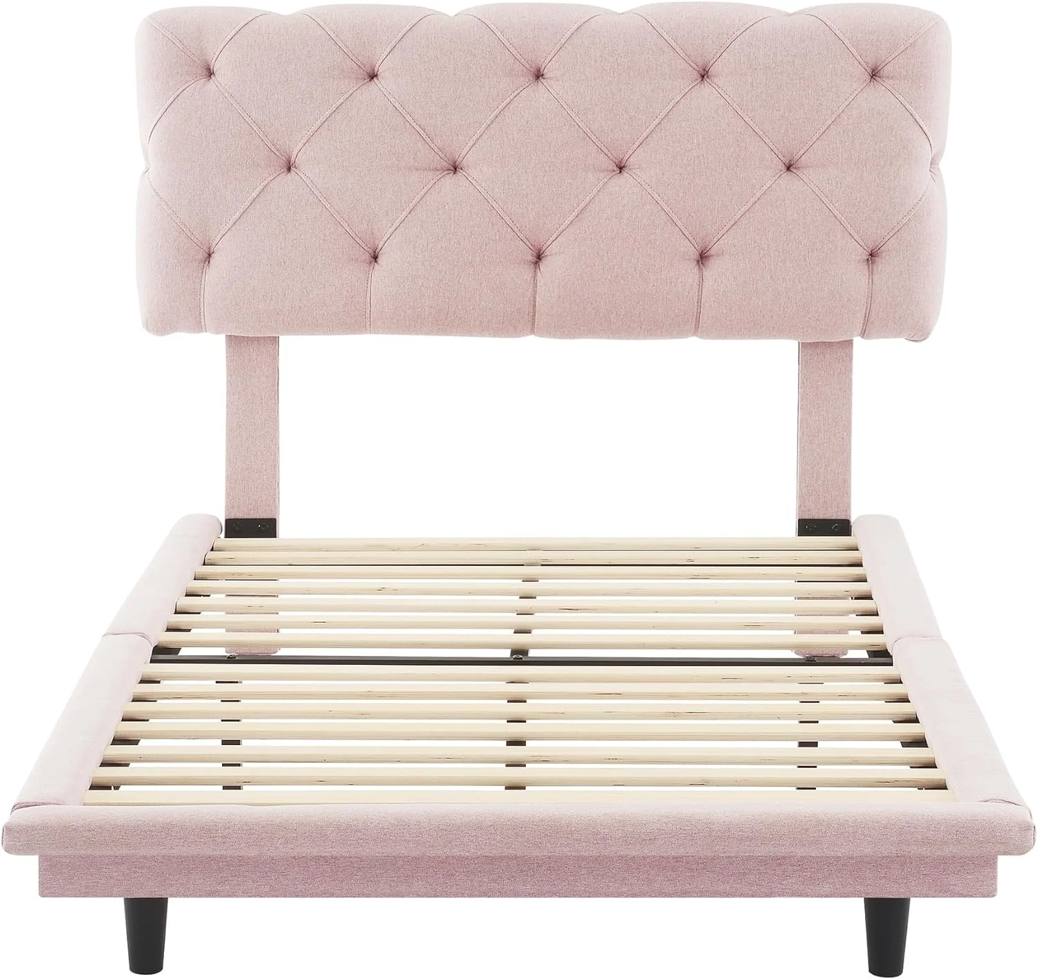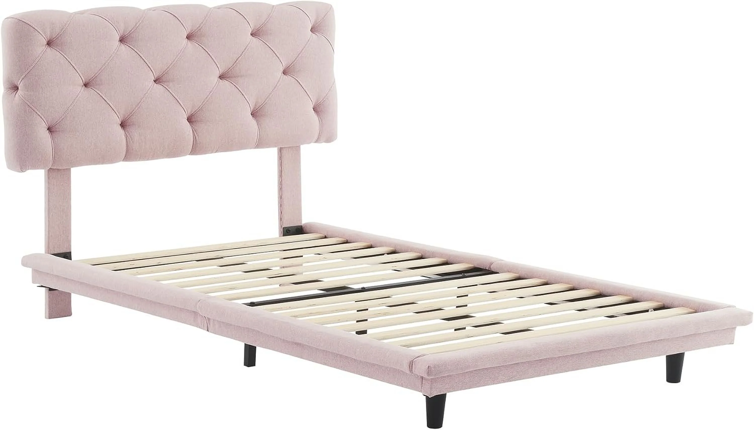 Twin Size Upholstered Bed with Light Stripe, Floating Platform Bed, Linen Fabric