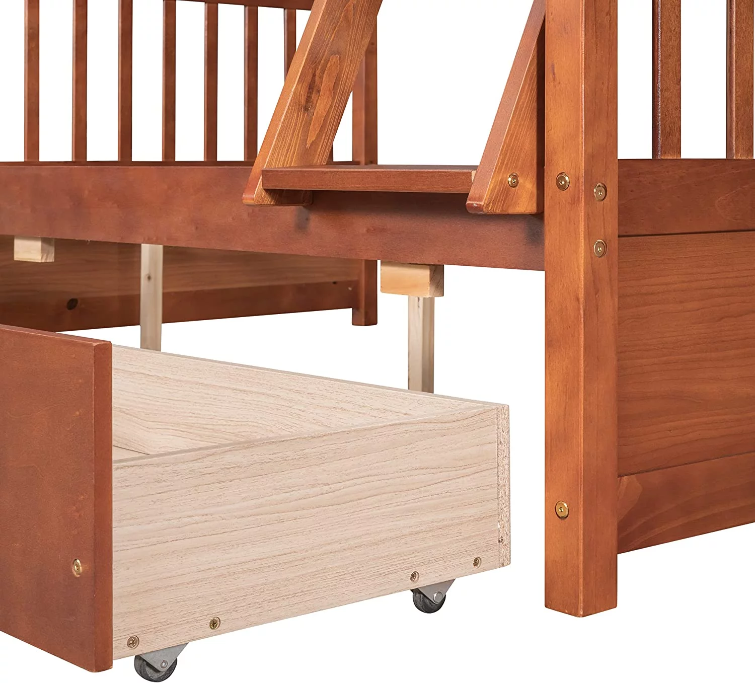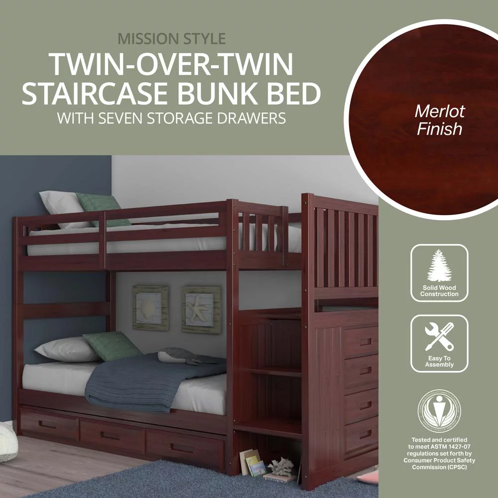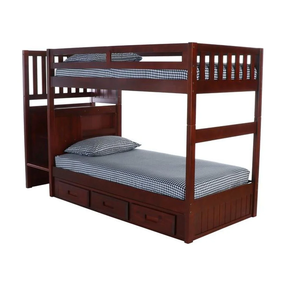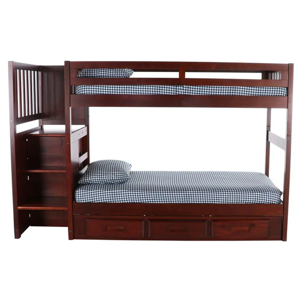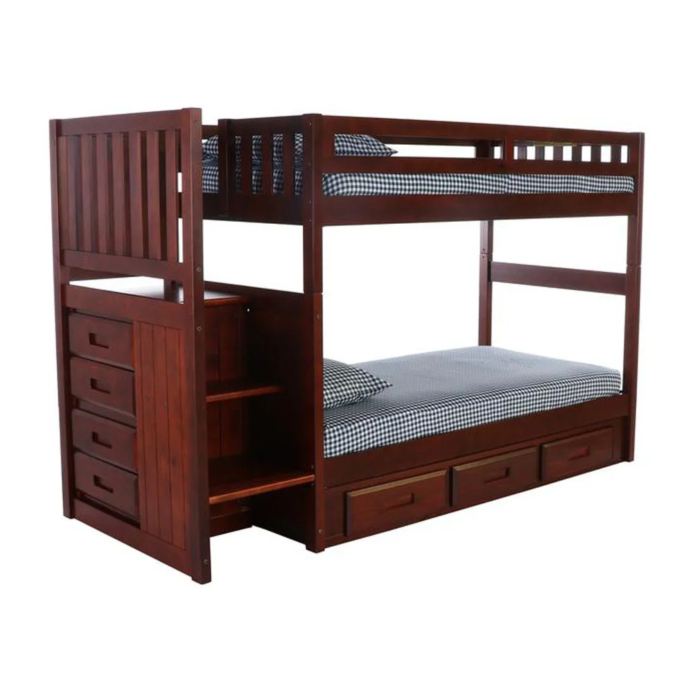 Solid Pine Staircase Twin over Twin Bunk Bed with Seven Drawers in Rich Merlot.