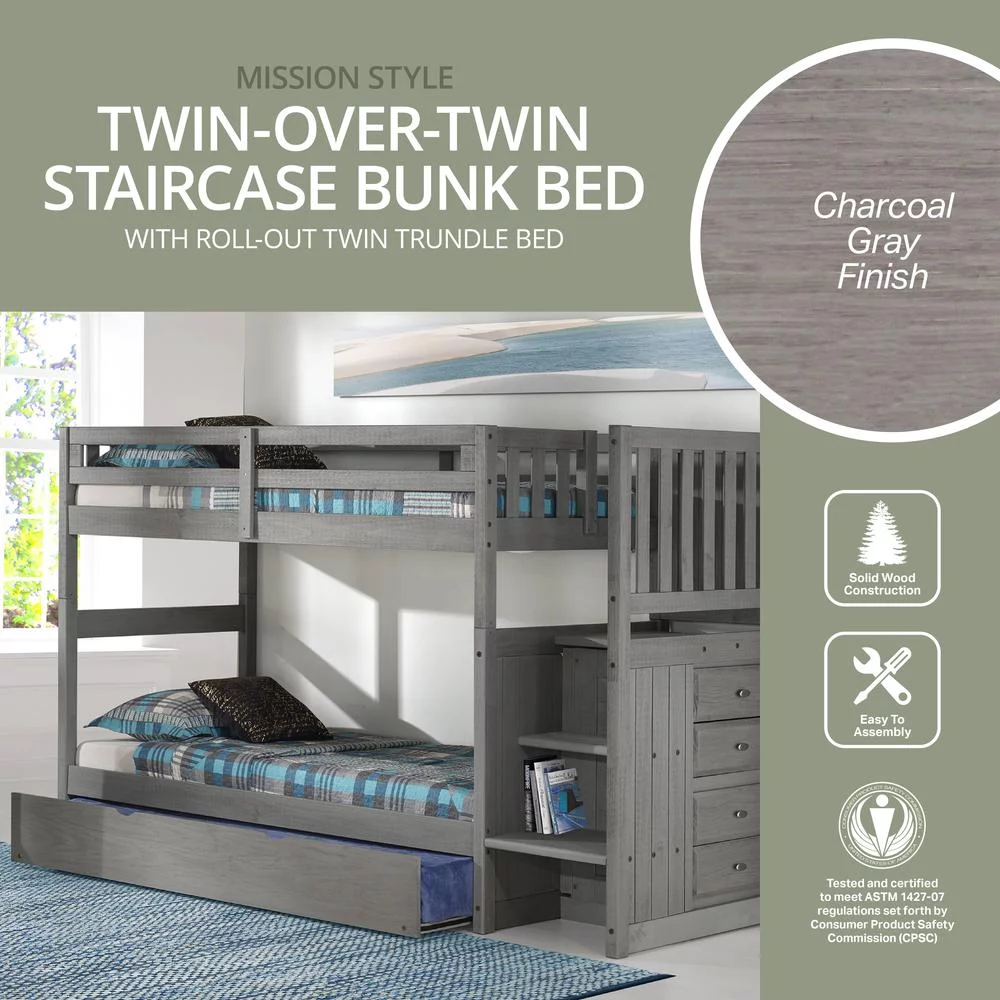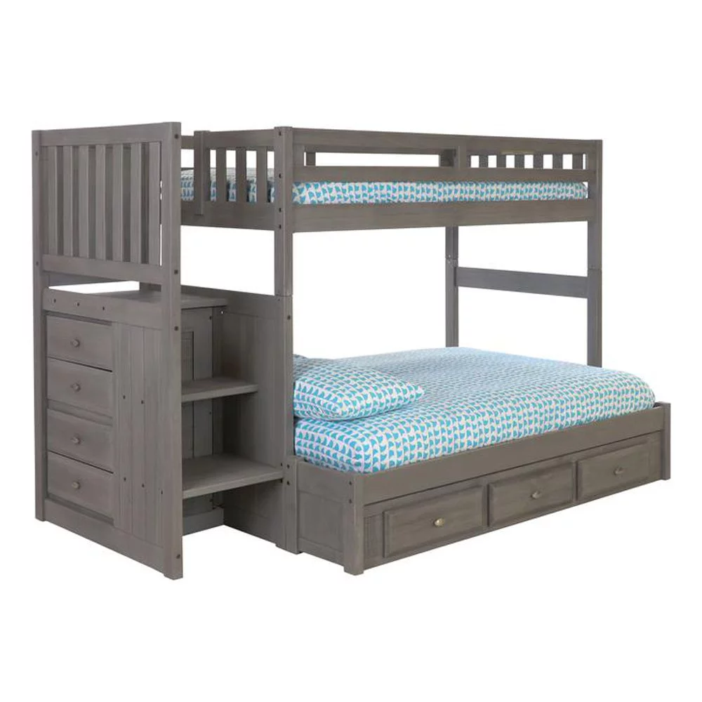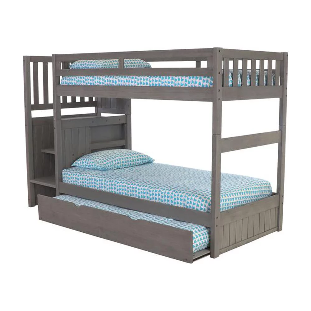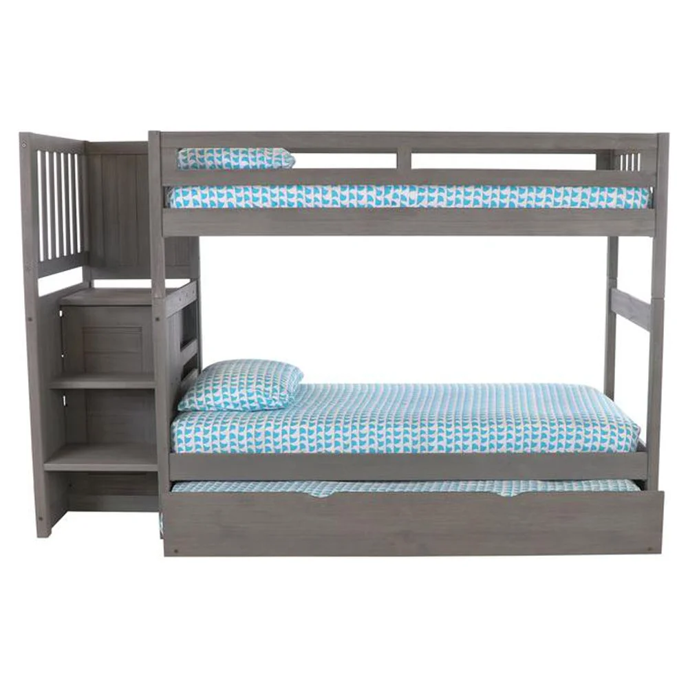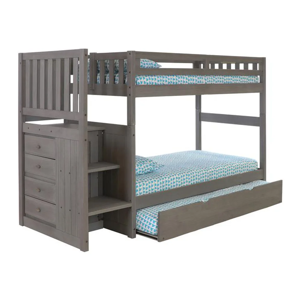 Solid Pine Staircase Twin over Twin Bunk Bed/Chest/Twin Trundle in Charcoal Gray