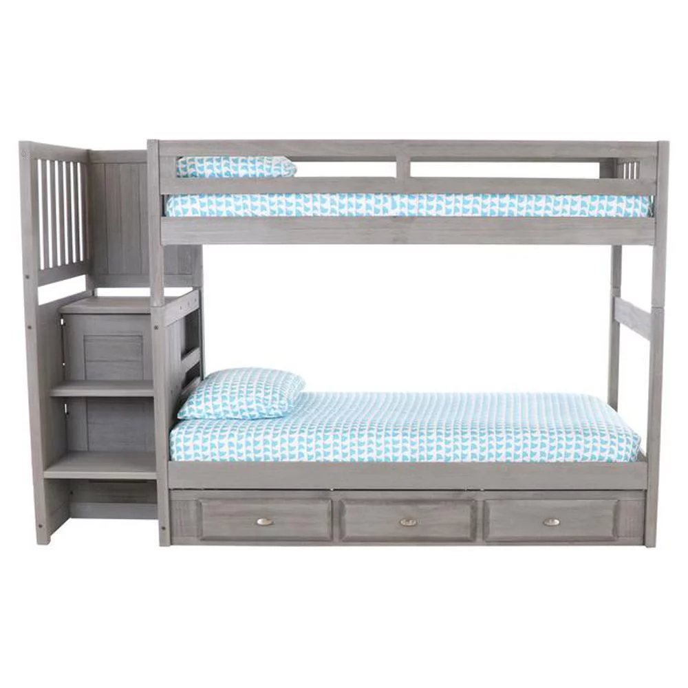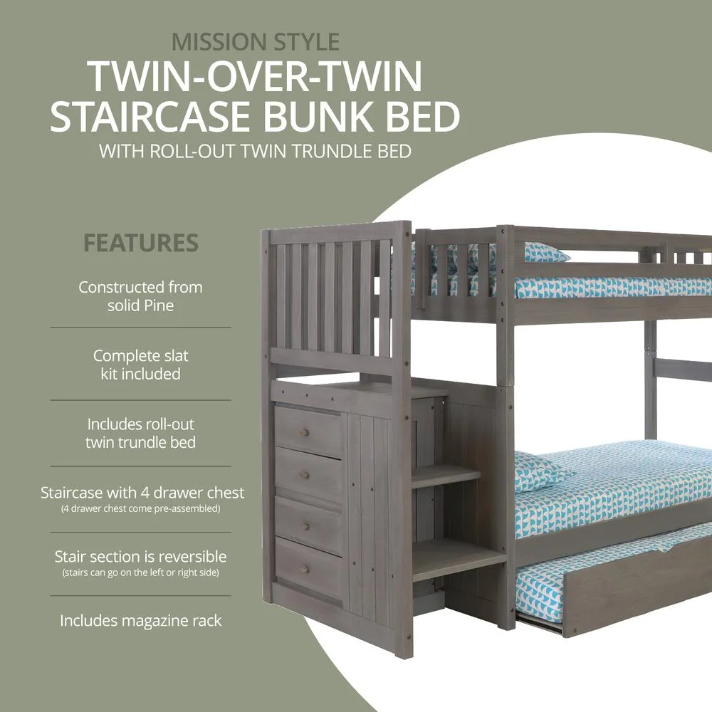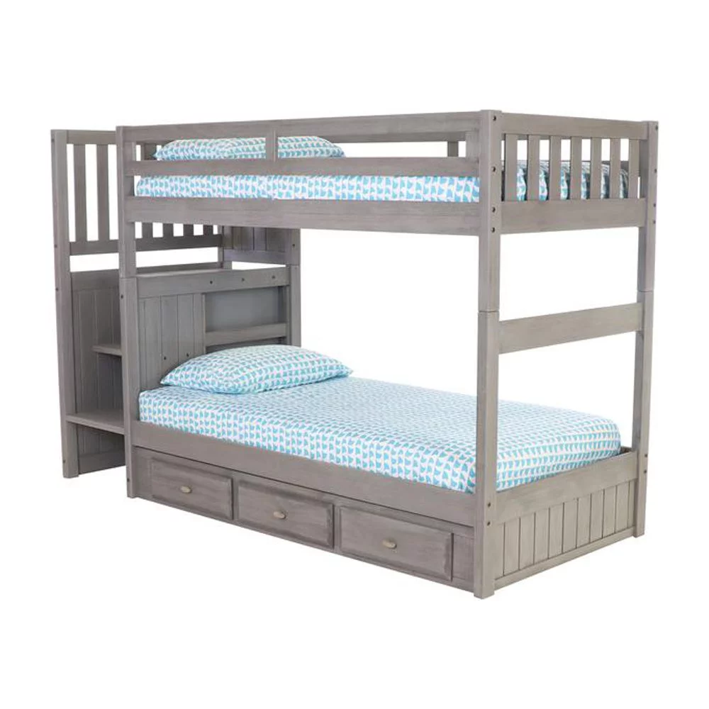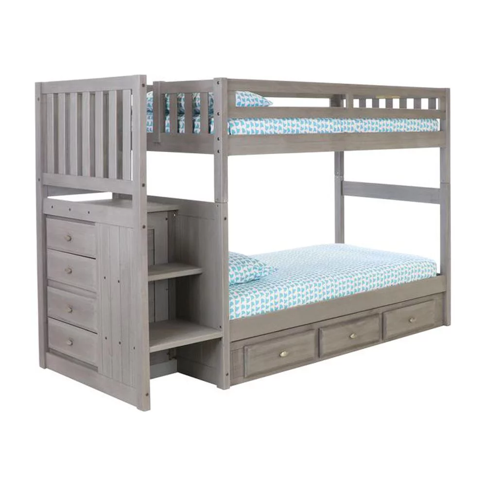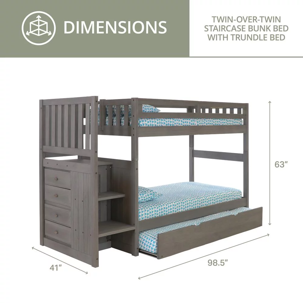Solid Pine Staircase Twin over Twin Bunk Bed/Chest/Twin Trundle in Charcoal Gray