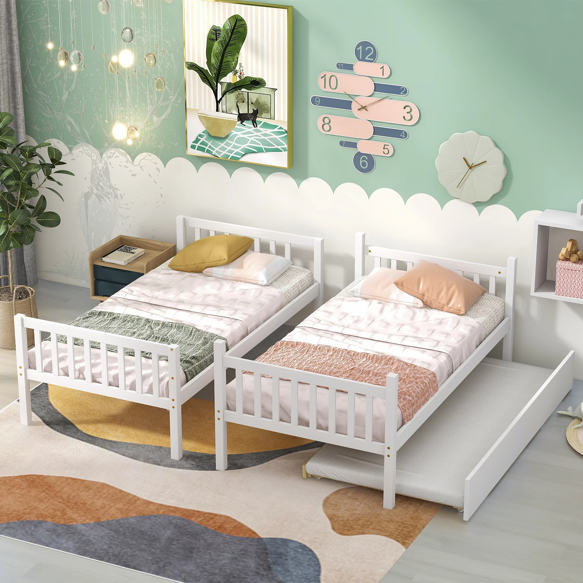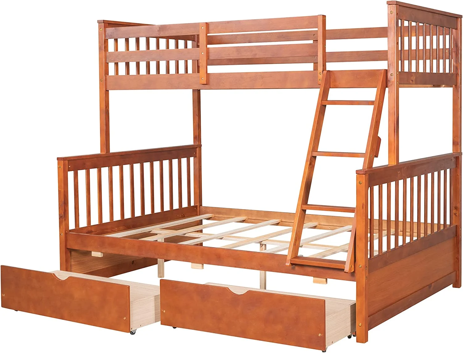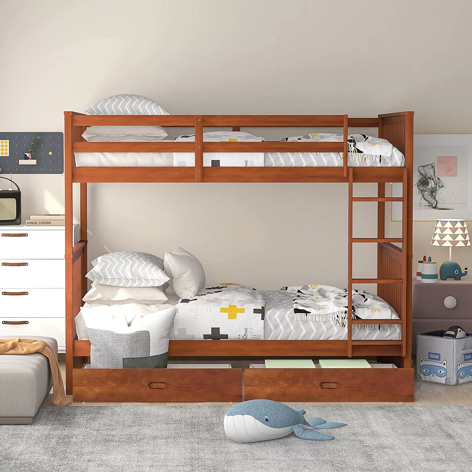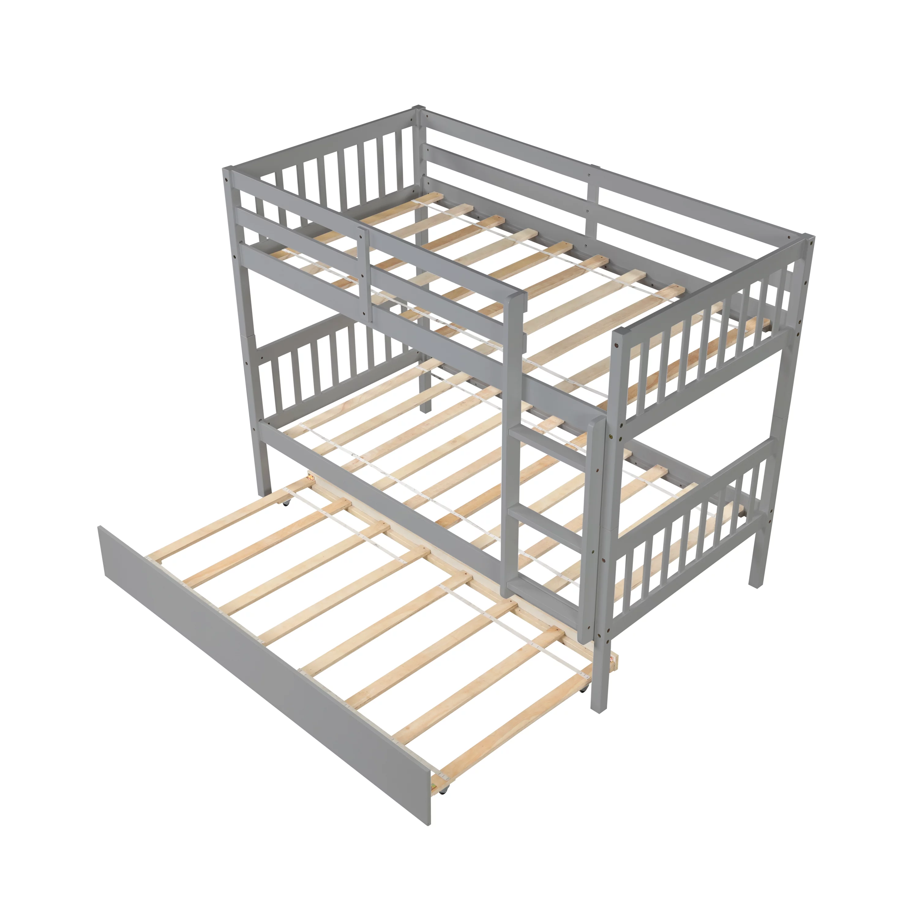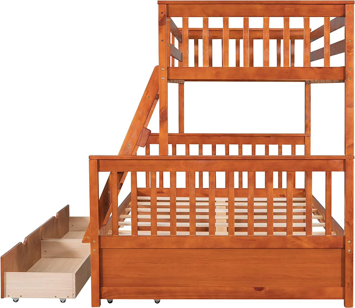 Twin Over Twin Bunk Bed with Trundle, Pine Wood Solid Wood Bunk Bed with Ladder and Storage, for Kids Teens Adults