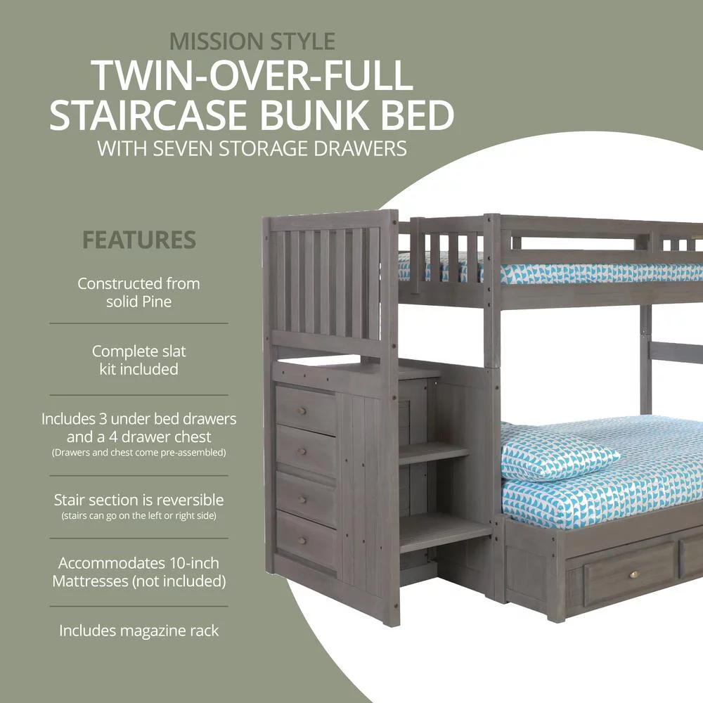 Solid Pine Staircase Twin over Full Bunk Bed with Seven Drawers in Charcoal Gray
