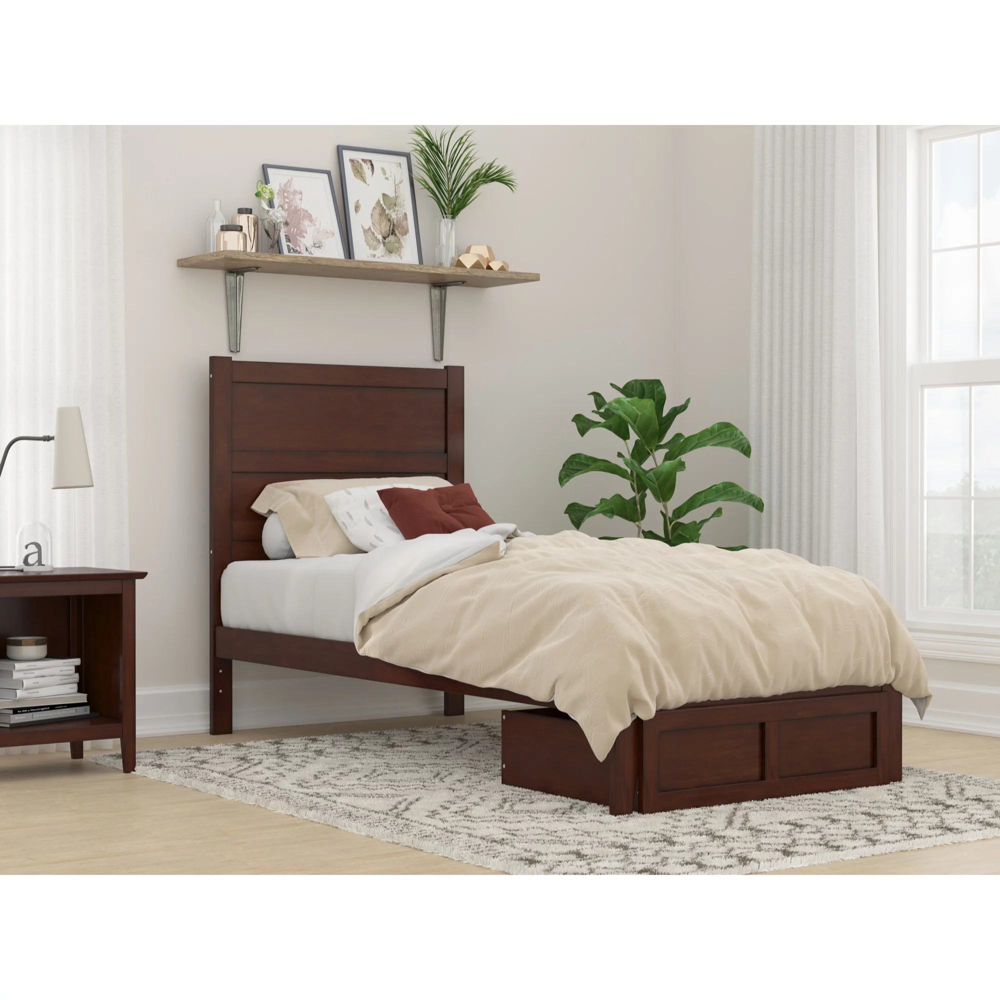 Richmond Twin XL Wood Platform Bed with Footboard and Drawers in Light Toffee