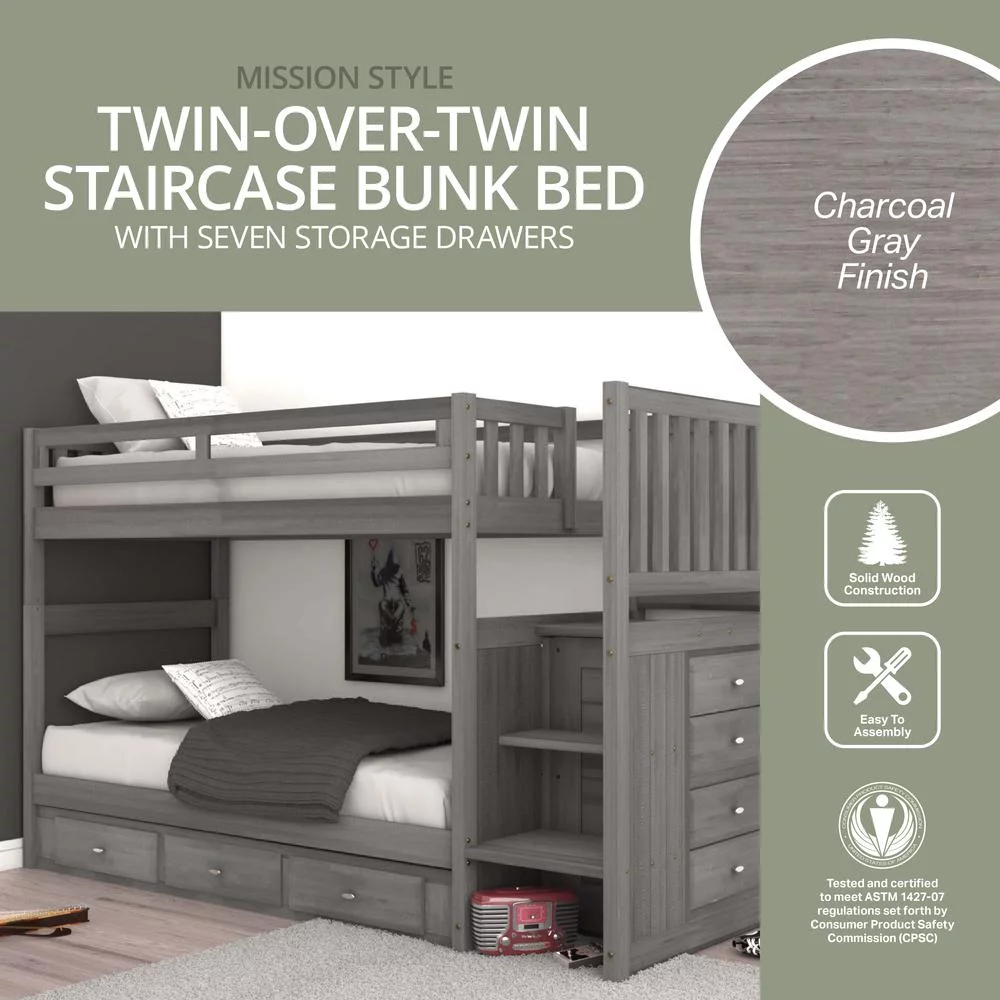 Solid Pine Staircase Twin over Twin Bunk Bed with Seven Drawers in Charcoal Gray