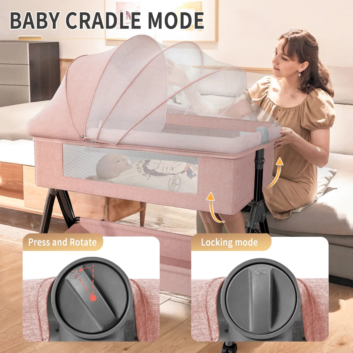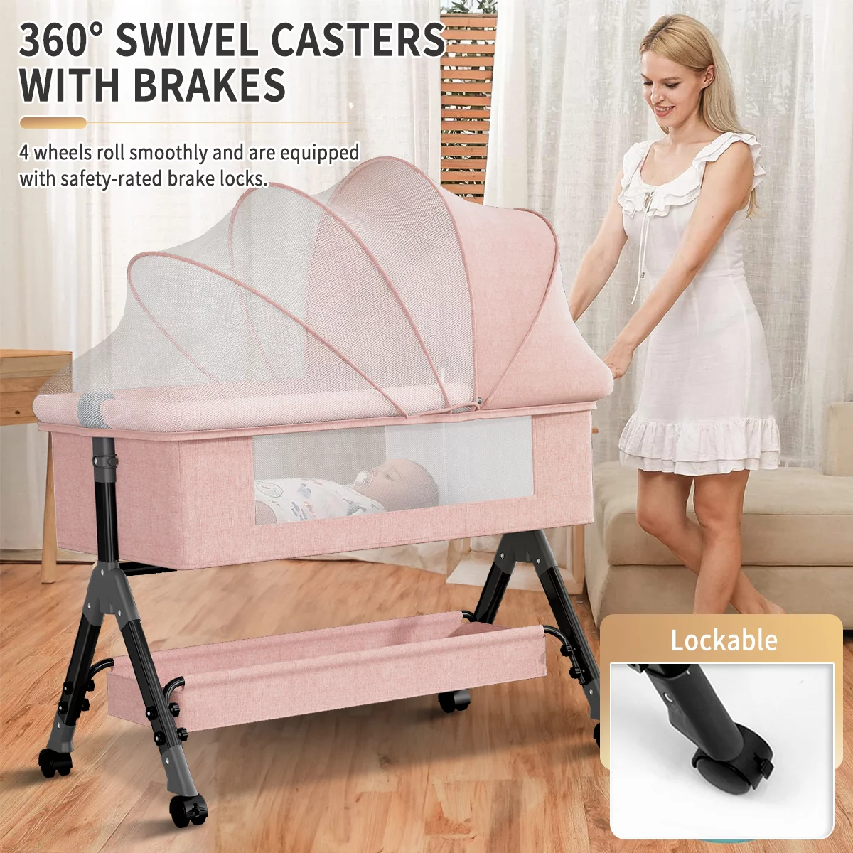 Baby Bassinet, Adjustable Baby Bedside Sleeper Bassinet with 360°Wheel, Baby Cradle for Infant,0-2 Months,Pink
