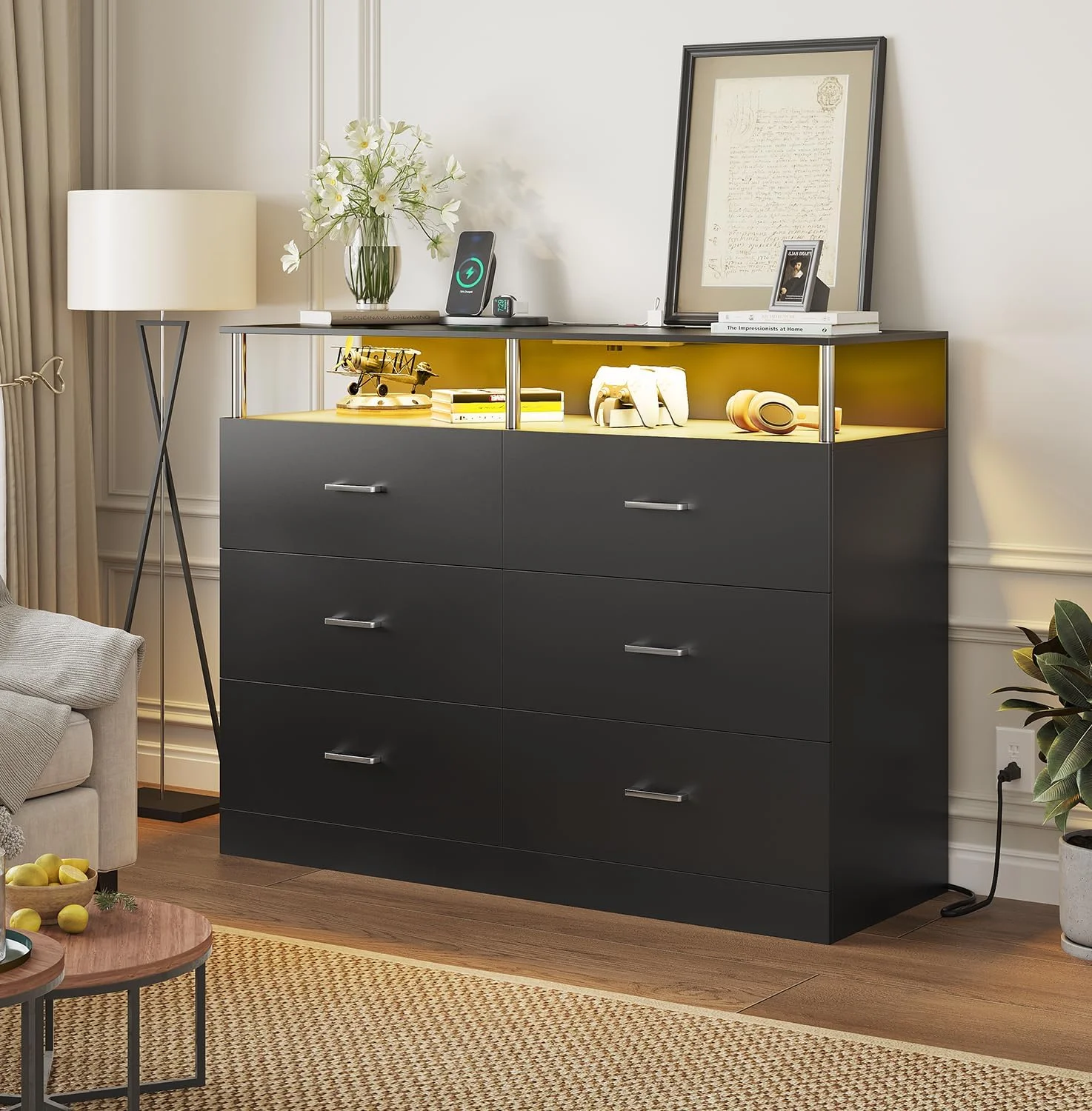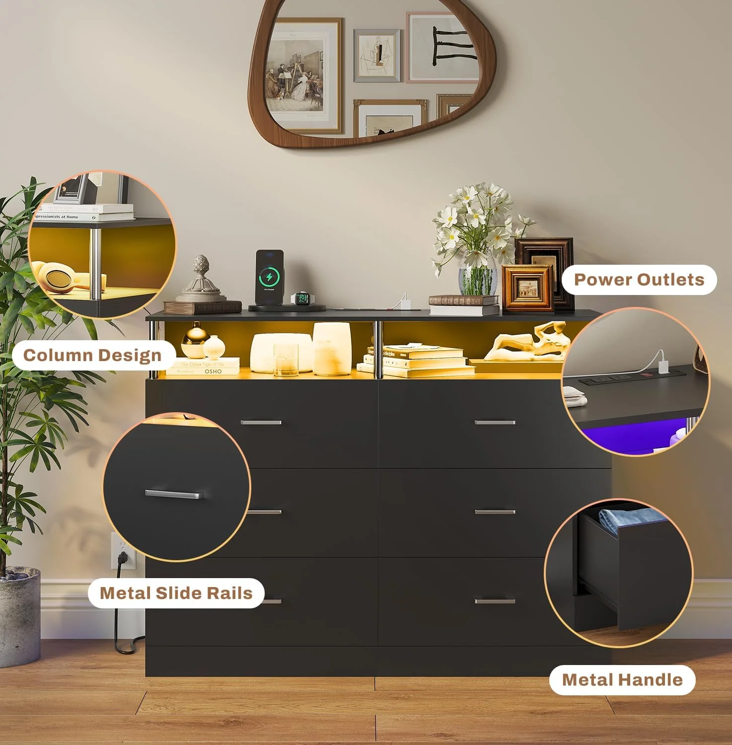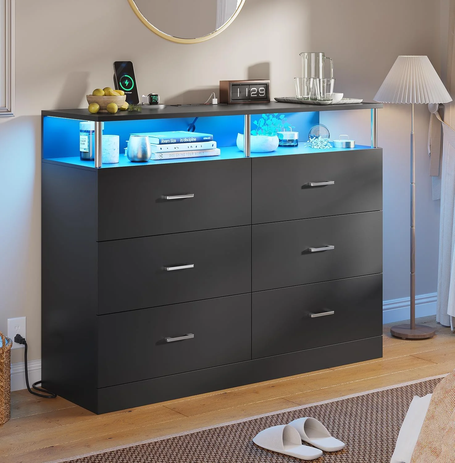 Bowery Hill 9 Drawers Contemporary Wood LED Dresser and Mirror in Black