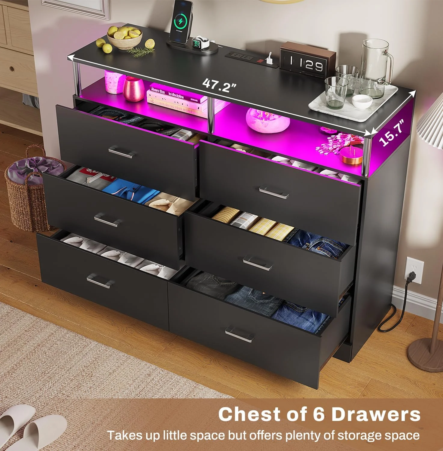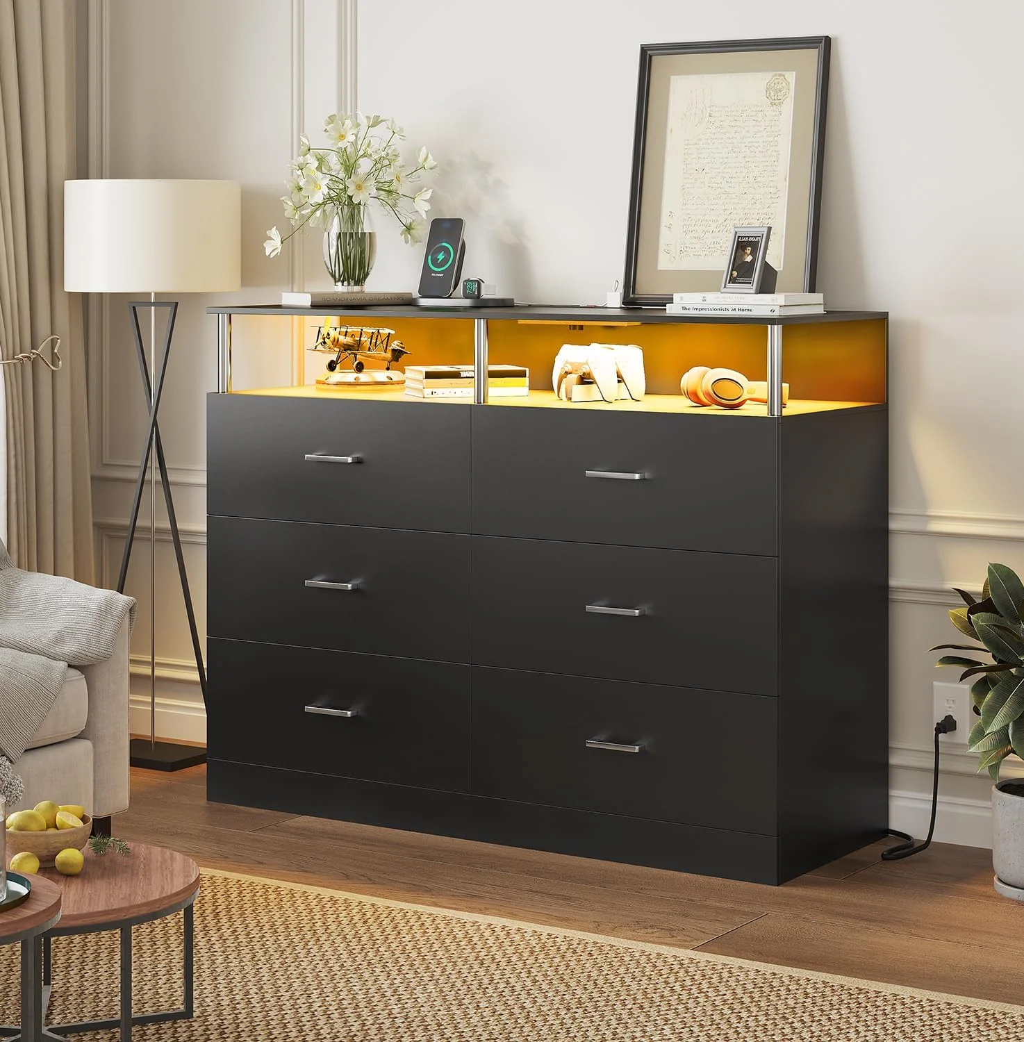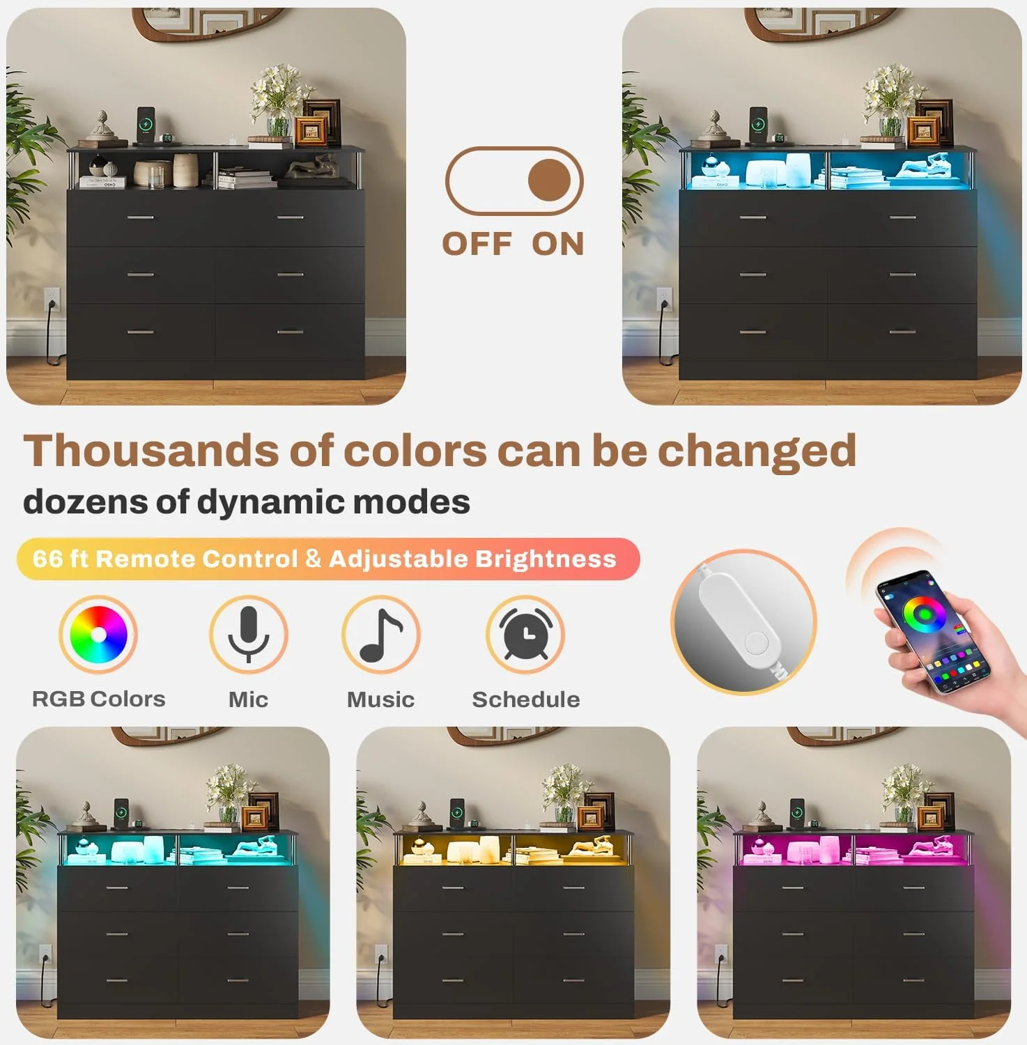 Bowery Hill 9 Drawers Contemporary Wood LED Dresser and Mirror in Black