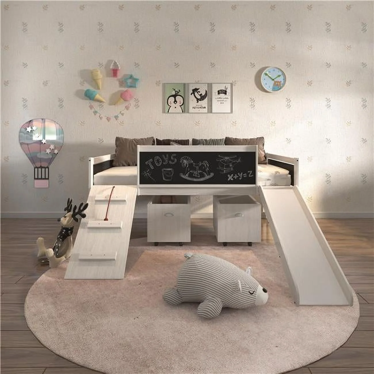 Pivot Direct PD-3005TLE-3005C Junior Twin Size Low Loft with Slide, Chalkboard & Toy Boxes in White Wash & Espresso