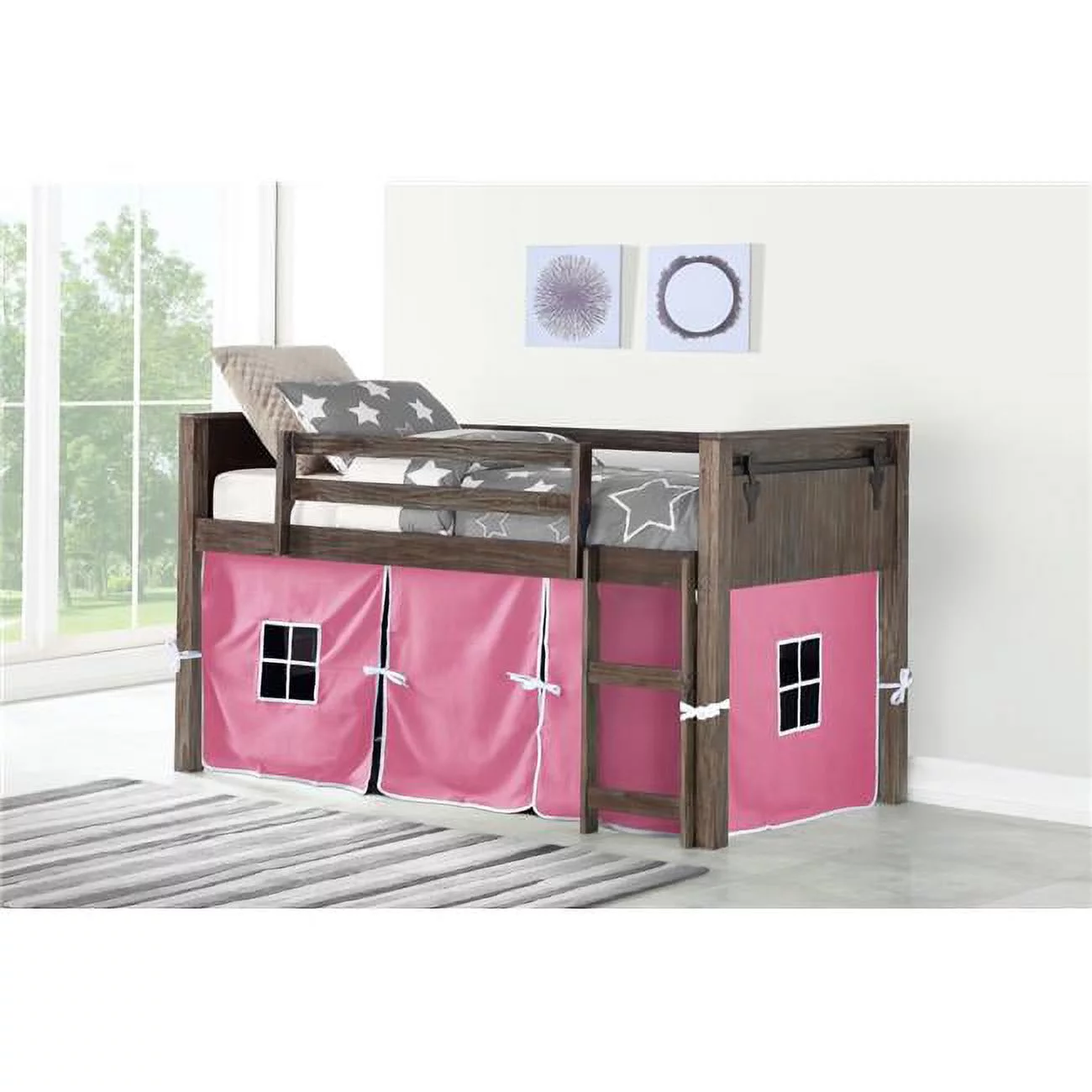 Donco Kids PD-0318TBS-P Twin Barn Door Low Loft, Brushed Shadow with Pink Tent
