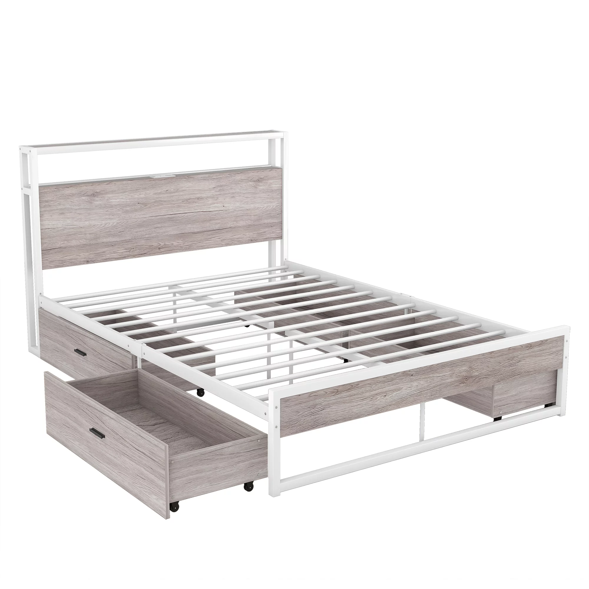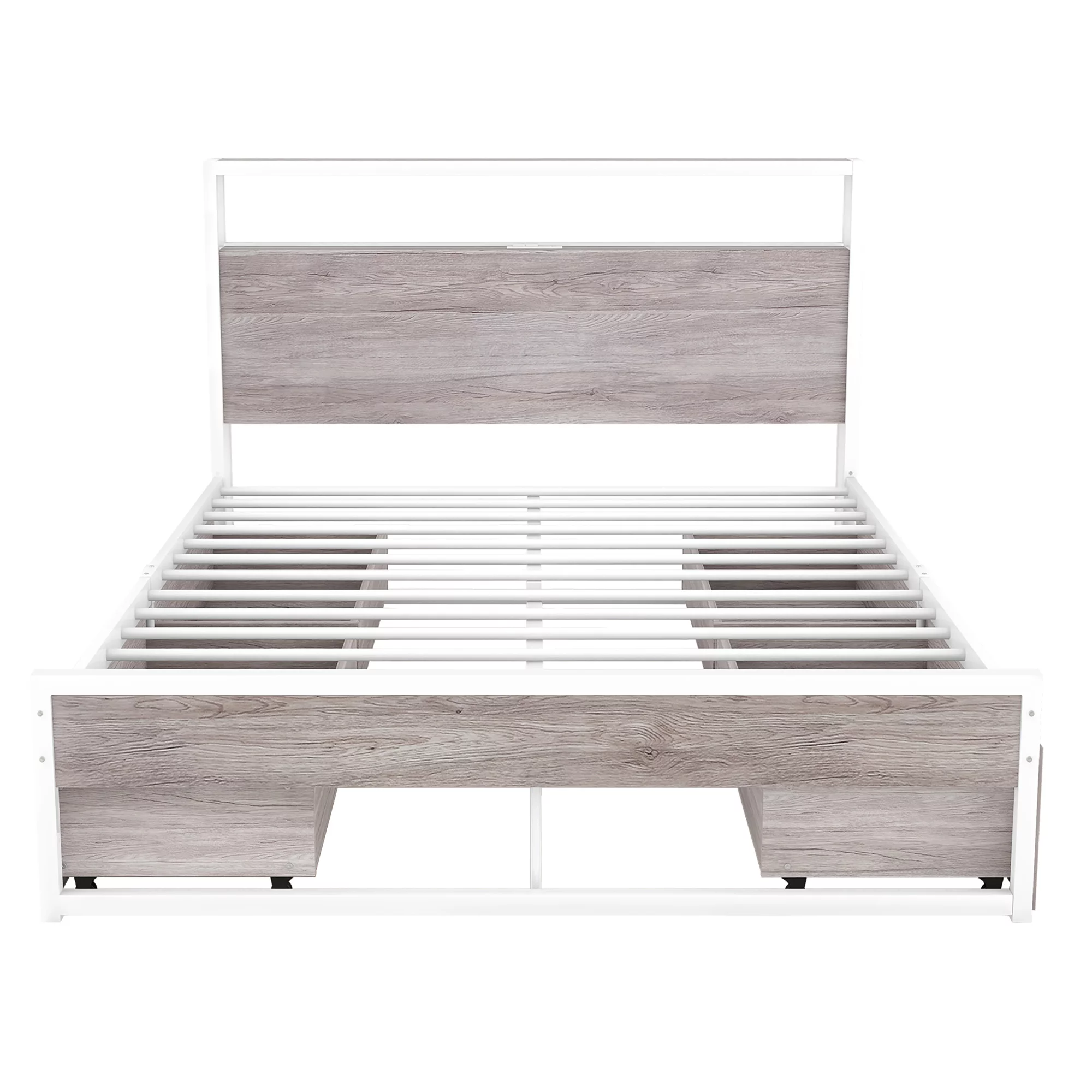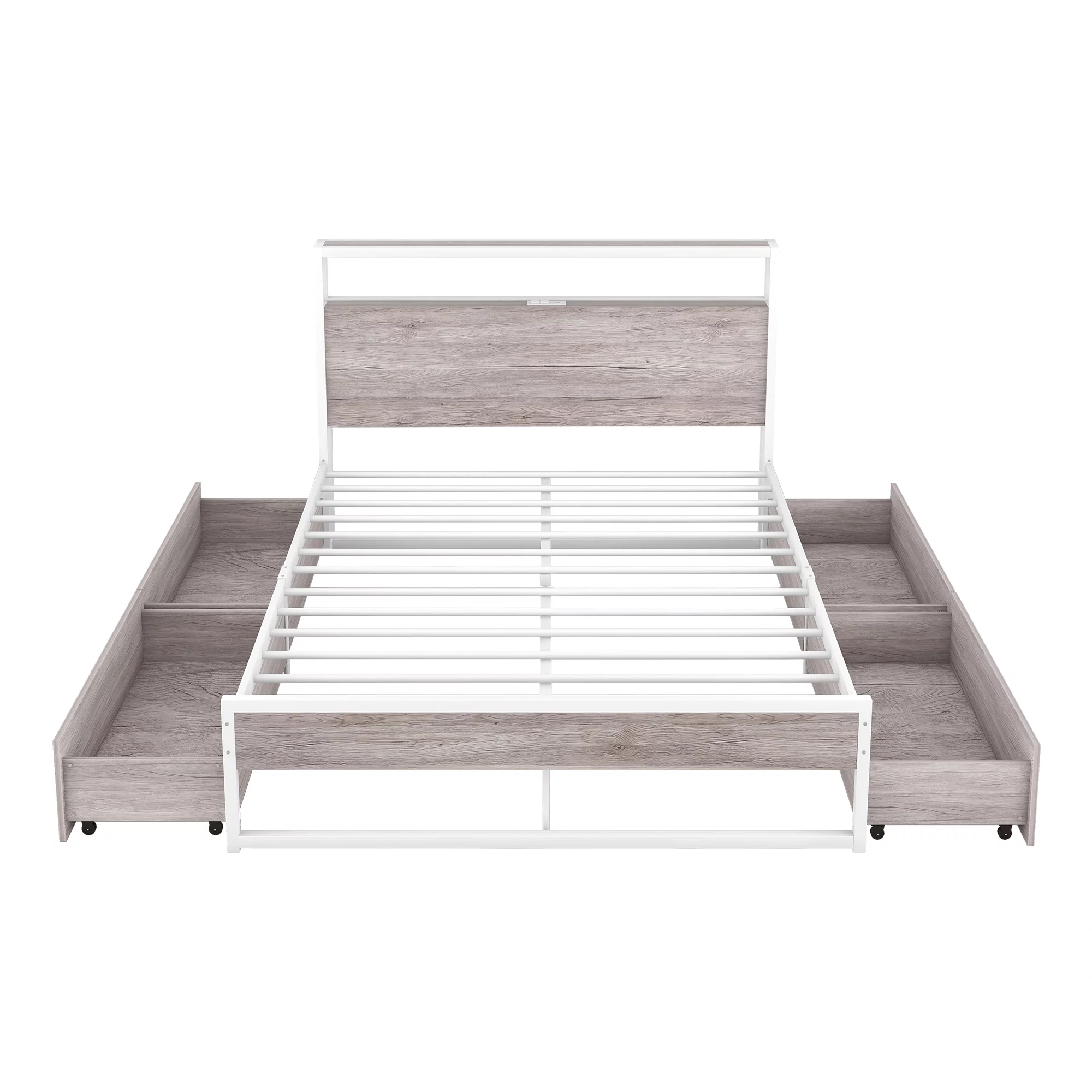 Churanty Full Size Metal Platform Bed with Headboard and Storage 4 Drawers Sockets USB Ports,White