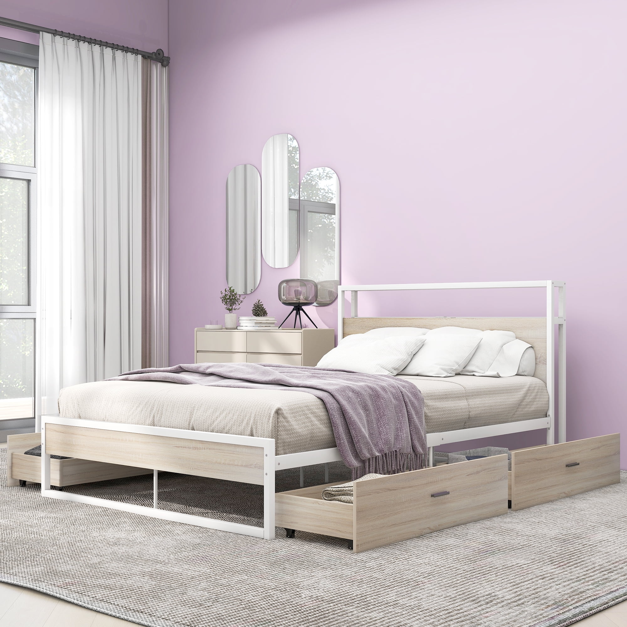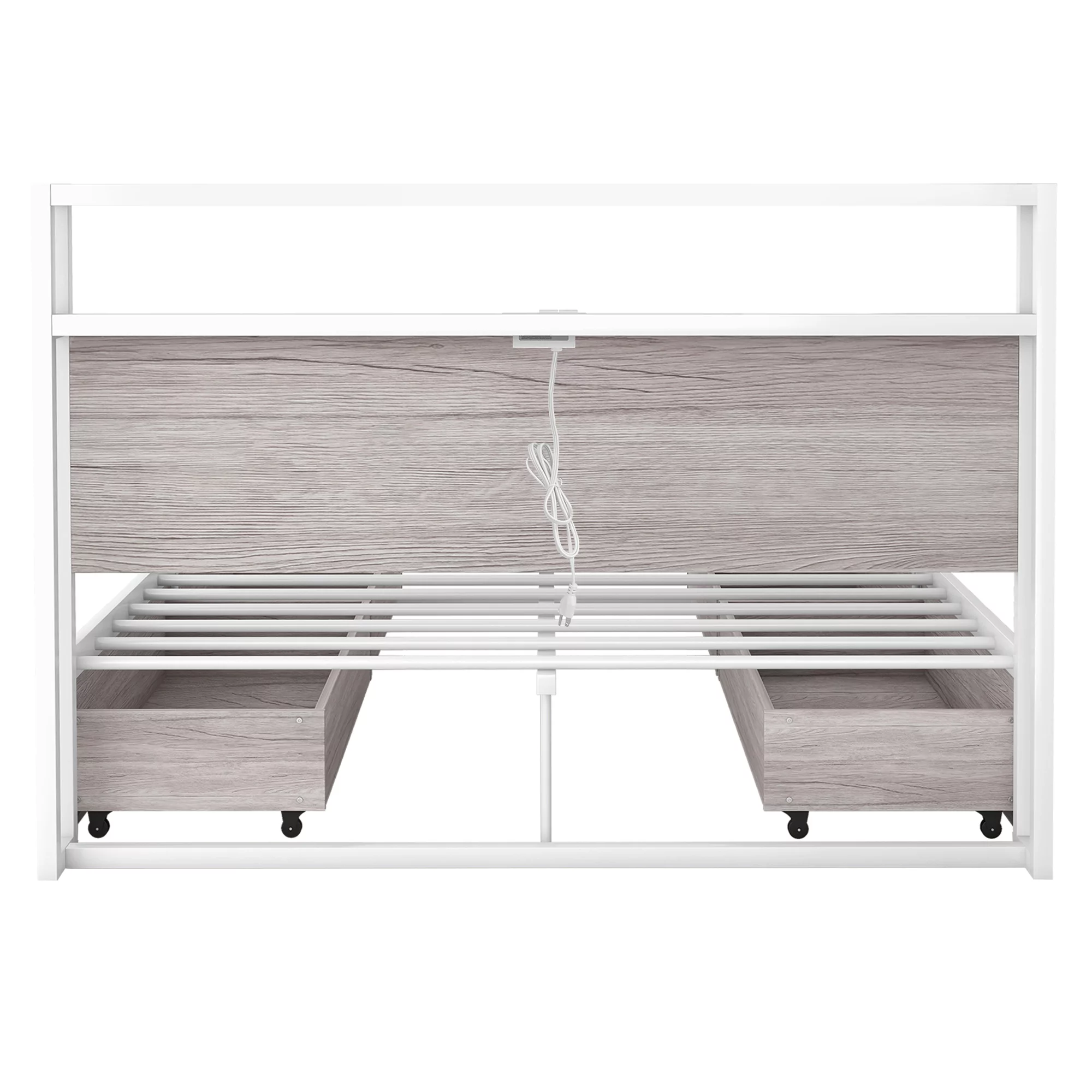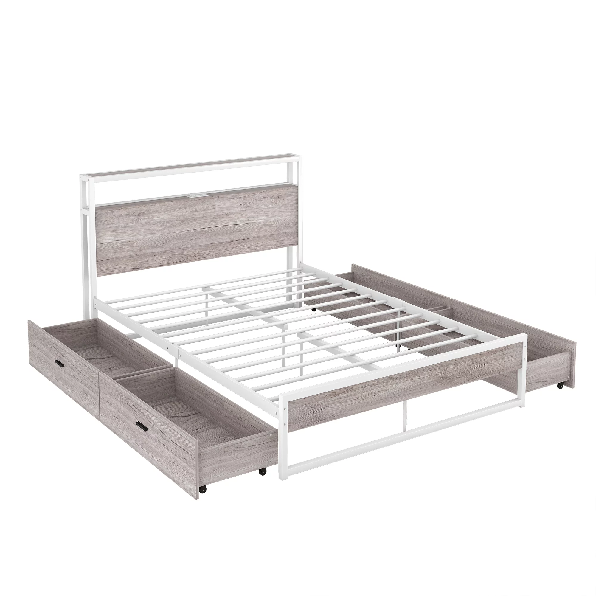 Churanty Full Size Metal Platform Bed with Headboard and Storage 4 Drawers Sockets USB Ports,White