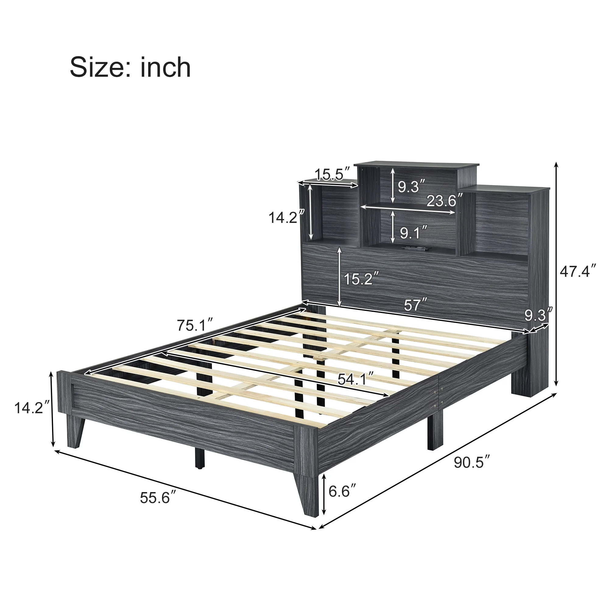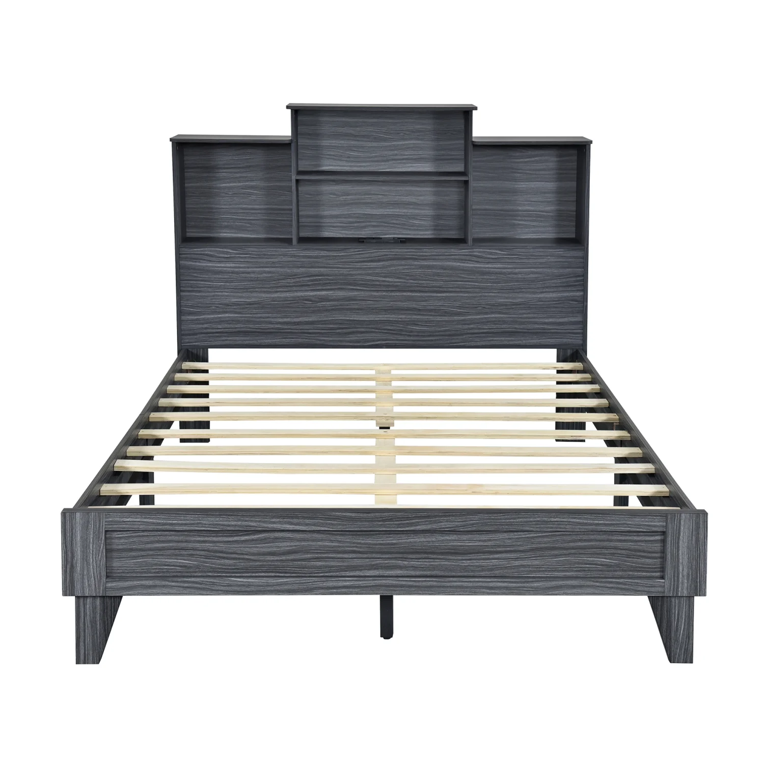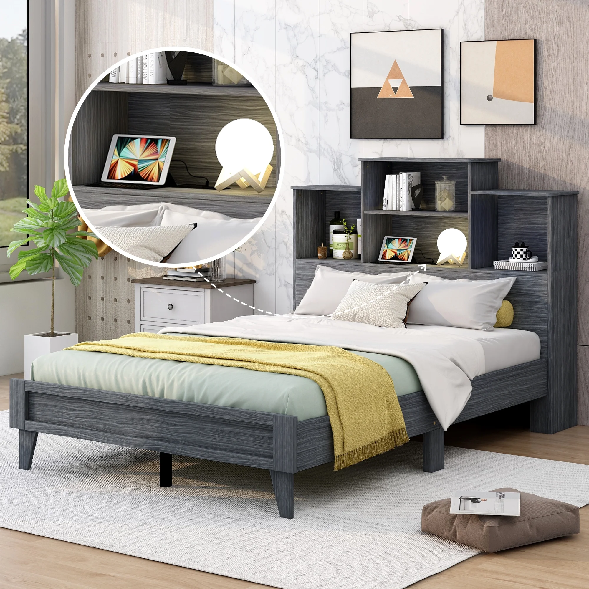 Churanty Full Size Platform Bed with Storage Headboard and USB Charging,Wood Platform Bed with 4 Open Shelves,Gray