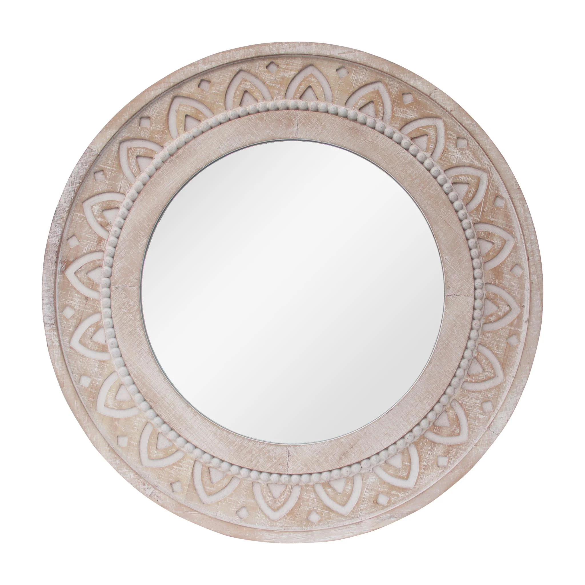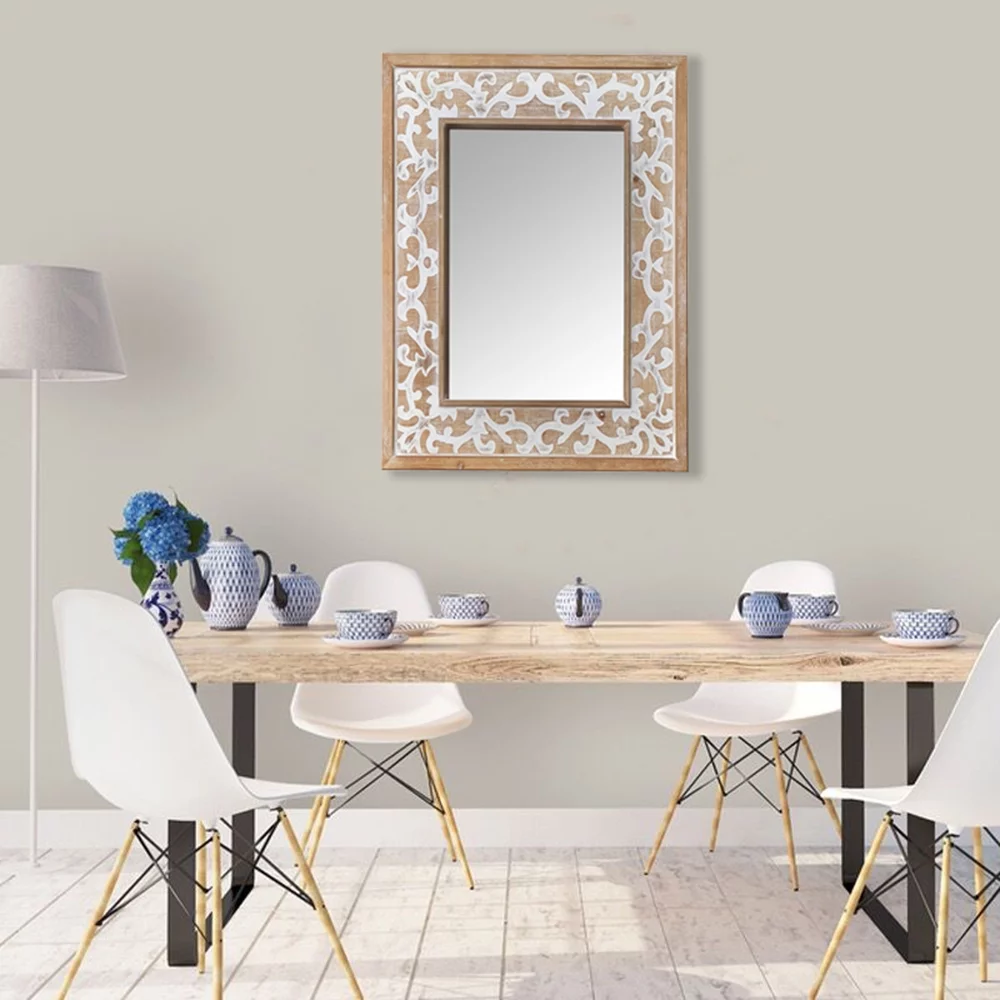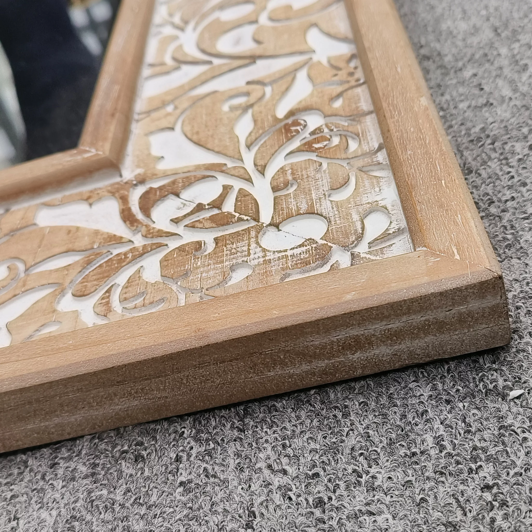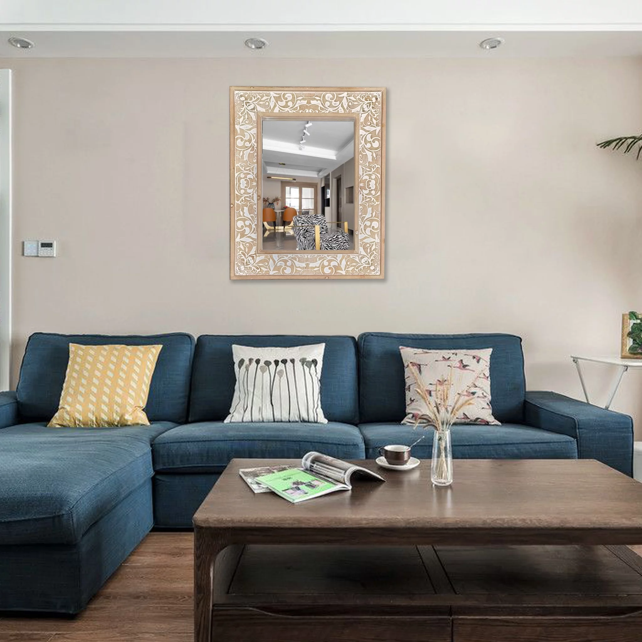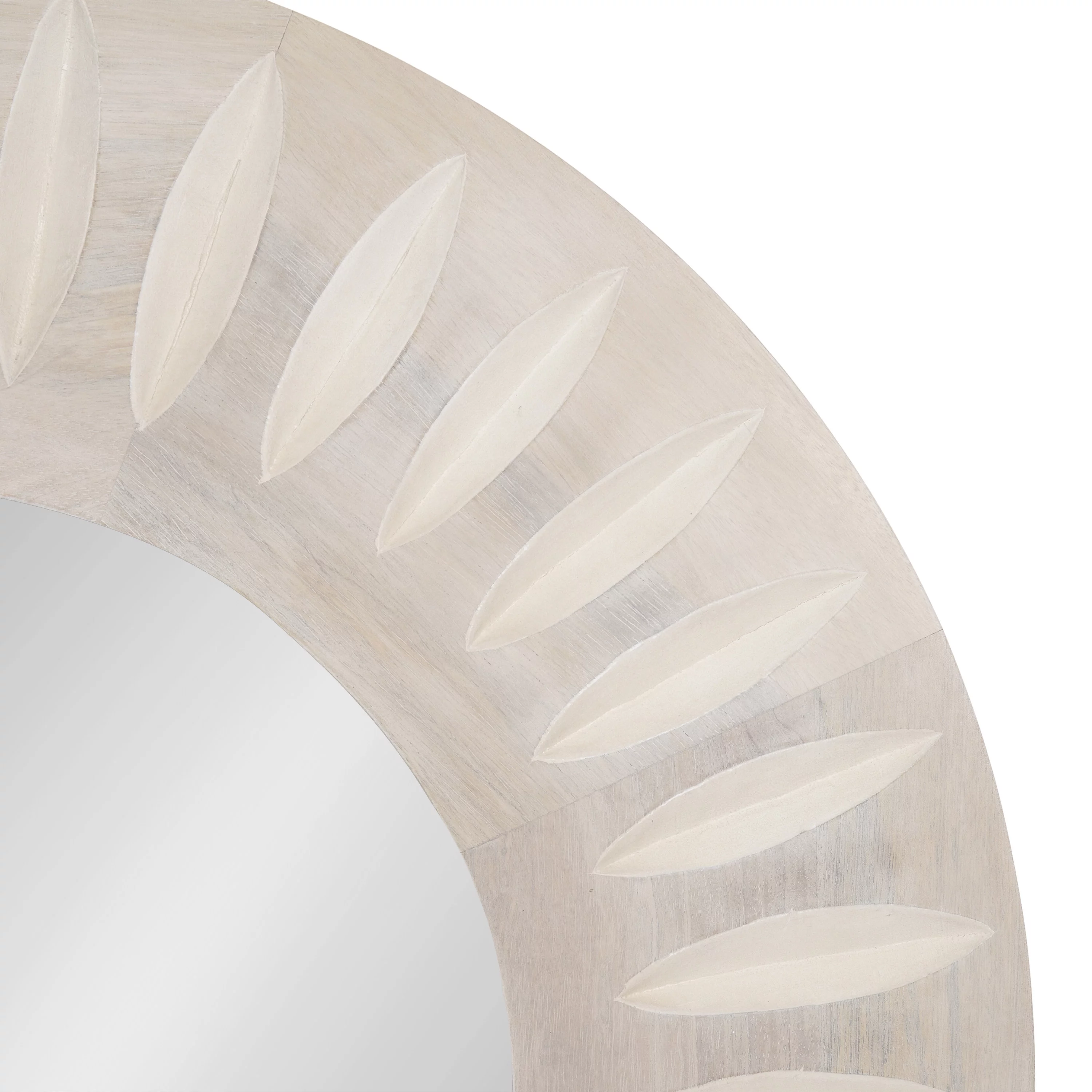 Parisloft Arched Framhouse Carved Wood Wall Mirror, Natural Wood and a Slight White, 31.875"W x 18.125"H