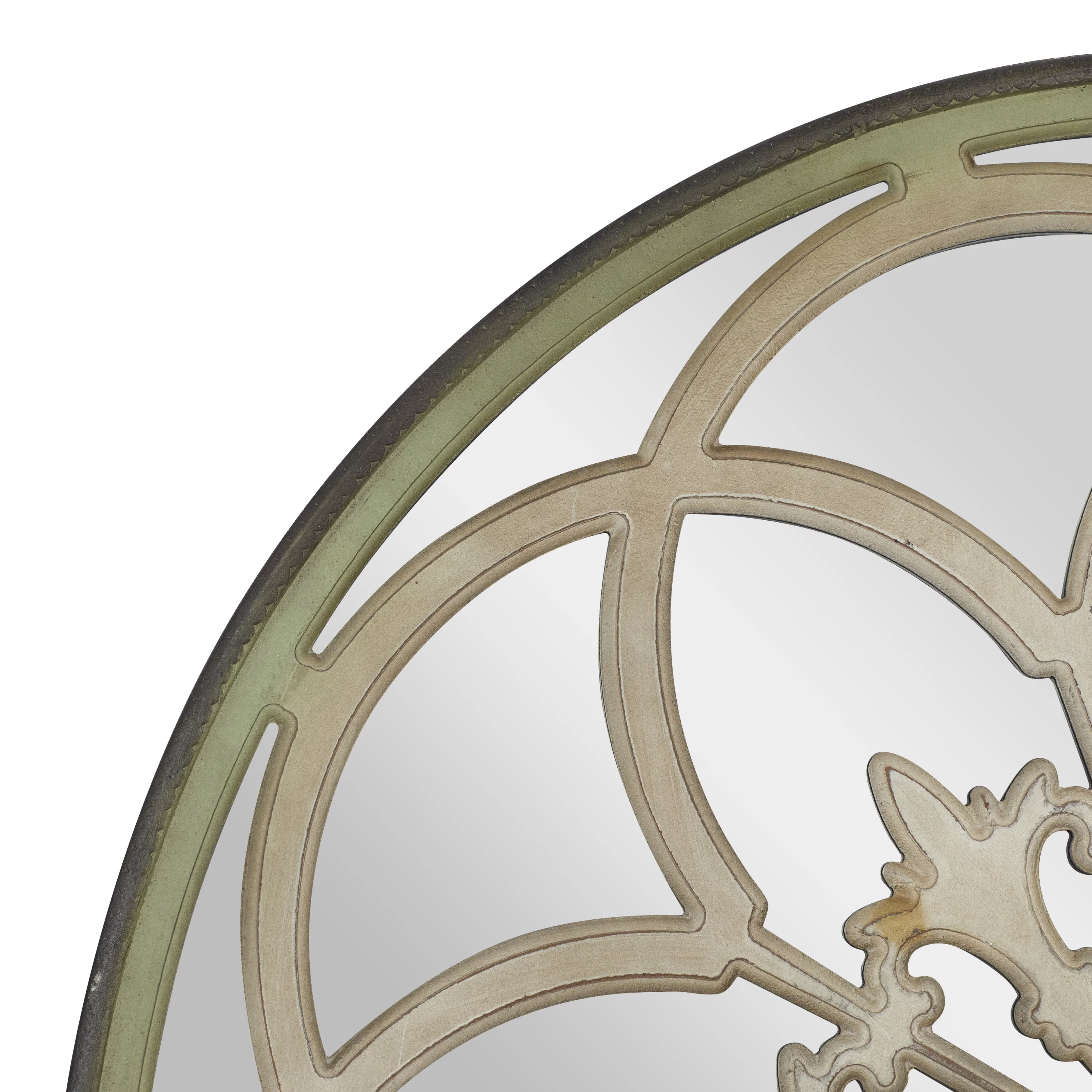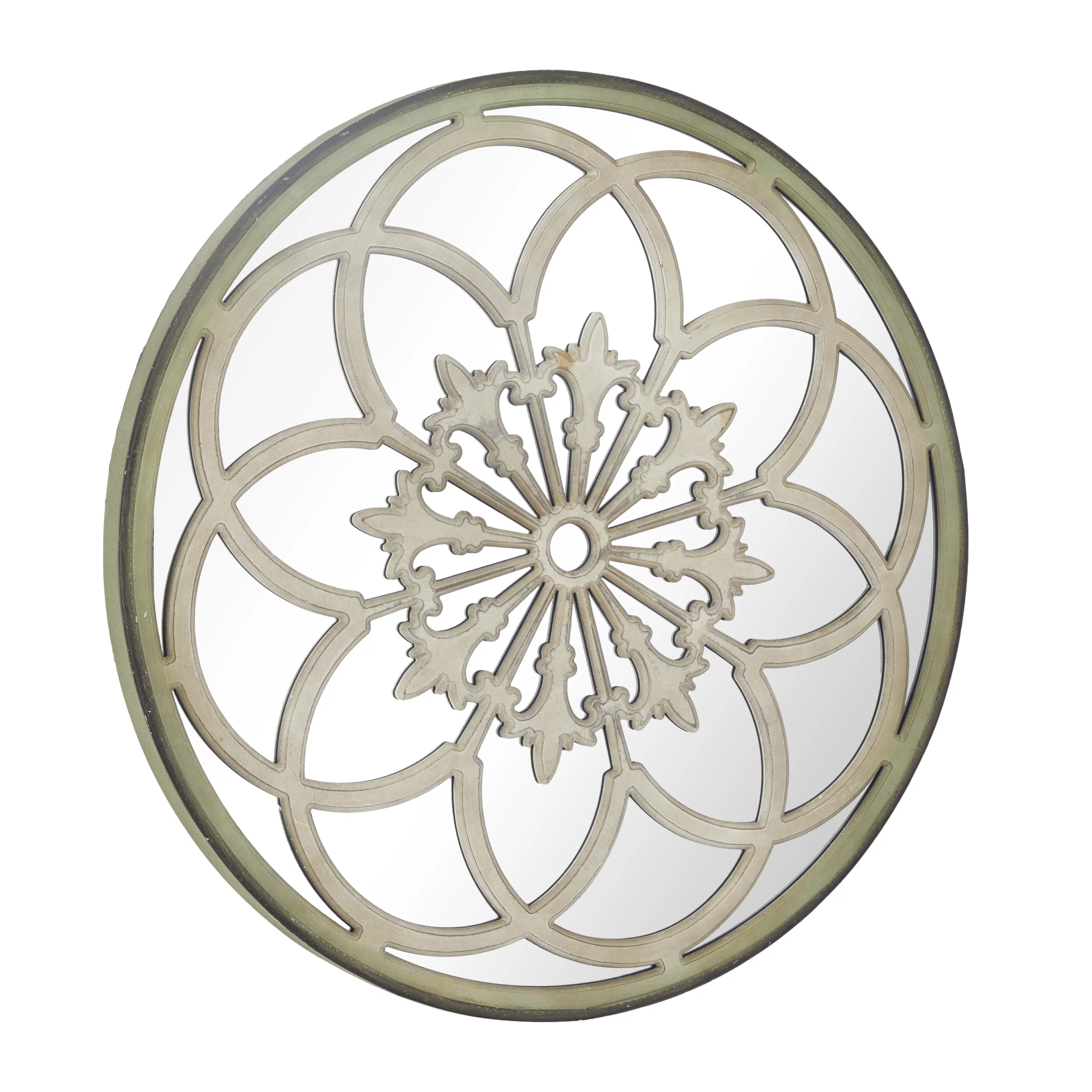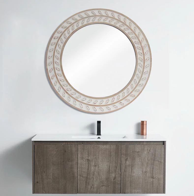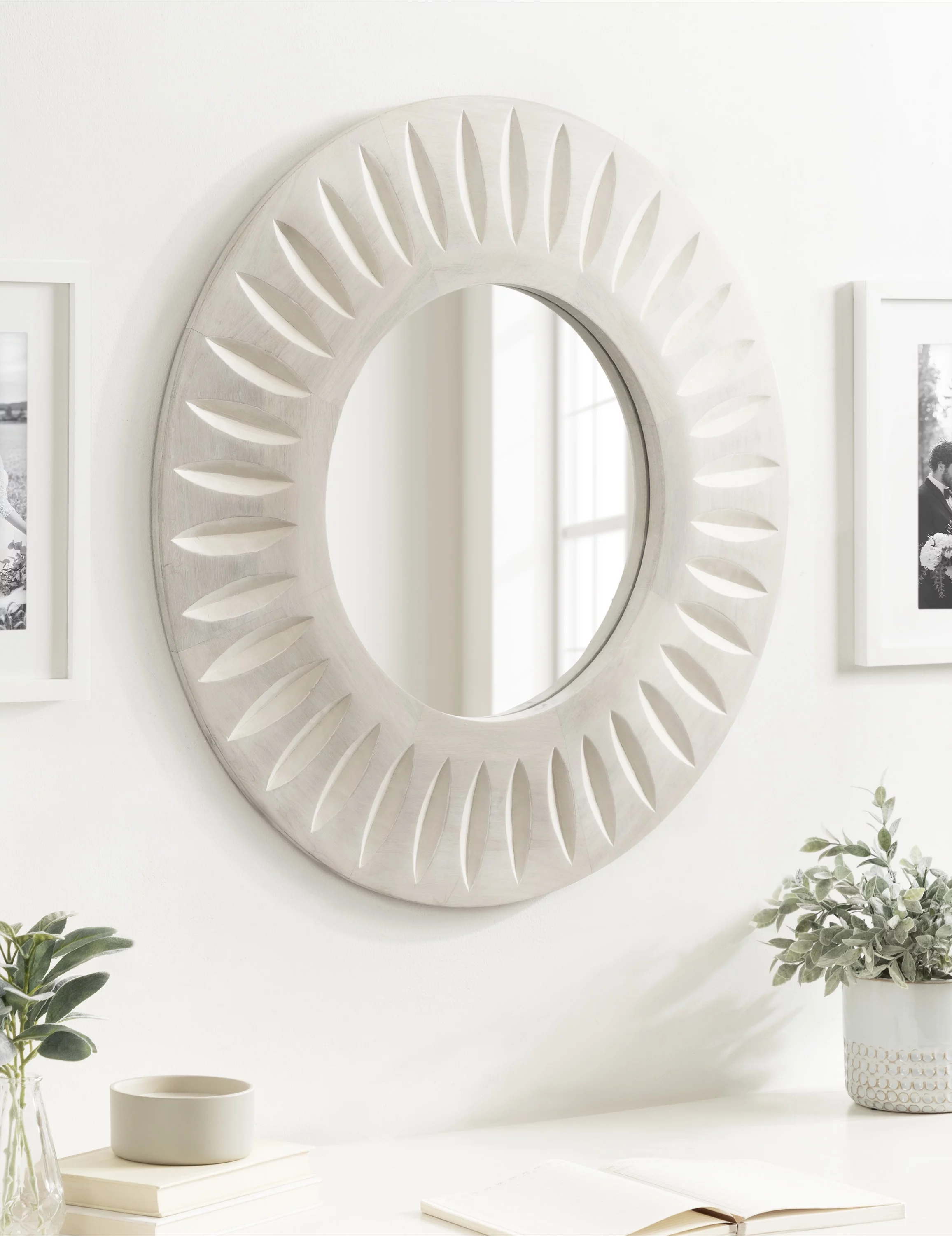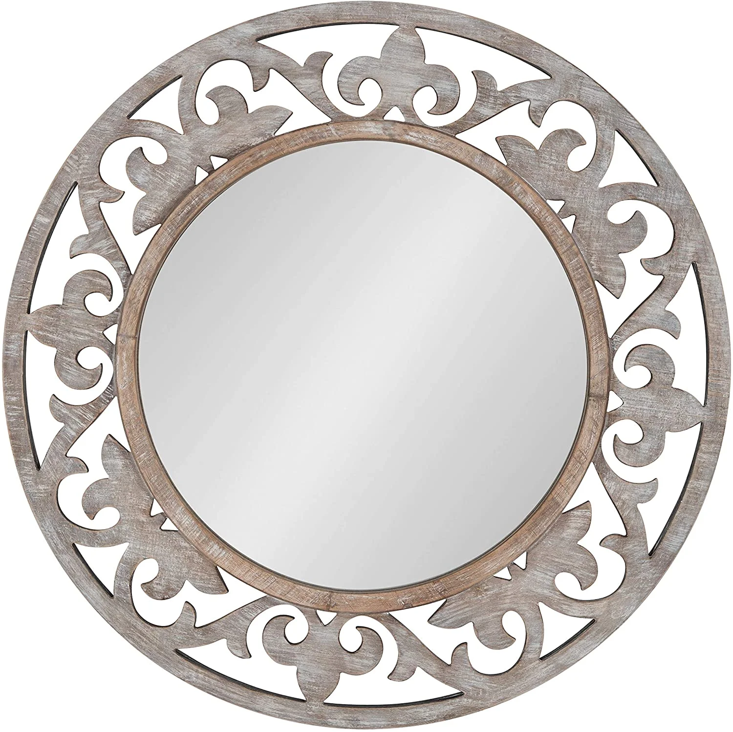 Parisloft Arched Framhouse Carved Wood Wall Mirror, Natural Wood and a Slight White, 31.875"W x 18.125"H