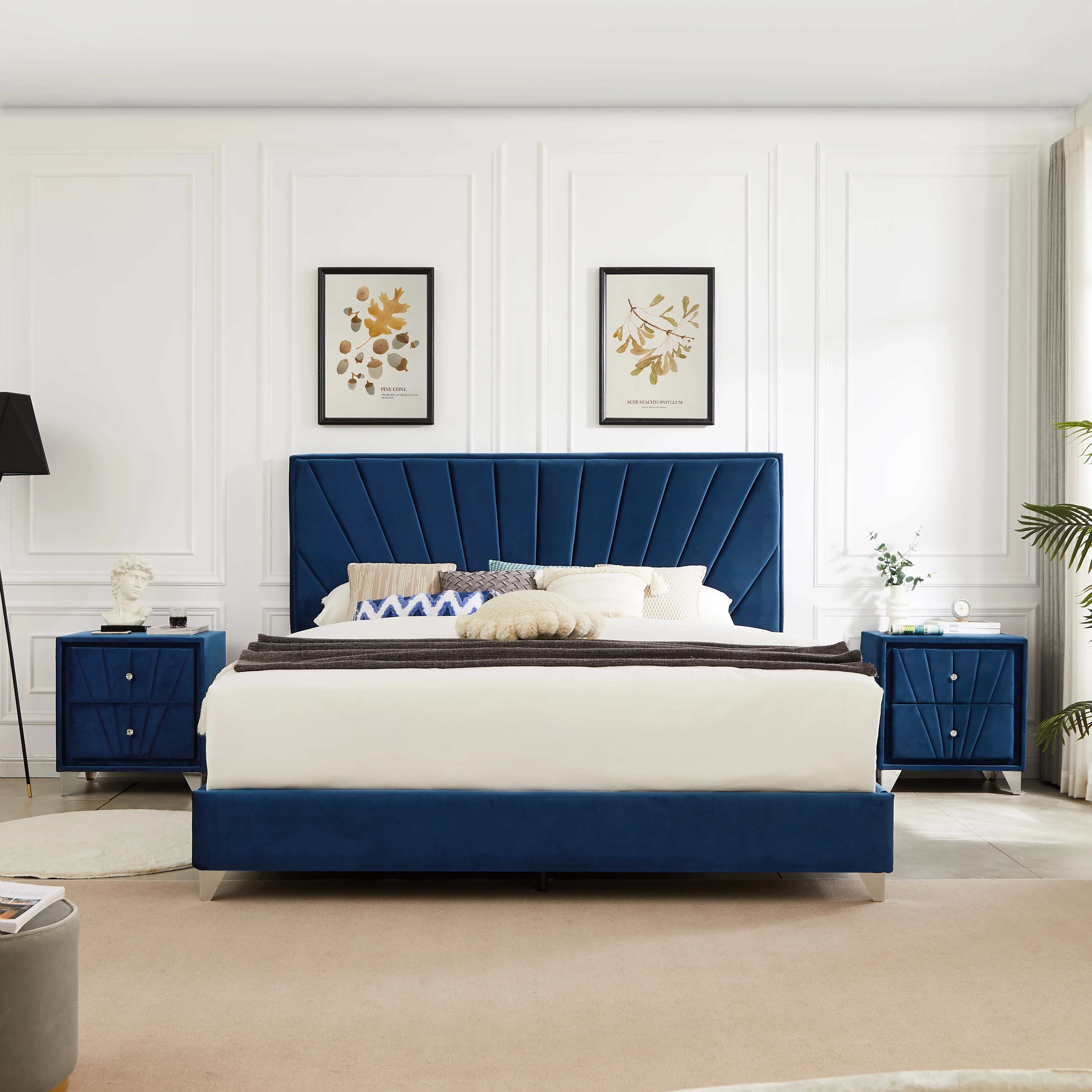 B108 King bed with two nightstands, Beautiful line stripe cushion headboard , strong wooden slats + metal legs with Electroplate