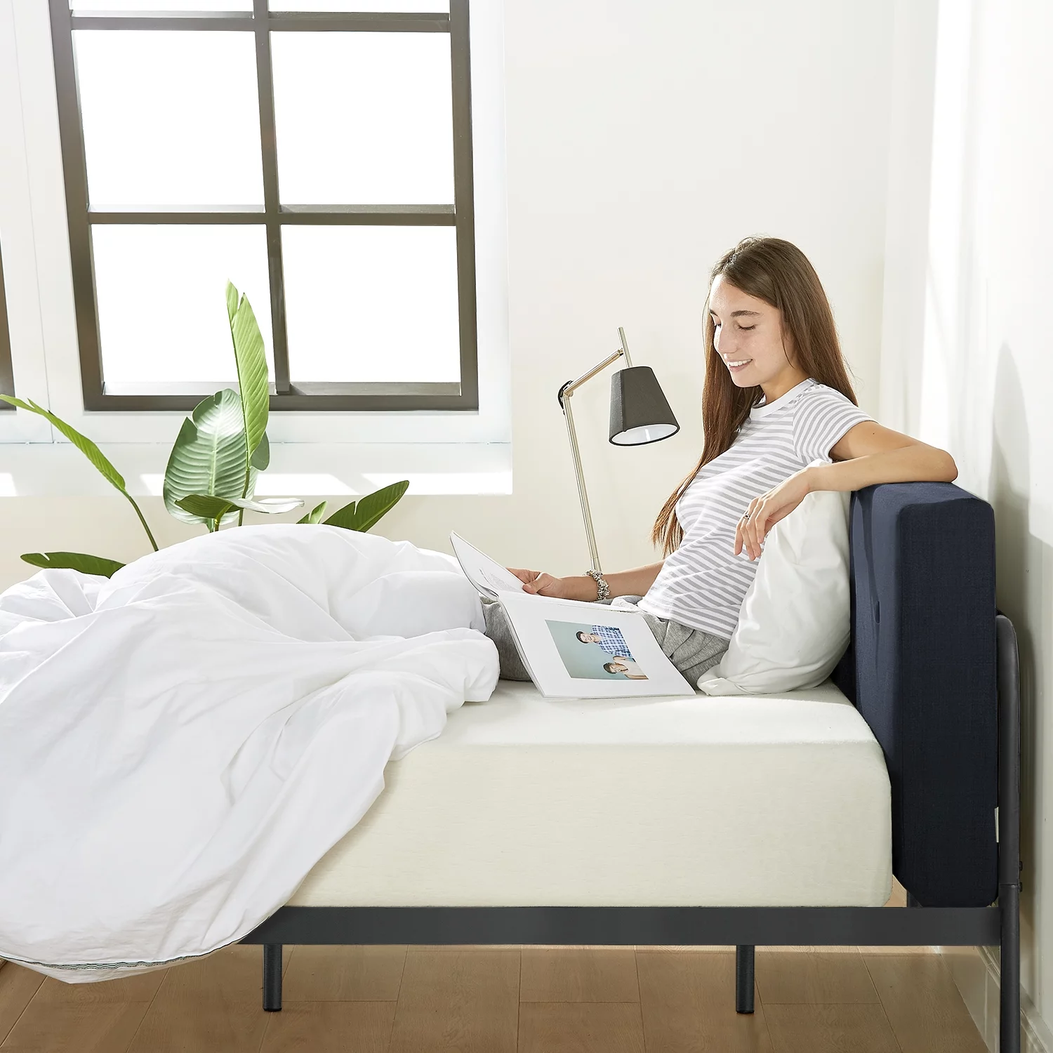 LANTRO JS B108 King bed Beautiful line stripe cushion headboard, strong wooden slats + metal legs with Electroplate