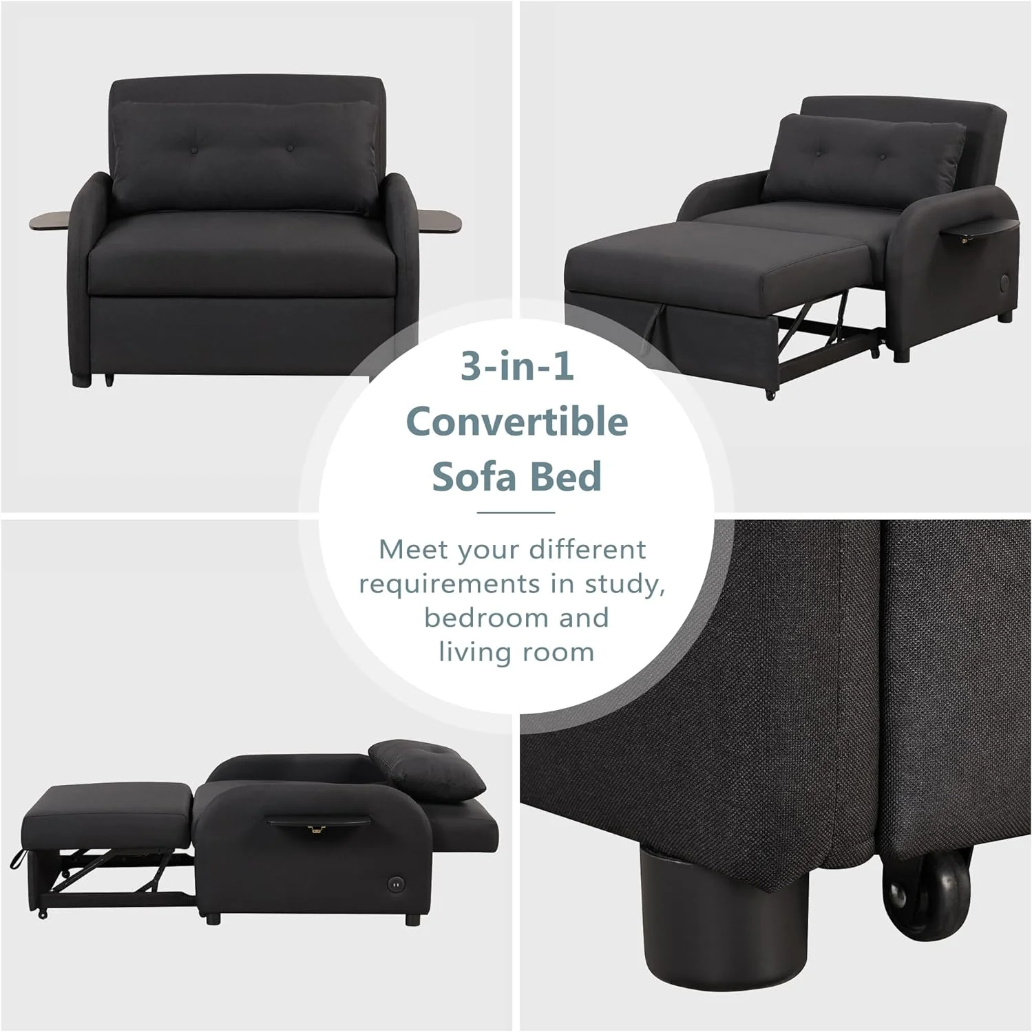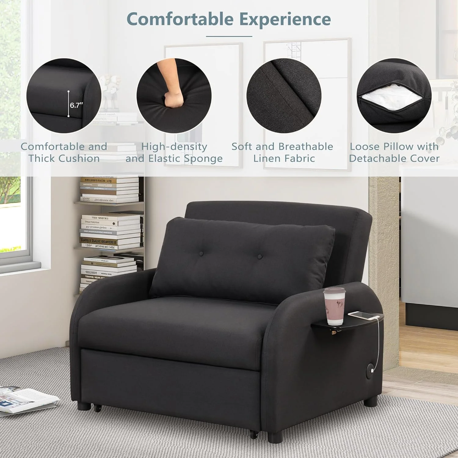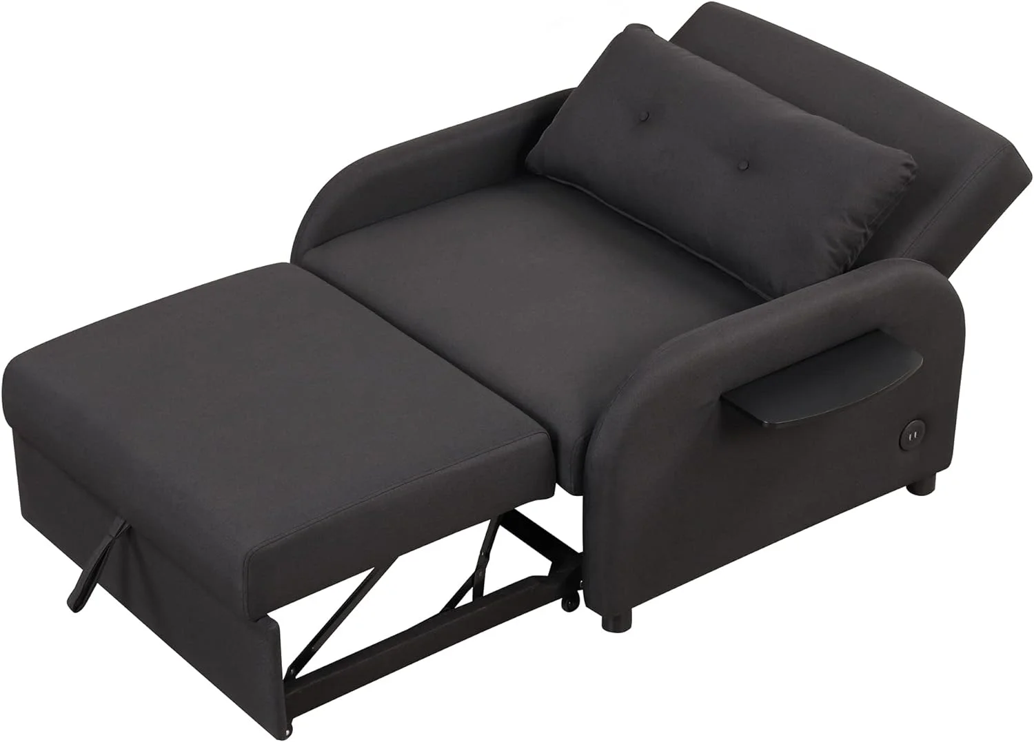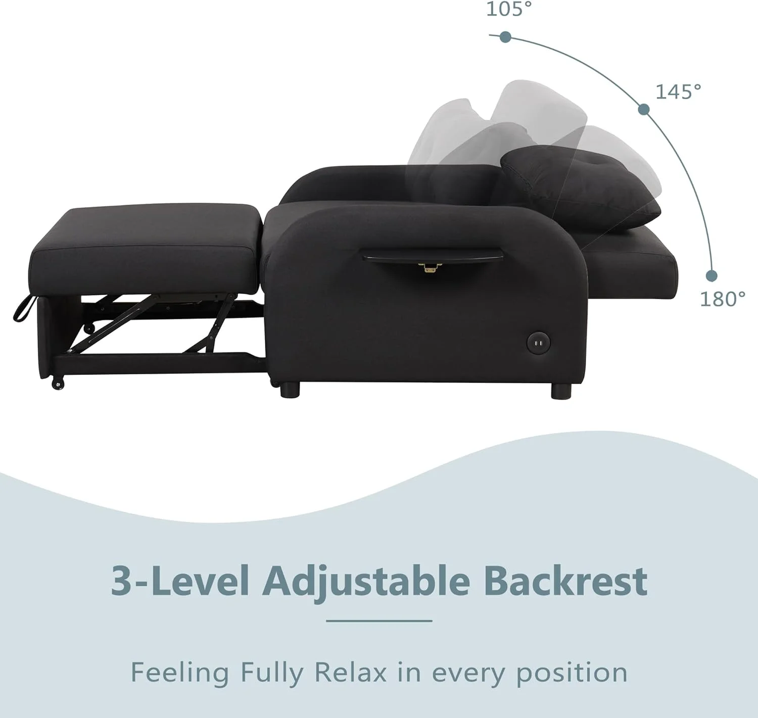 51" Convertible Sleeper Bed, Sofa Bed Adjustable Oversized Armchair with Dual USB Ports for Small Space (Black)