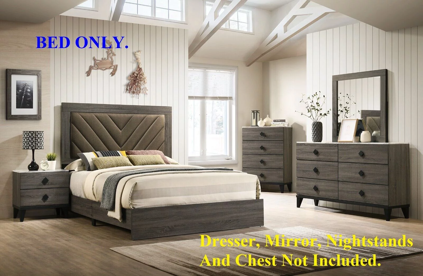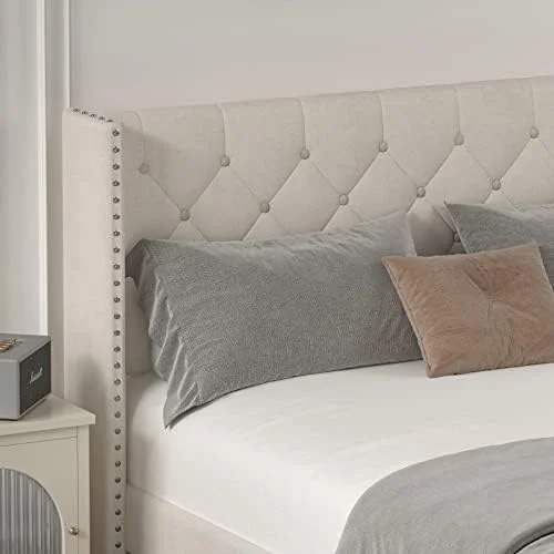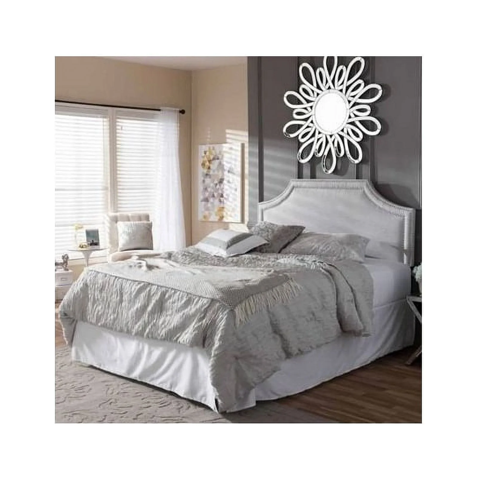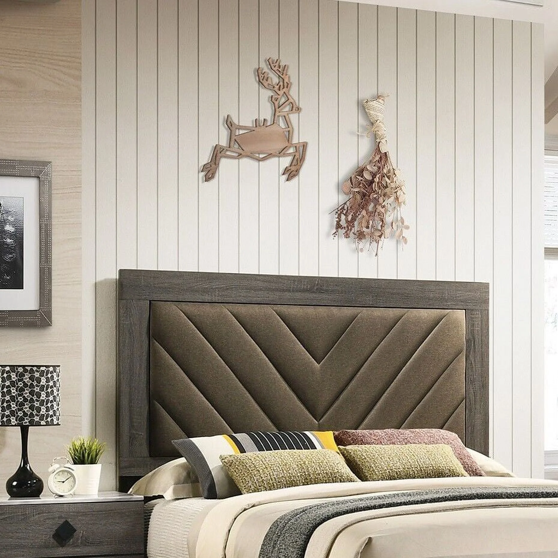 Gorgeous Classic Grey Finish Upholstered Fabric Headboard Queen Size Bed Lines Design 1pc Bedroom Furniture Wooden
