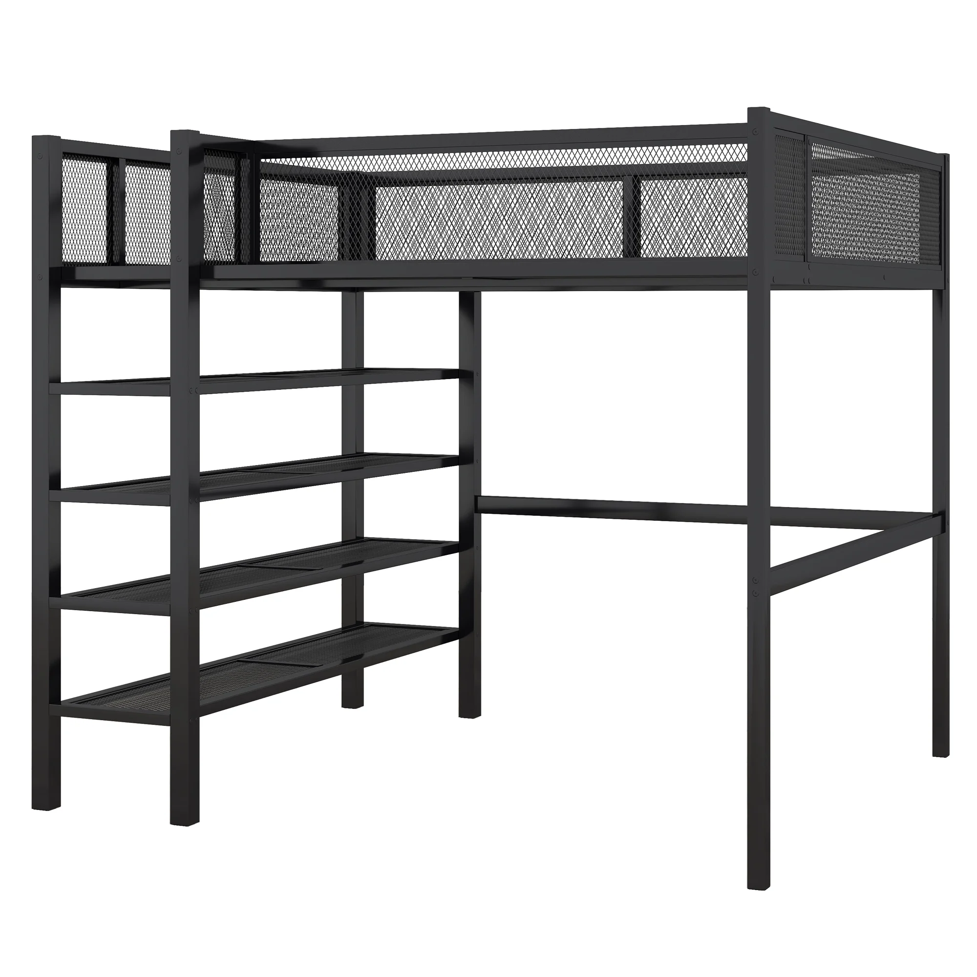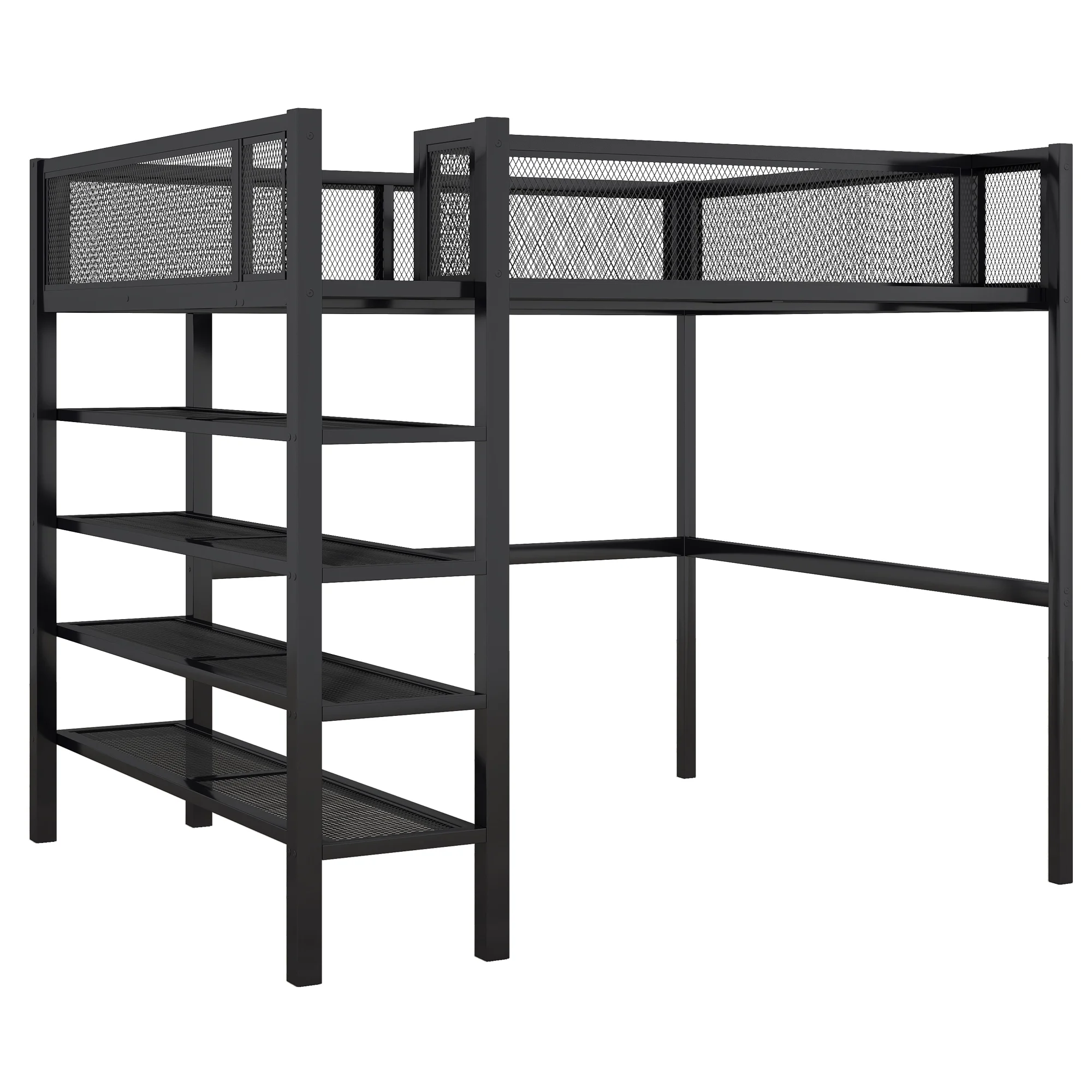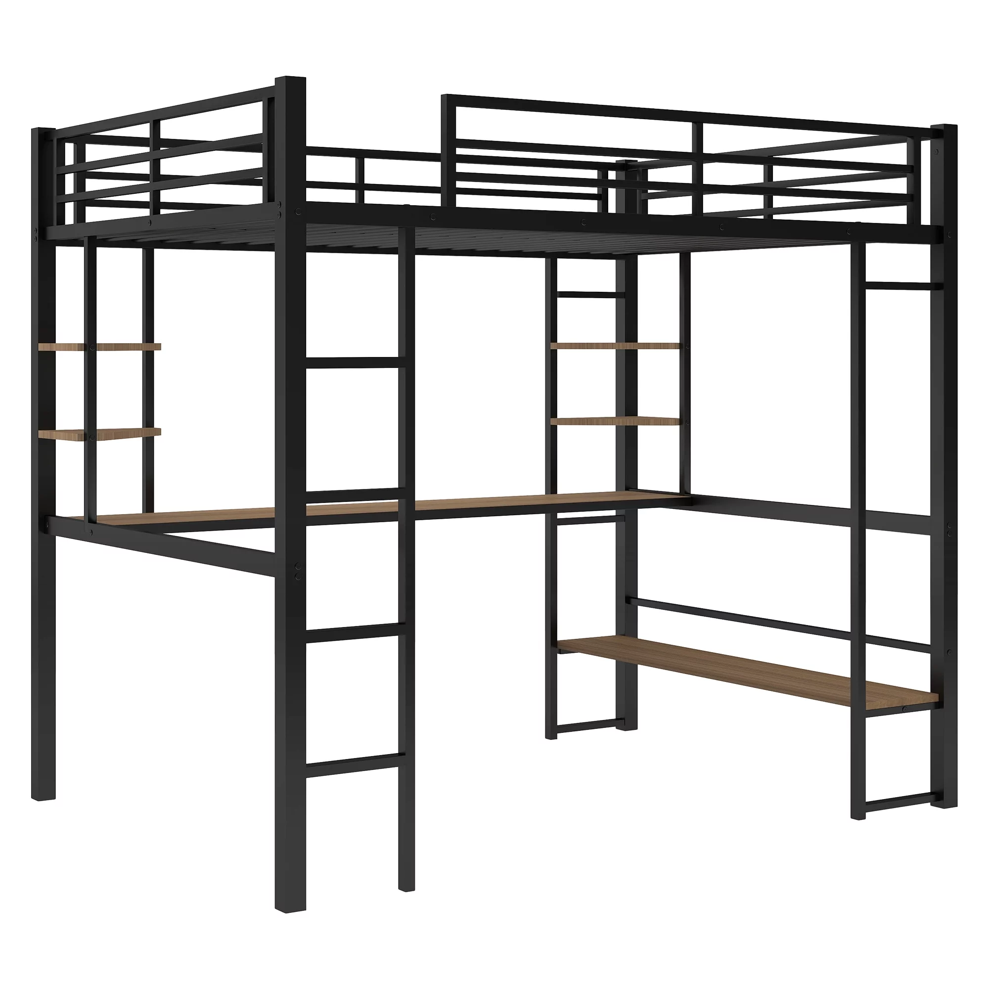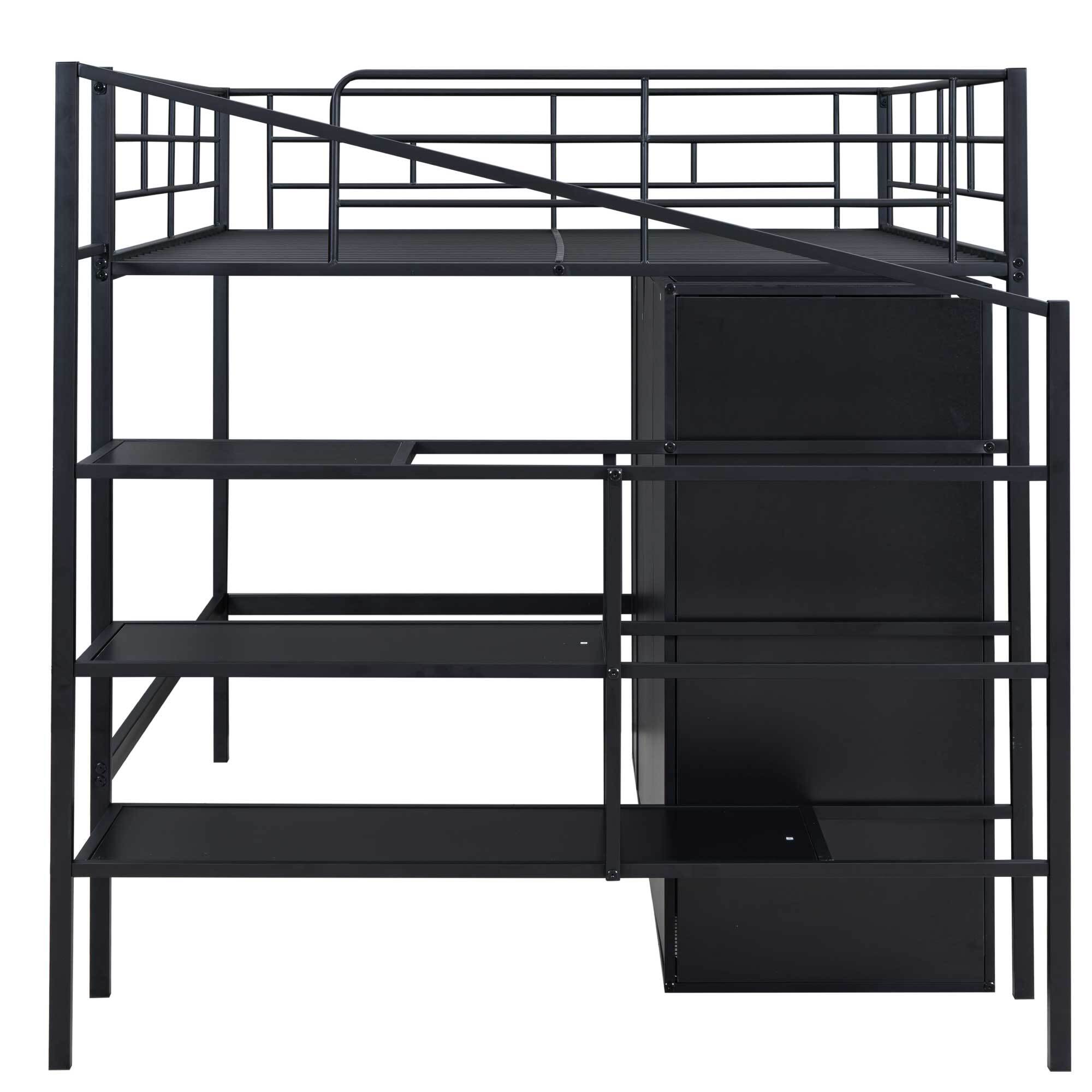 CRO Decor Full Size Loft Metal&MDF Bed with Long Desk and Shelves (Black)