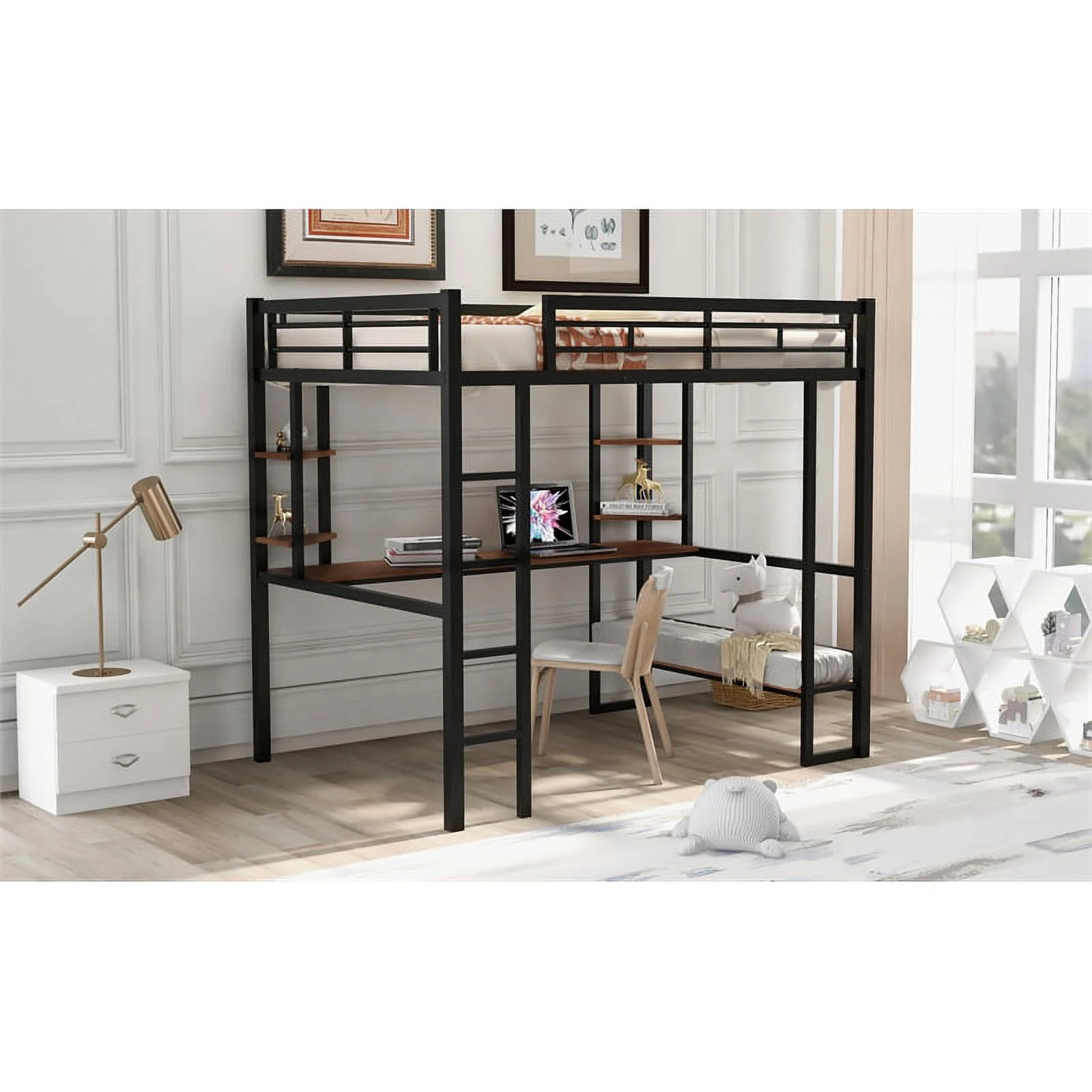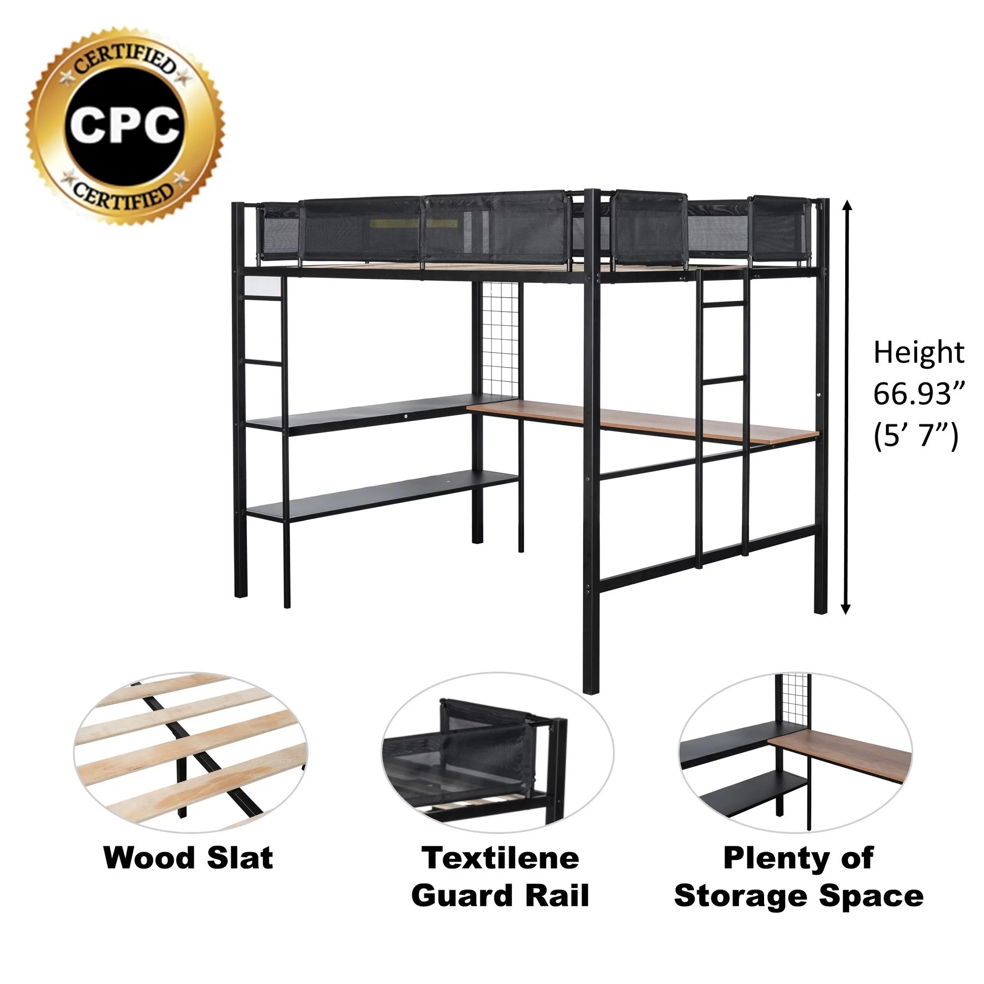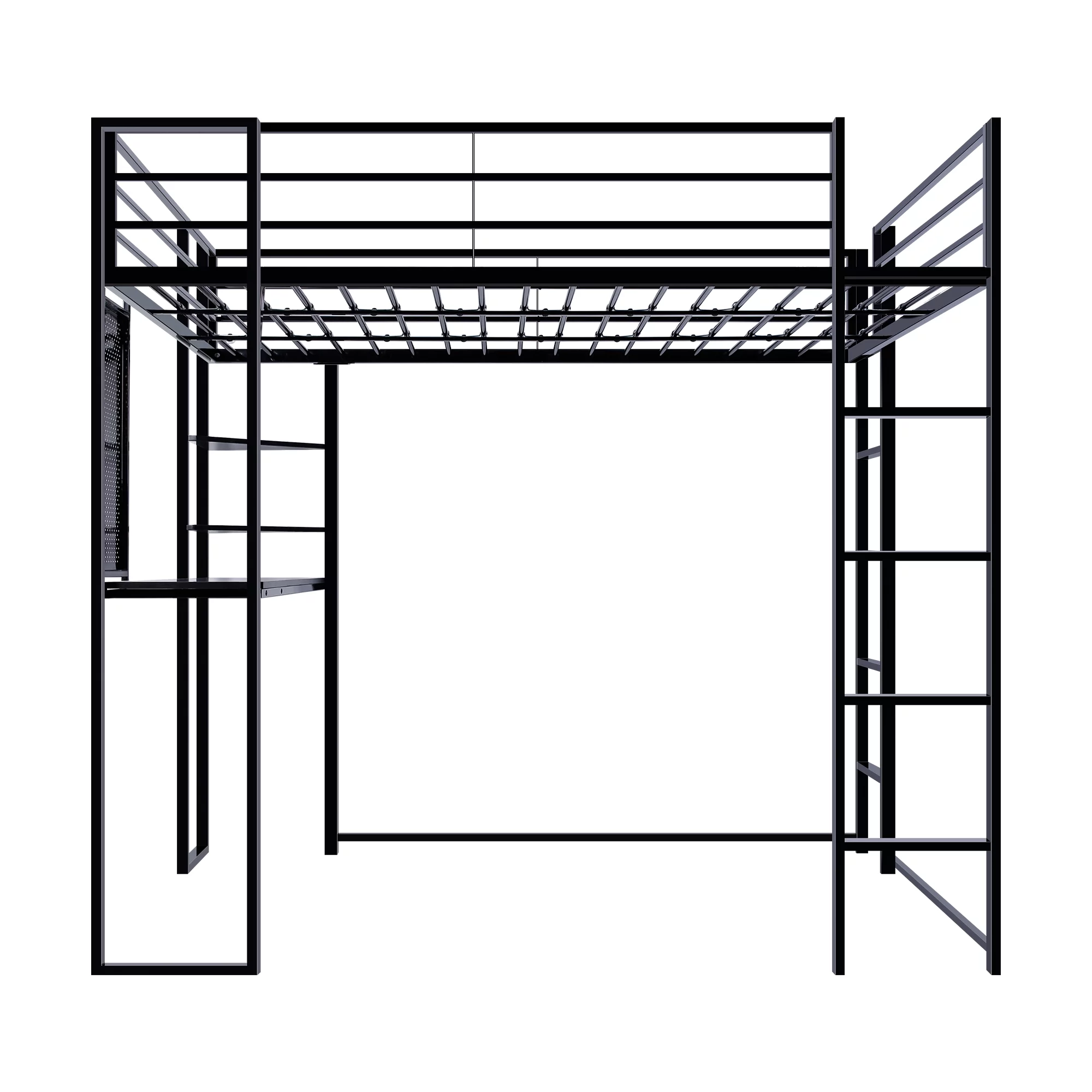 CRO Decor Full Size Loft Metal&MDF Bed with Long Desk and Shelves (Black)