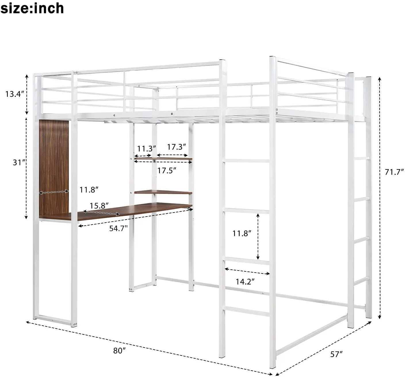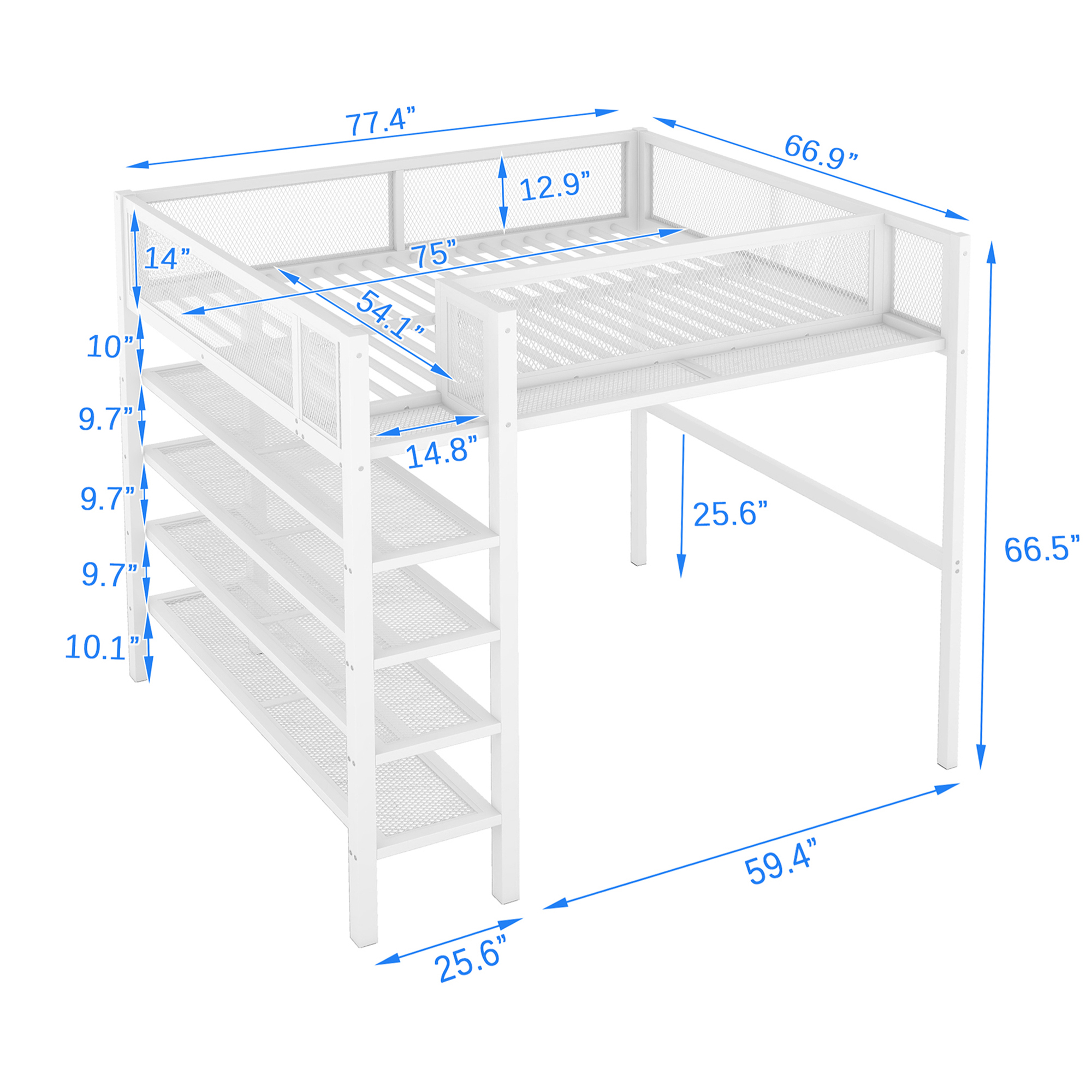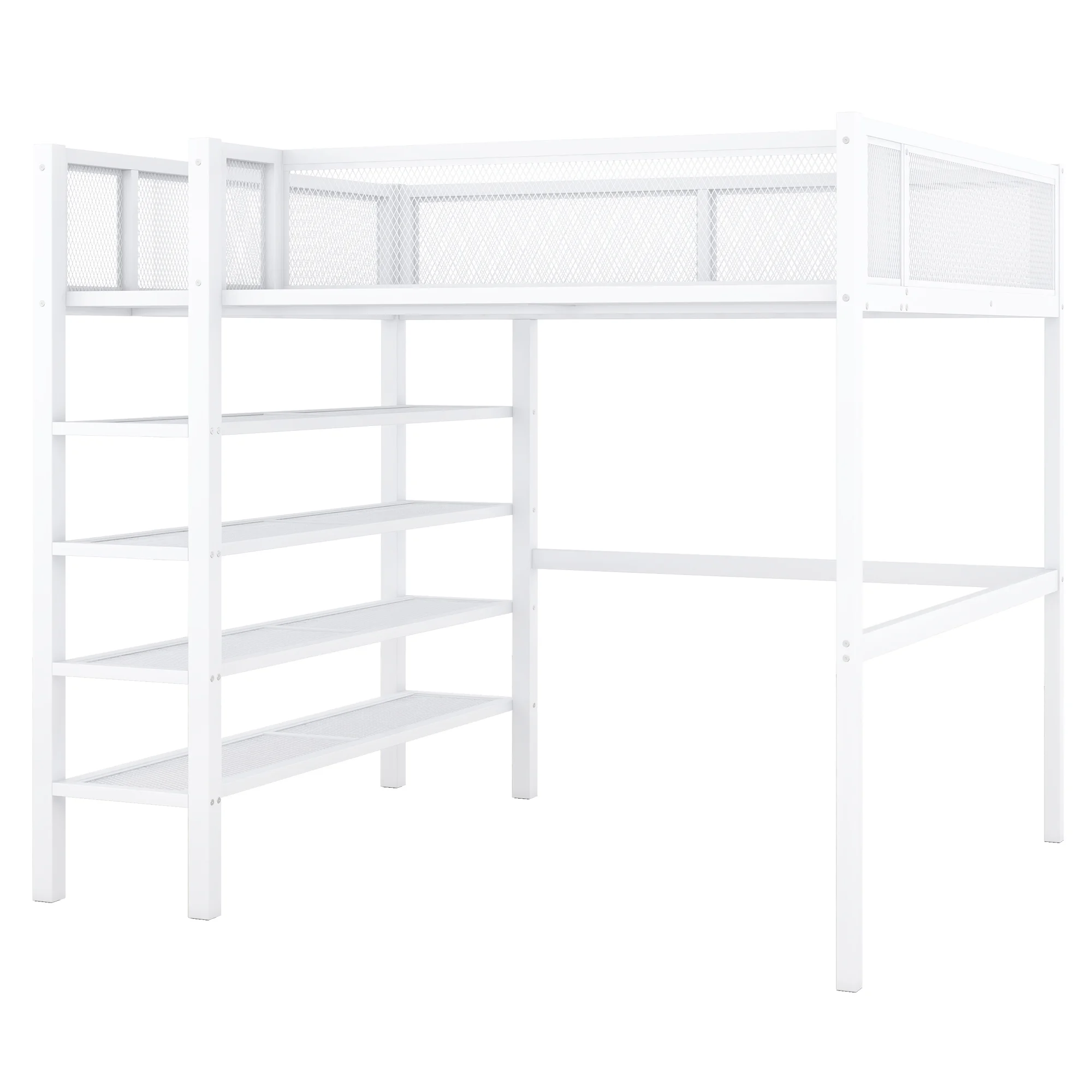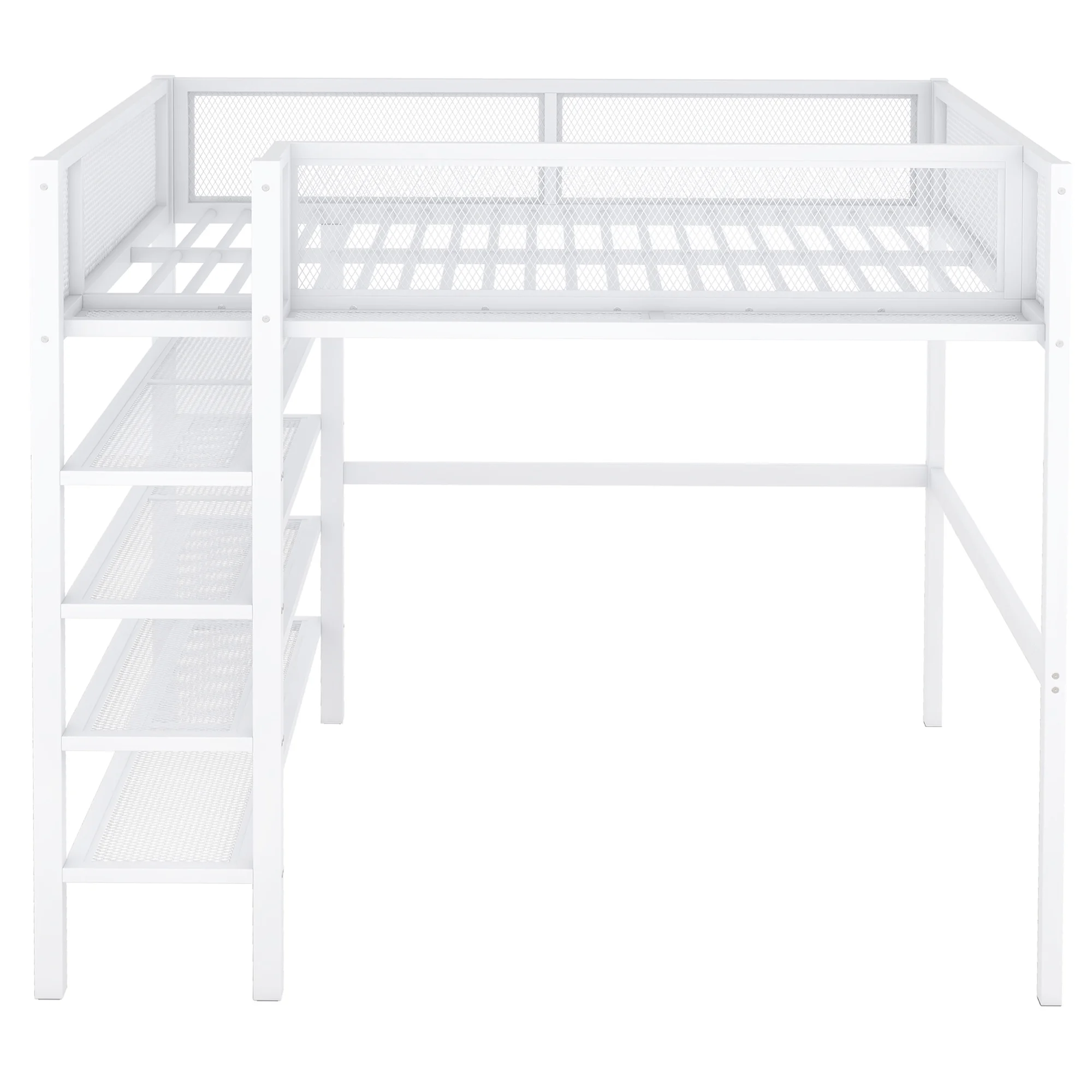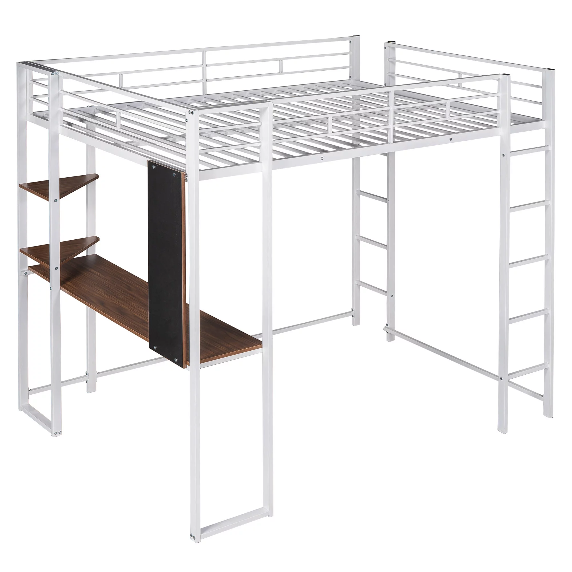 Full Size Metal Loft Bed with 2 Shelves and one Desk ,White (Old SKU: LP000191AAK )