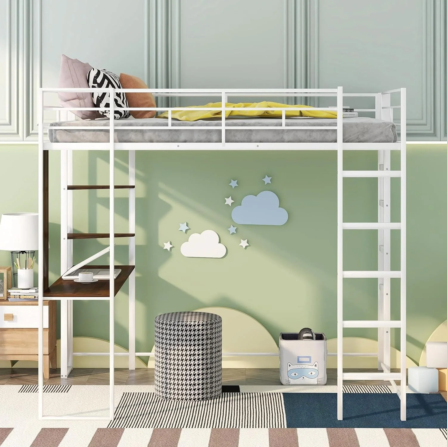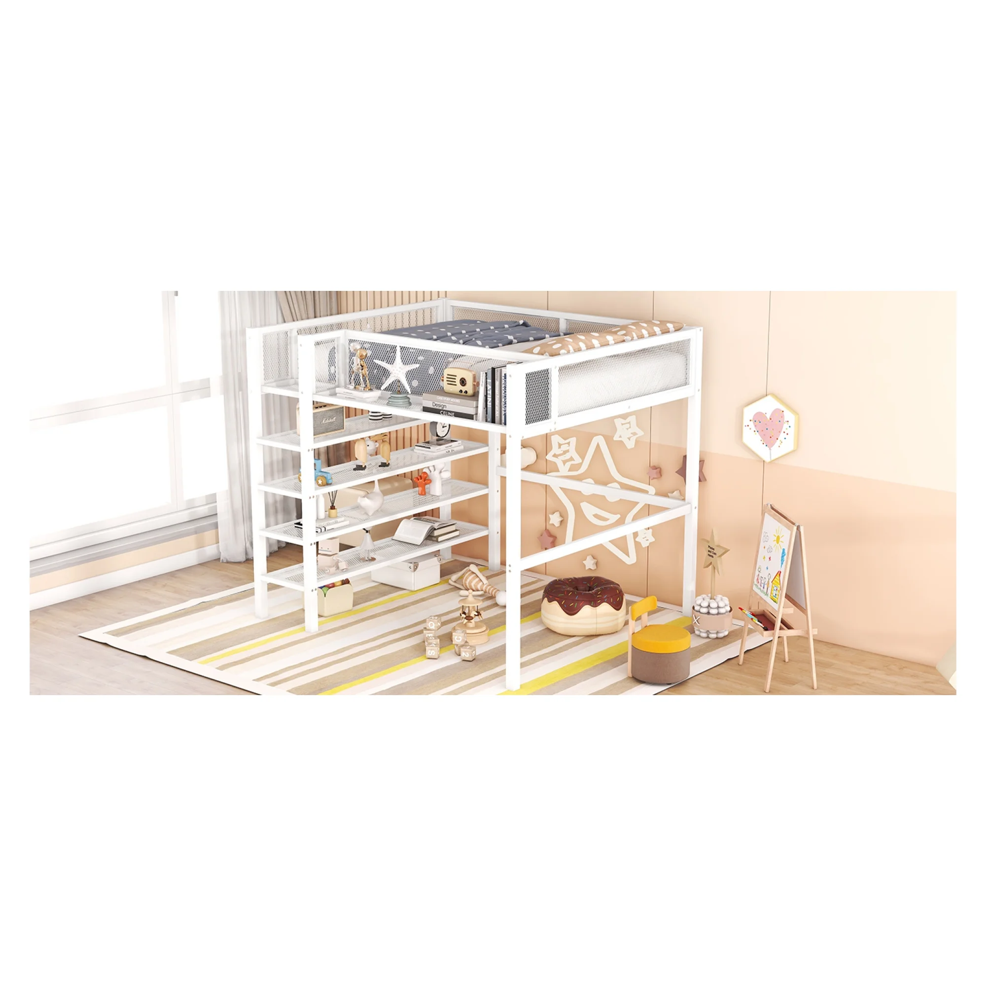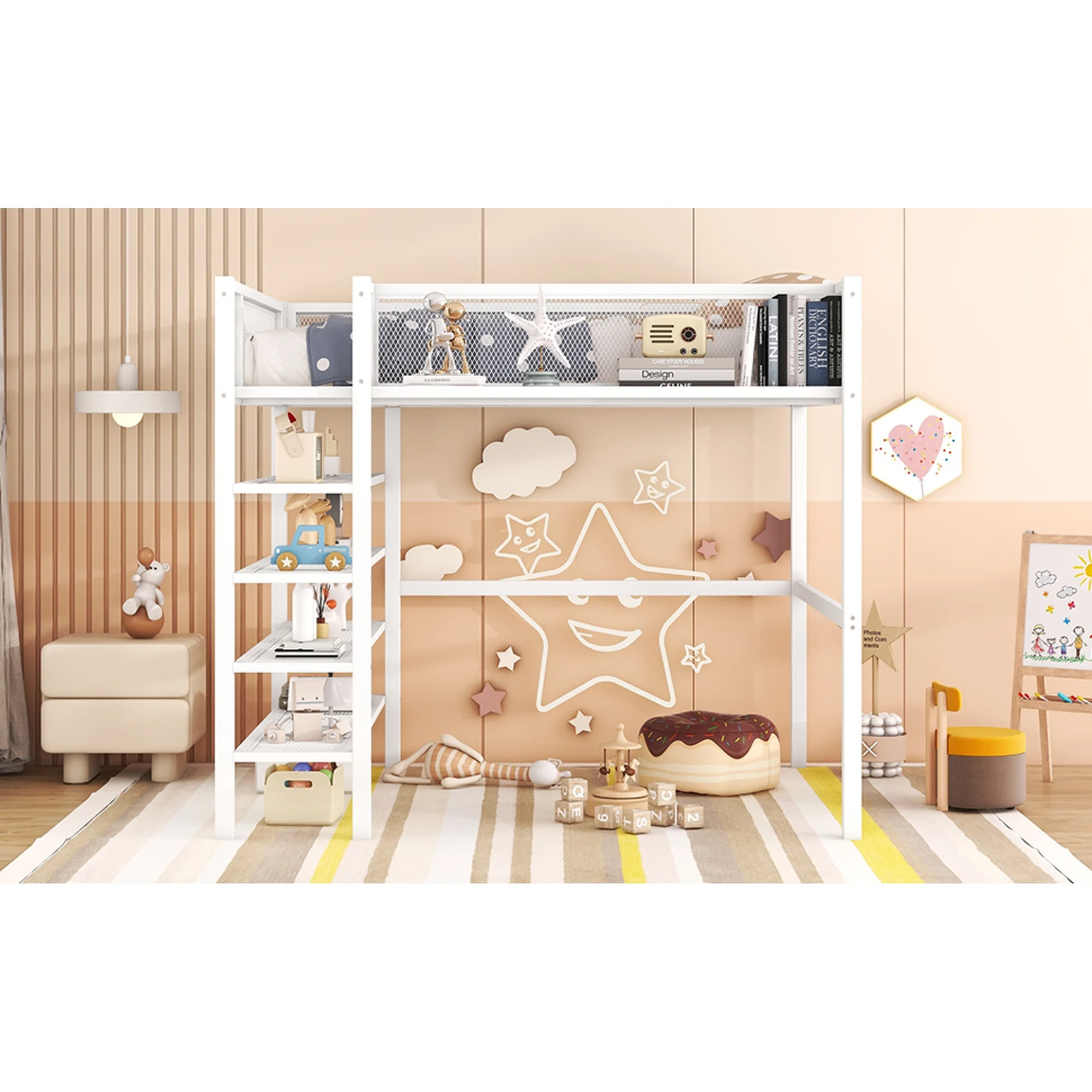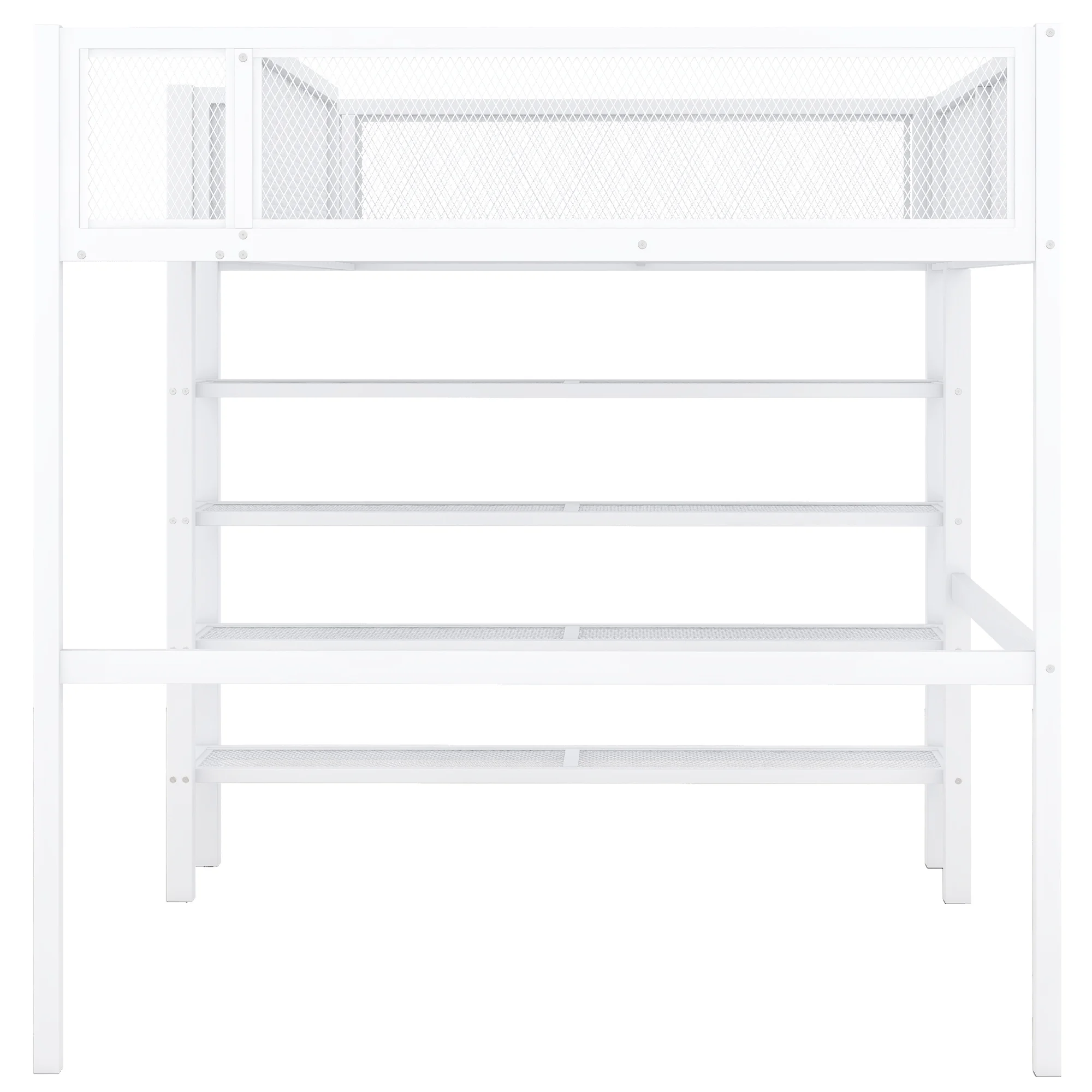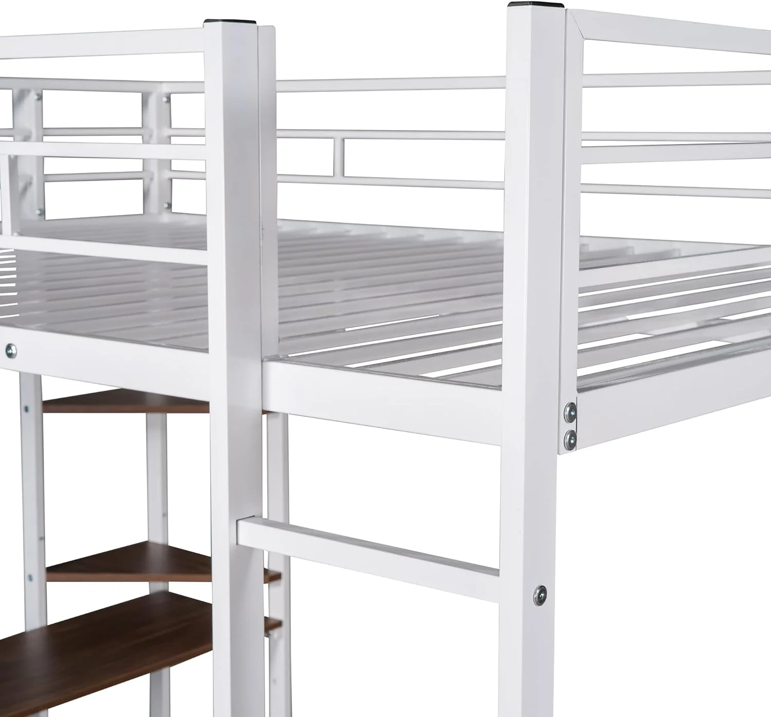 Full Size Metal Loft Bed with 2 Shelves and one Desk ,White (Old SKU: LP000191AAK )
