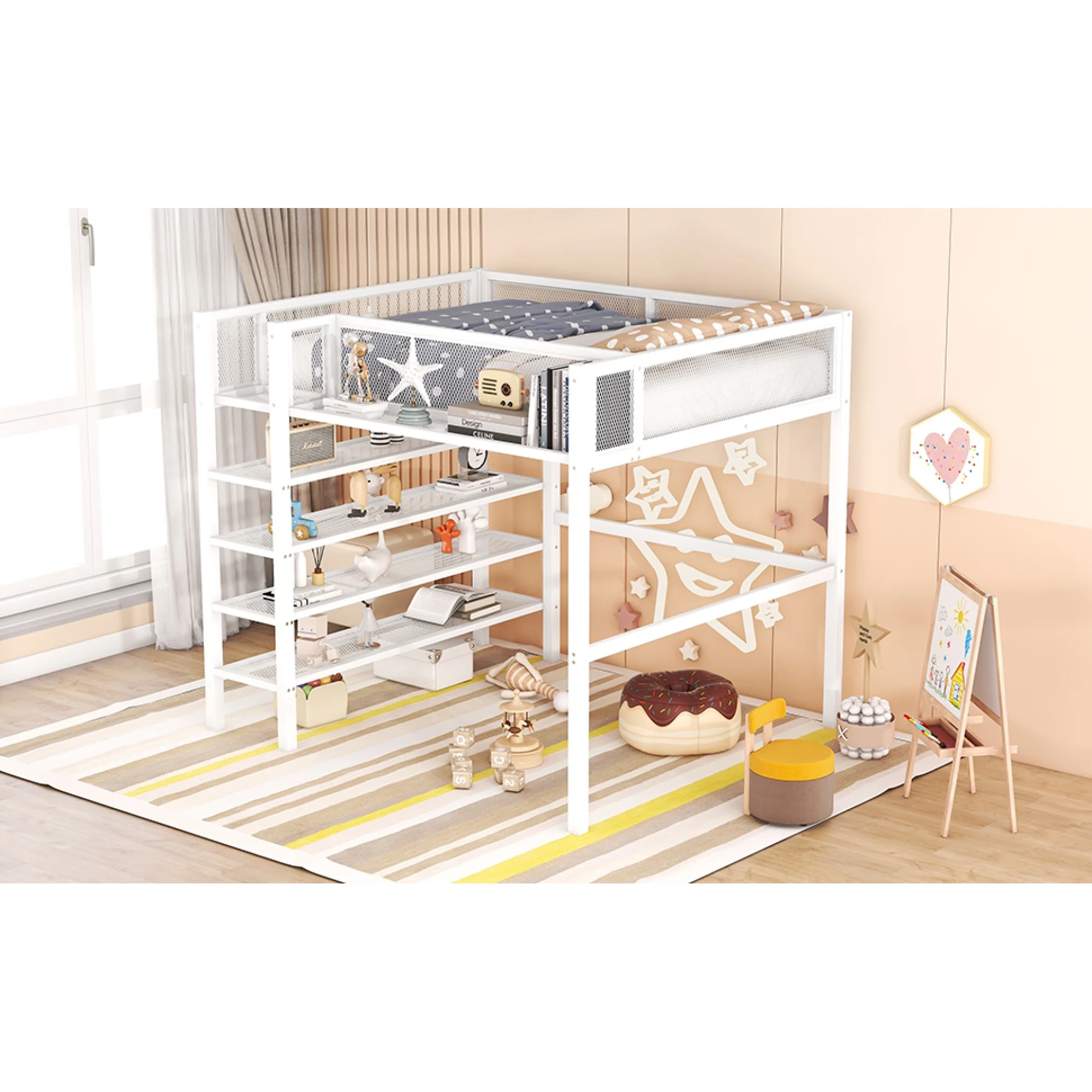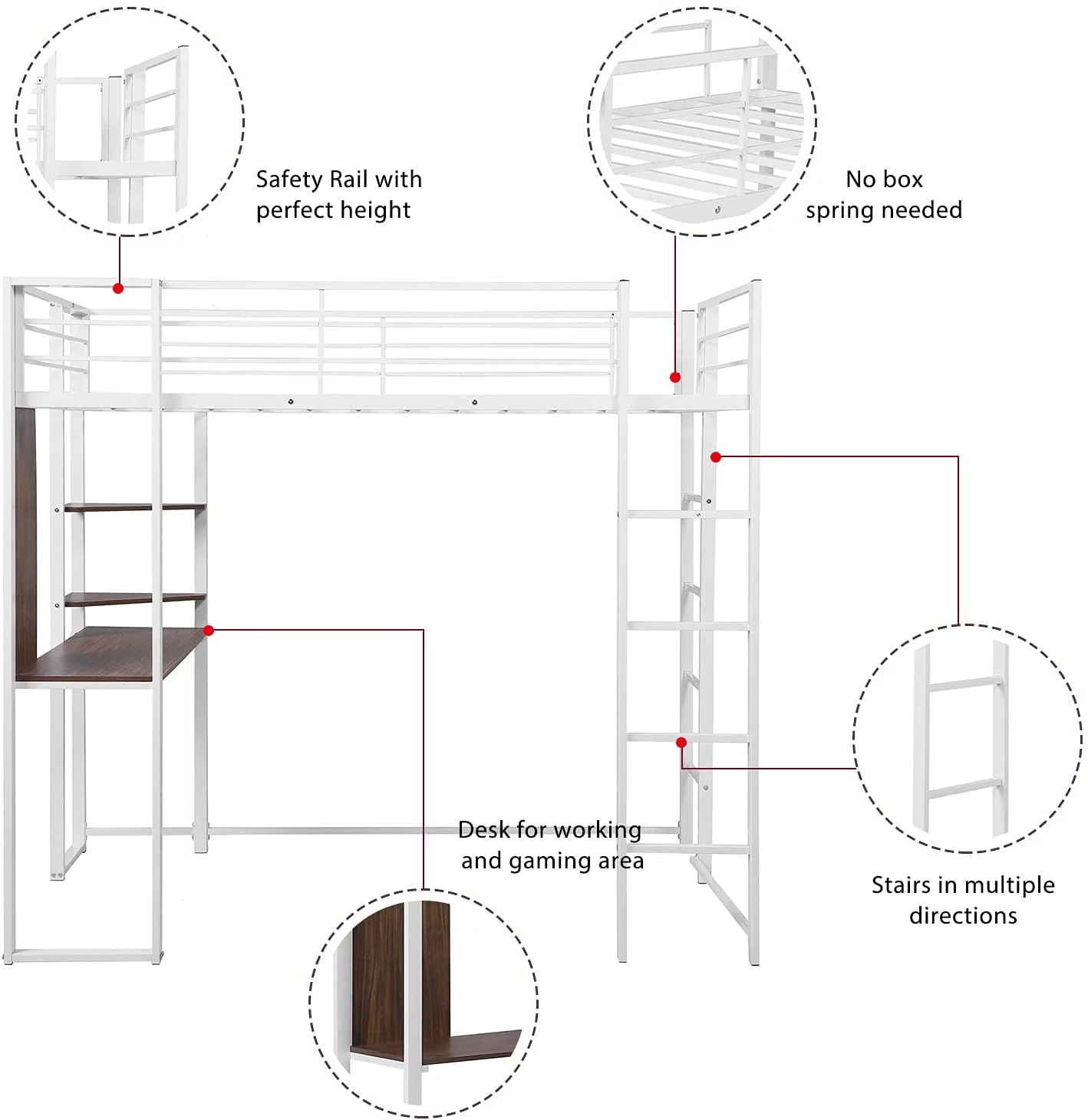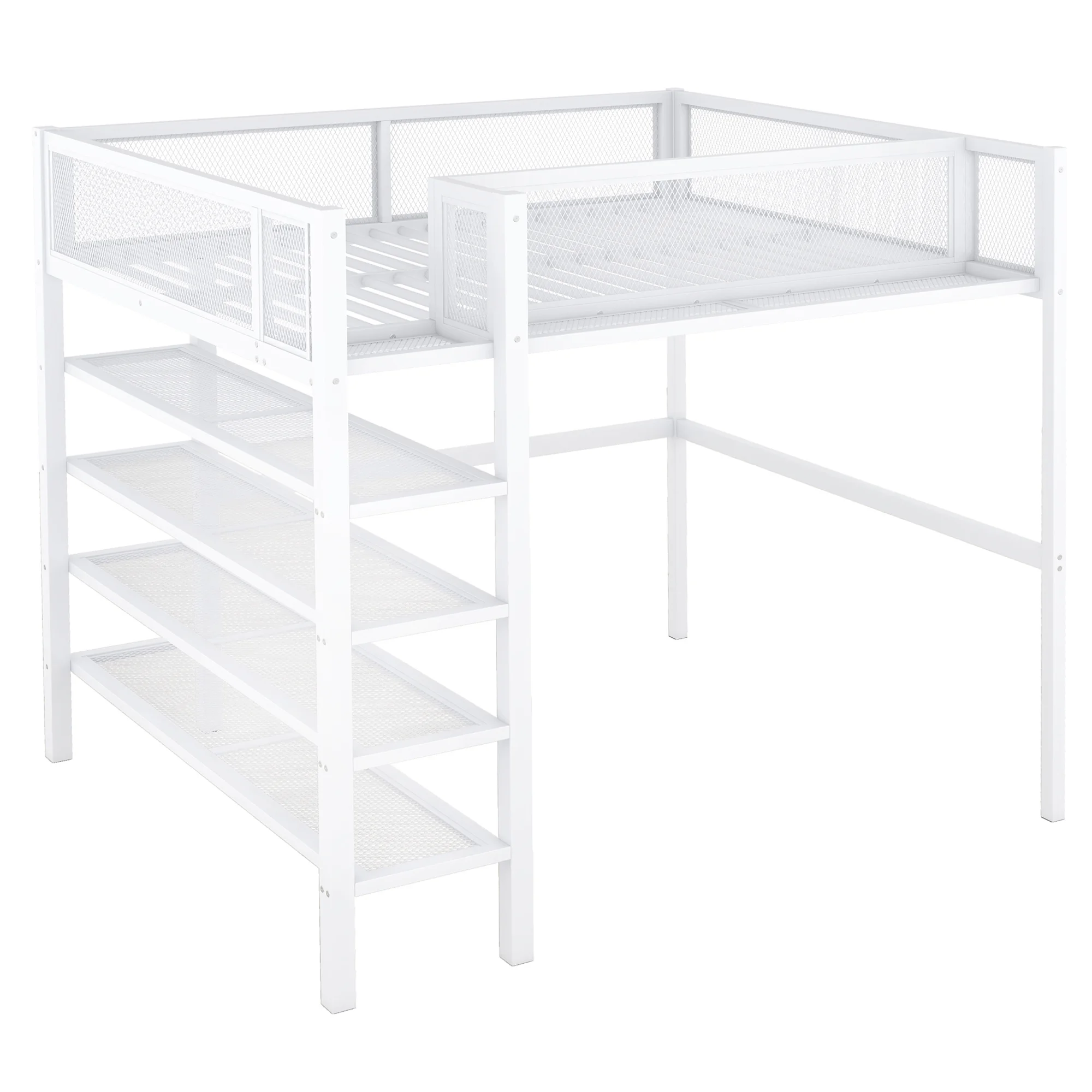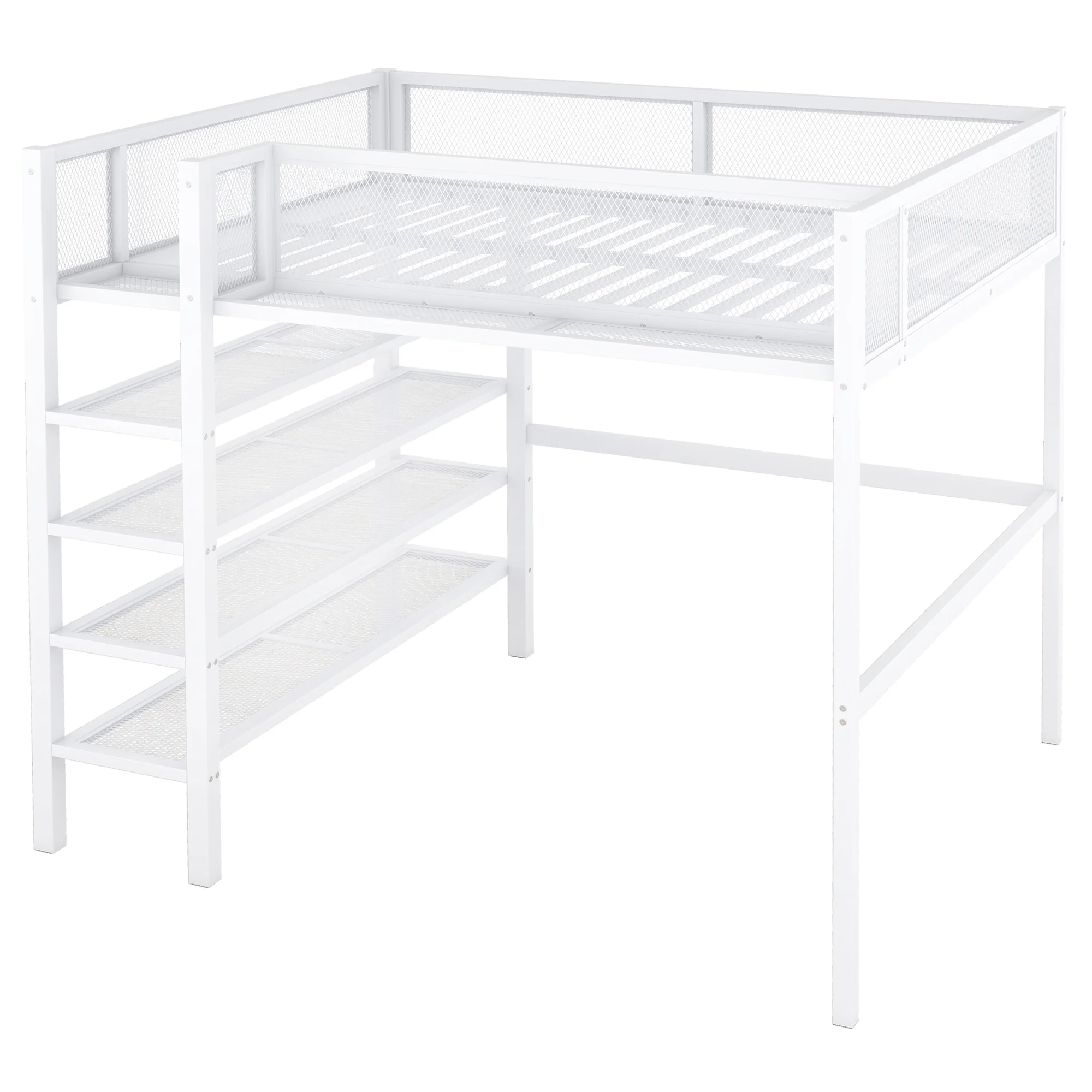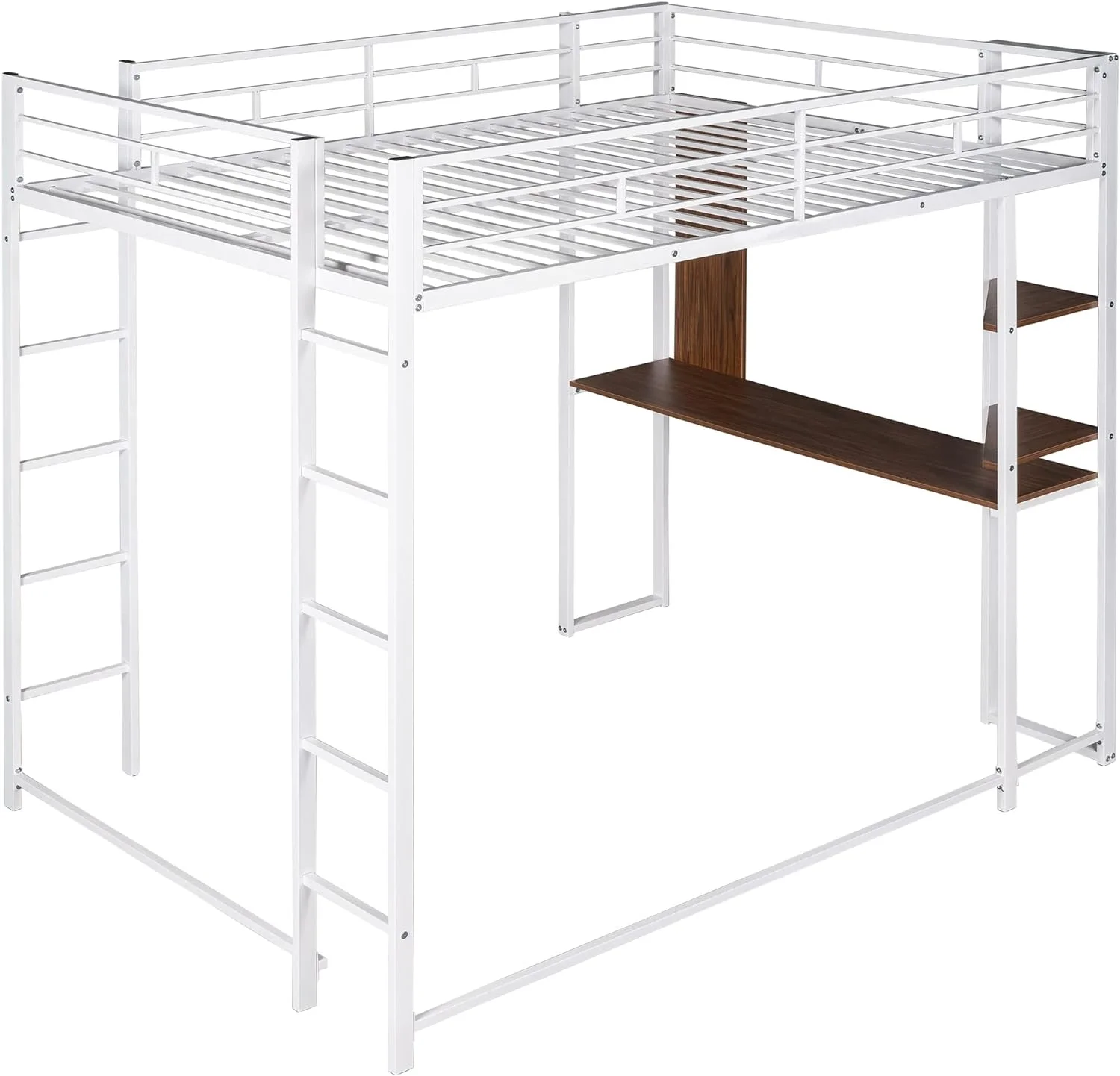 SOGES Space-Saving Full Size Metal Loft Bed with 2 Shelves and 1 Desk, White