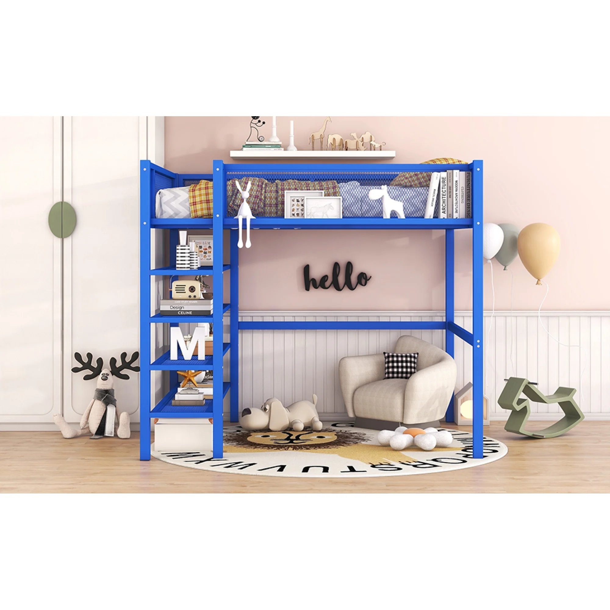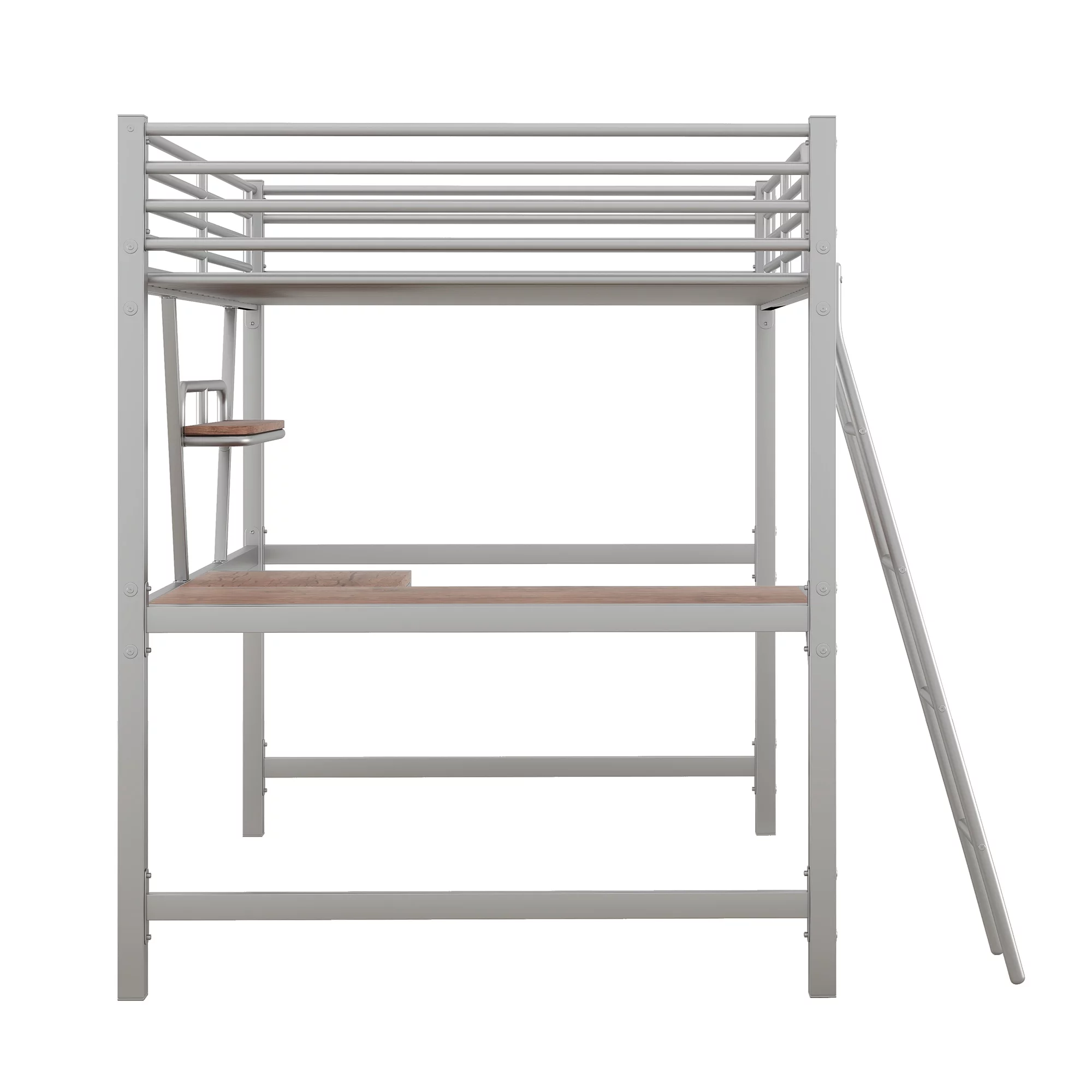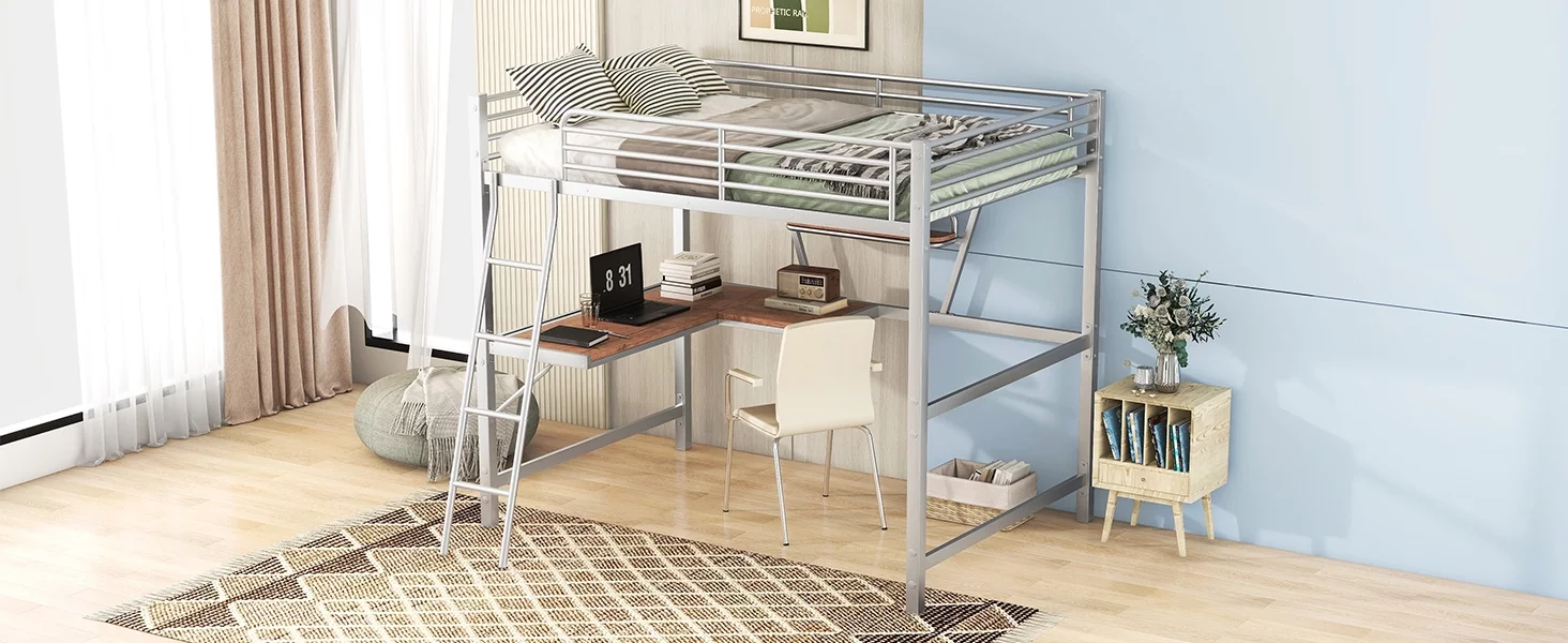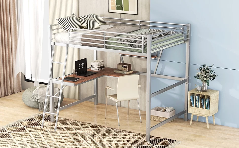 "Silver Full Size Loft Bed with Desk and Shelf - Durable Metal & MDF Construction for Space-Saving Design"