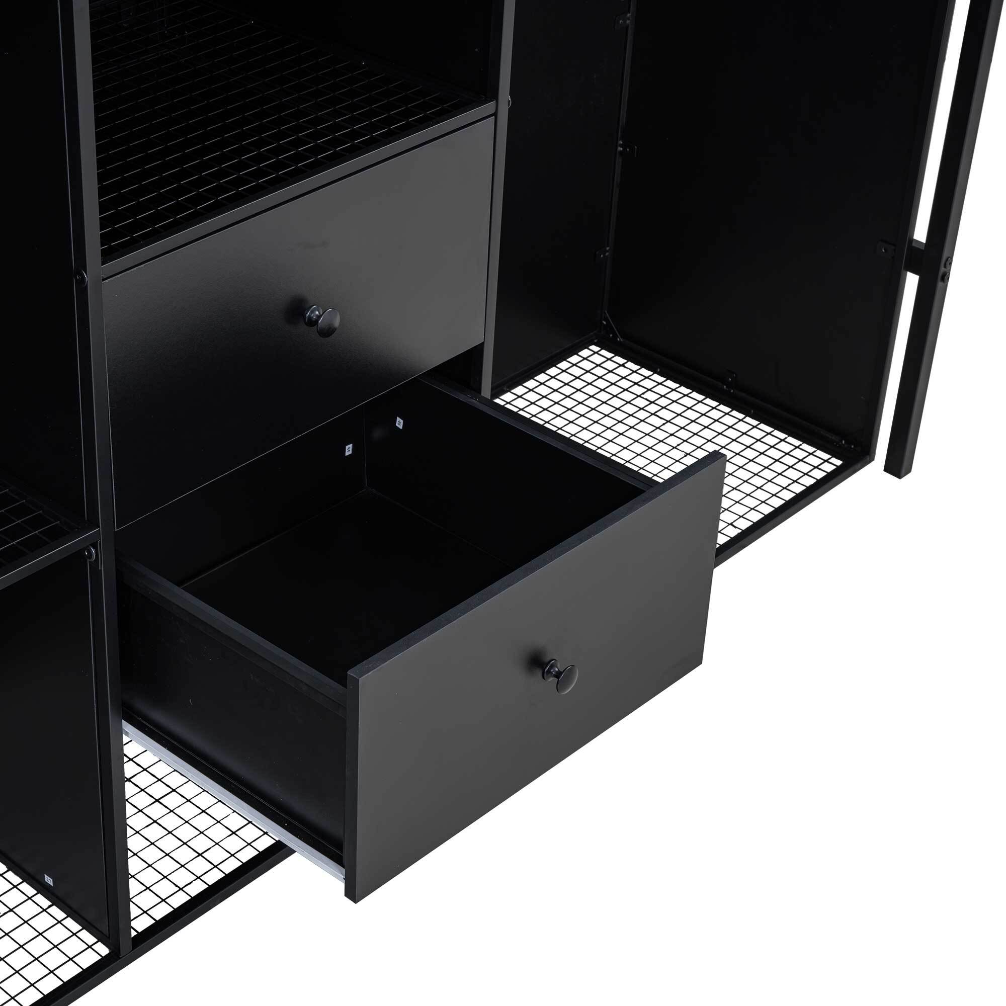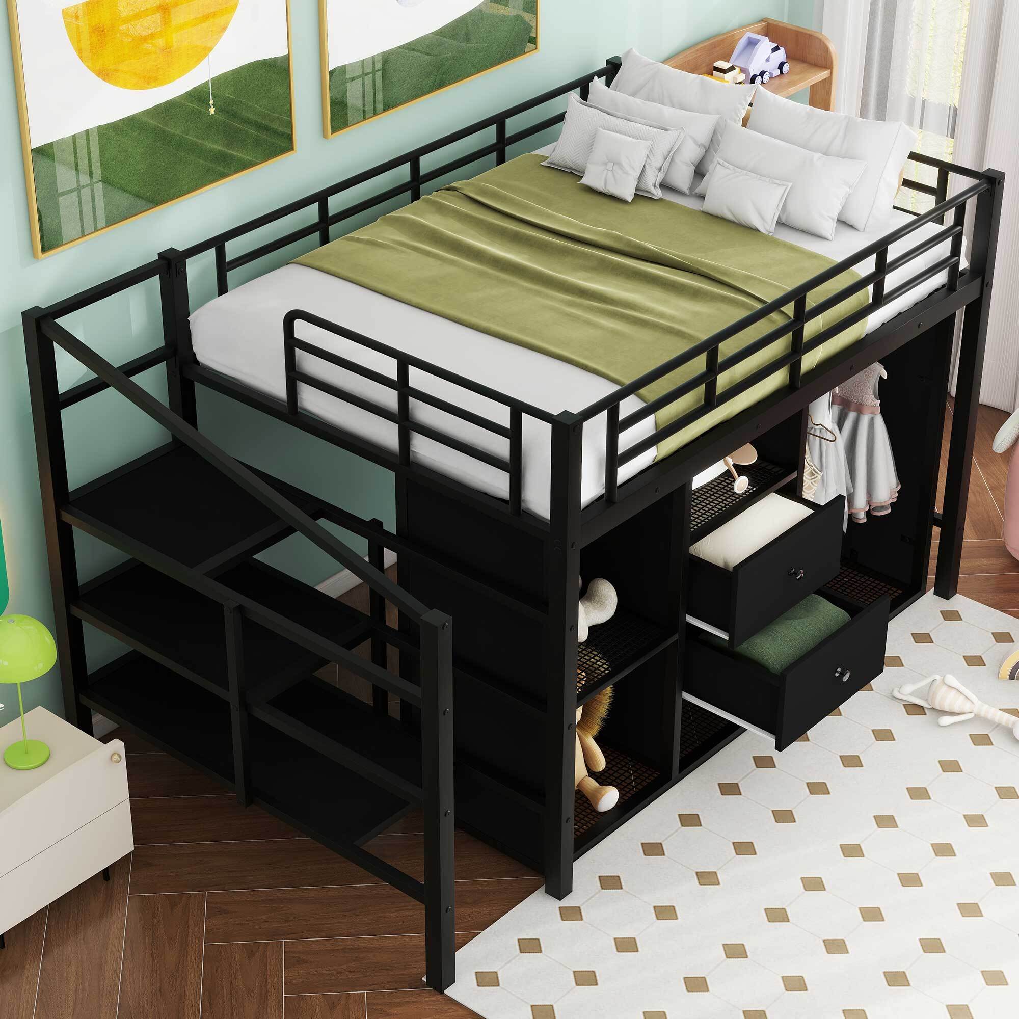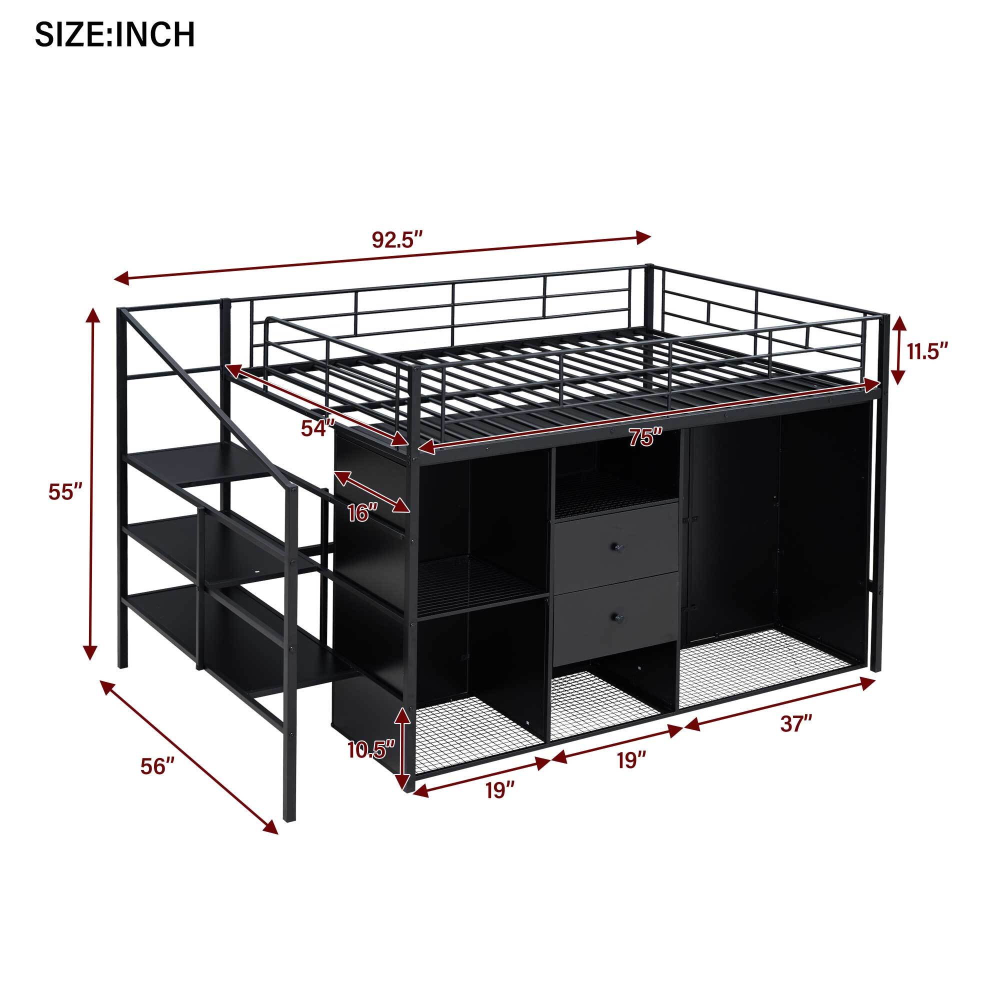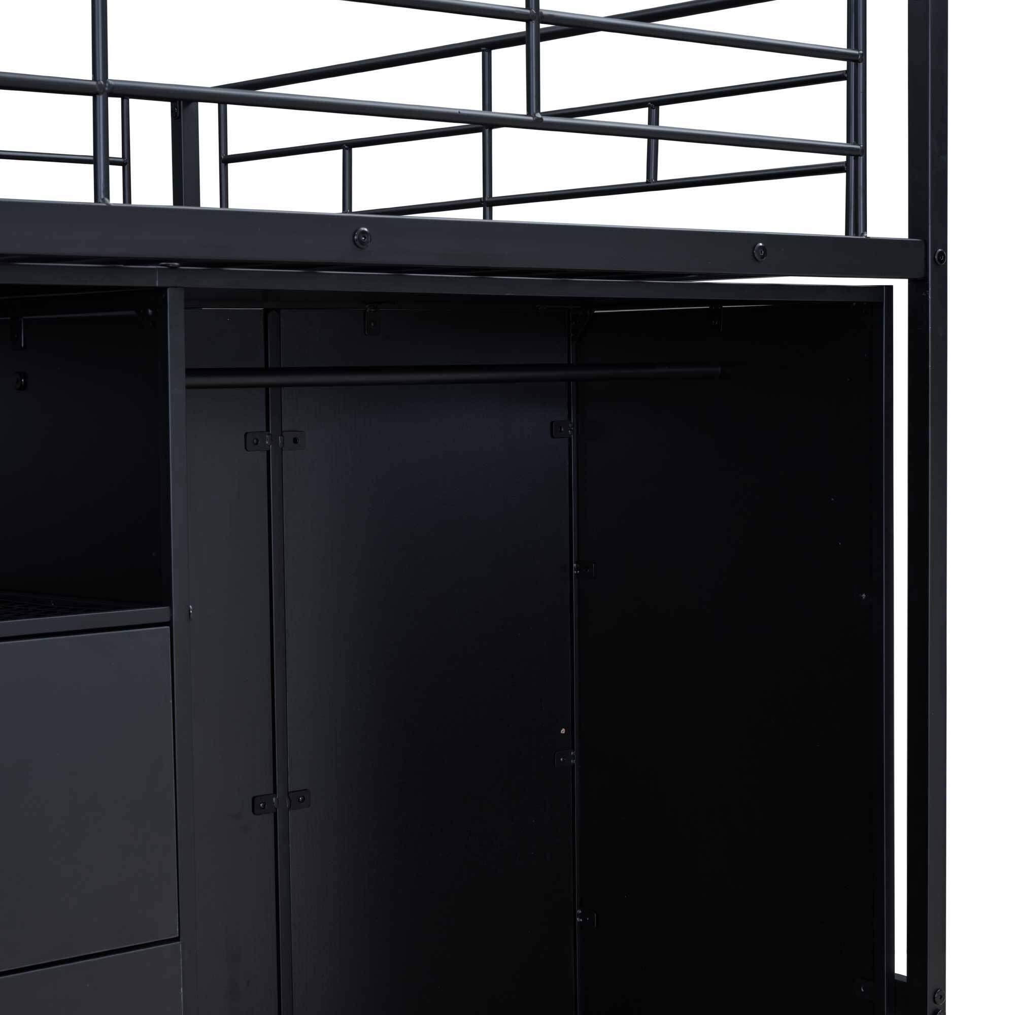 EUROCO Metal Full Size Loft Bed with Shelf and Wardrobe, Storage Staircase and Shelf, 2 Drawers, Black