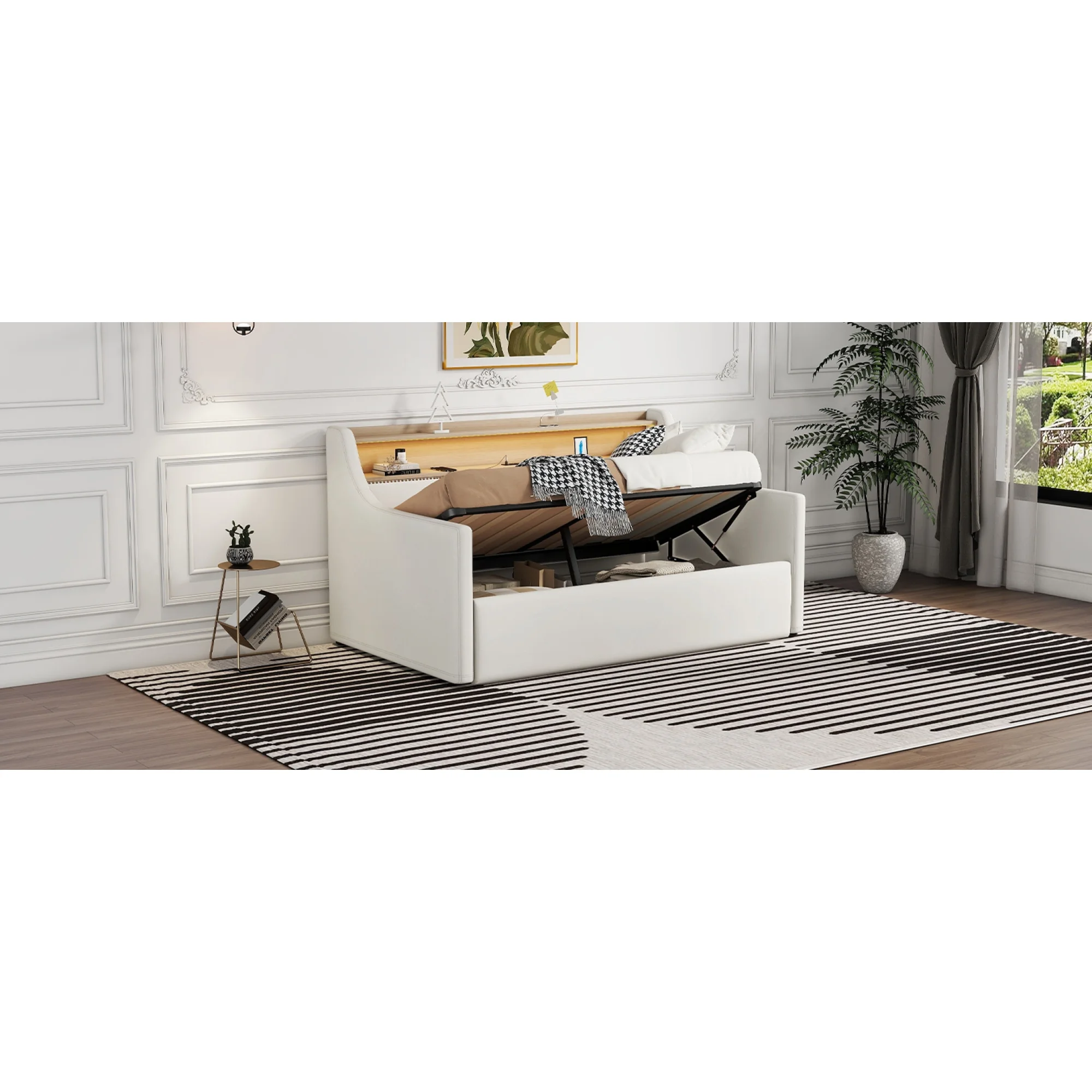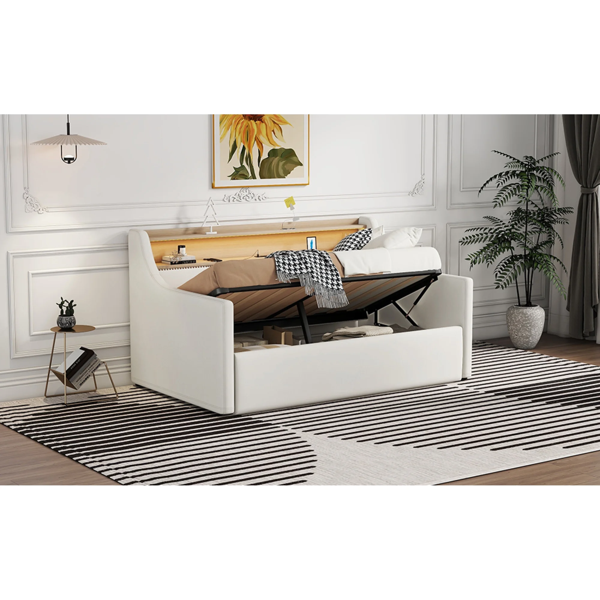 Twin Size Daybed with Hydraulic Storage, Upholstered Daybed with Lift Up Storage, White