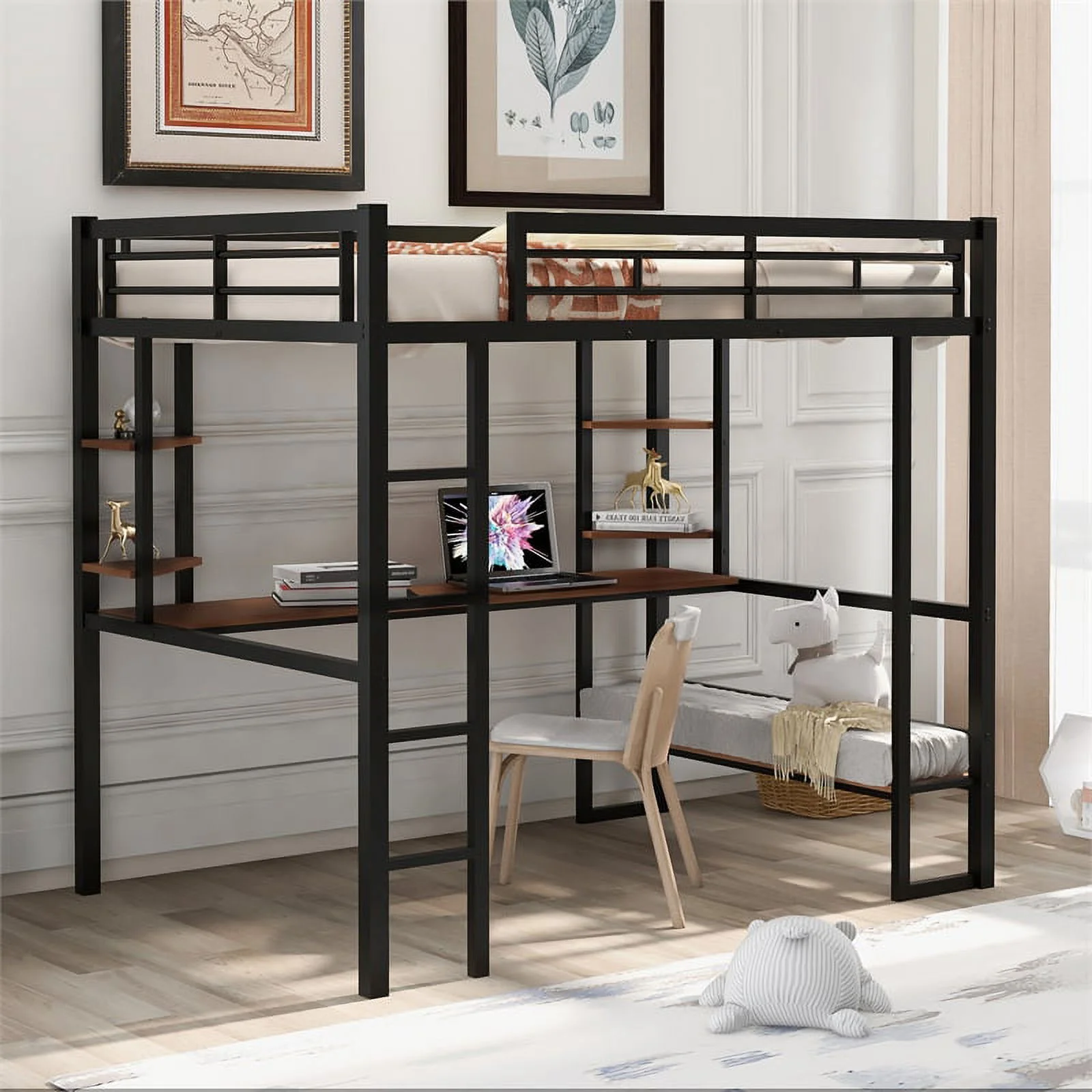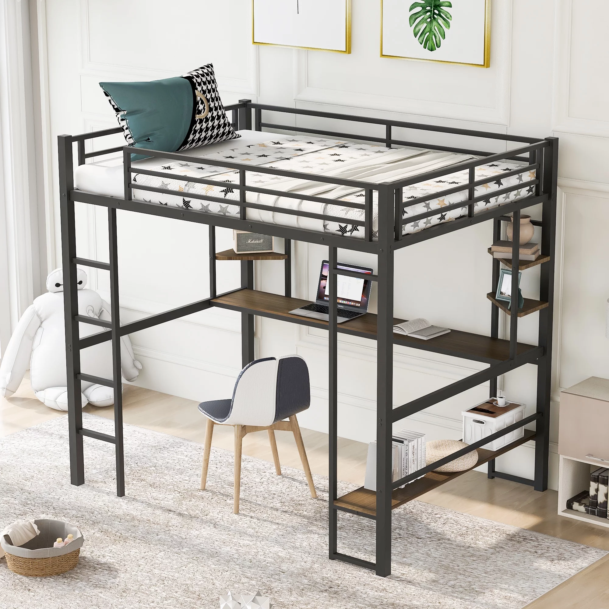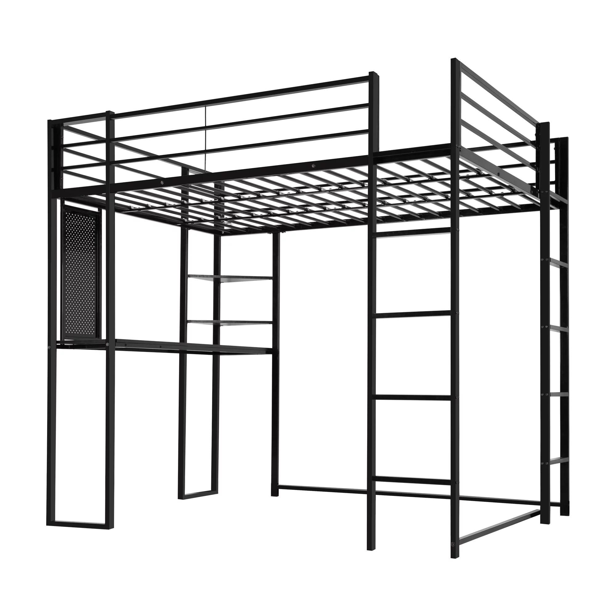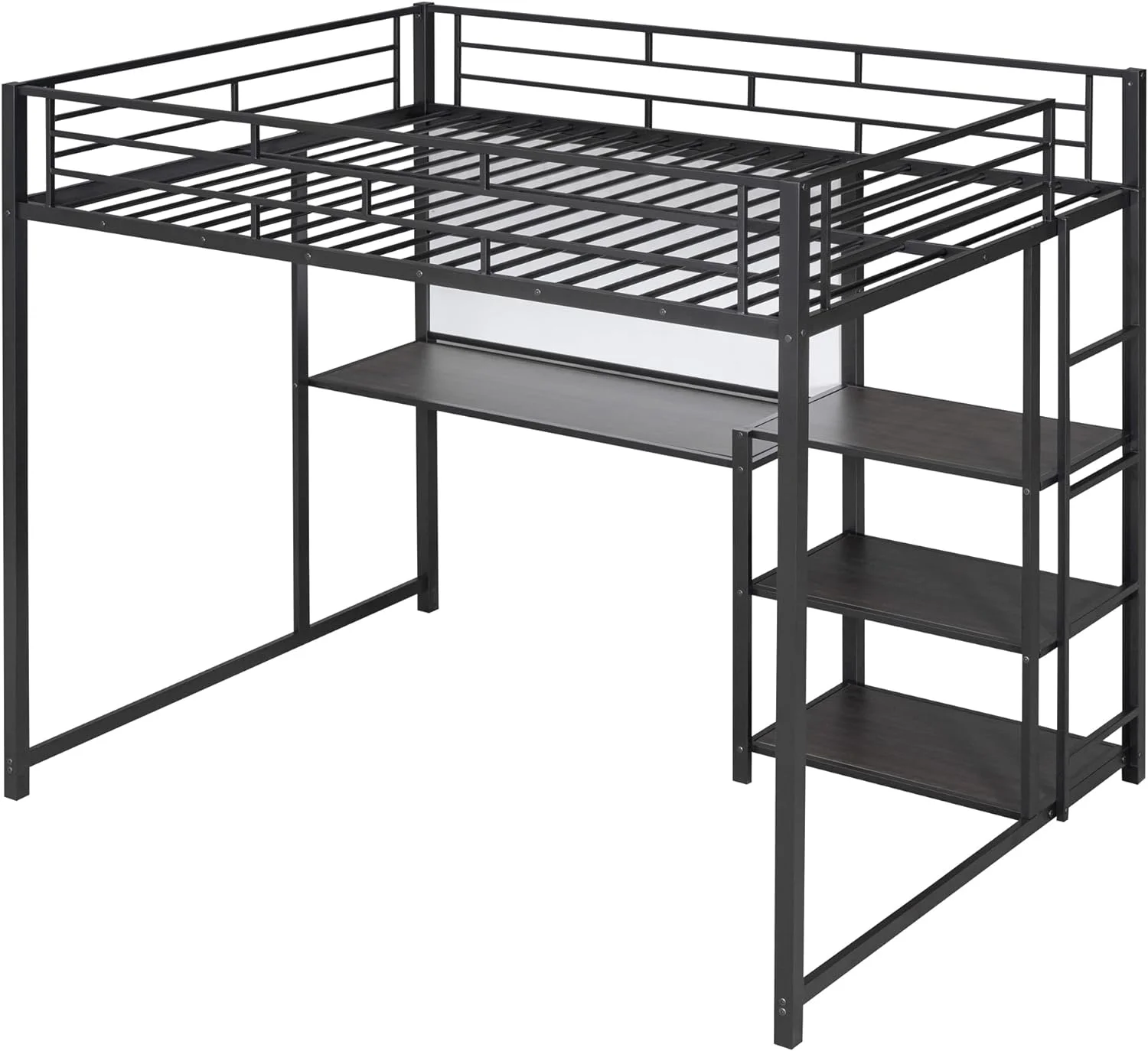 Full Size Loft Bed With Desk Ad Whiteboard, Metal Loft Bed With 3 Shelves Ad Ladder, Black