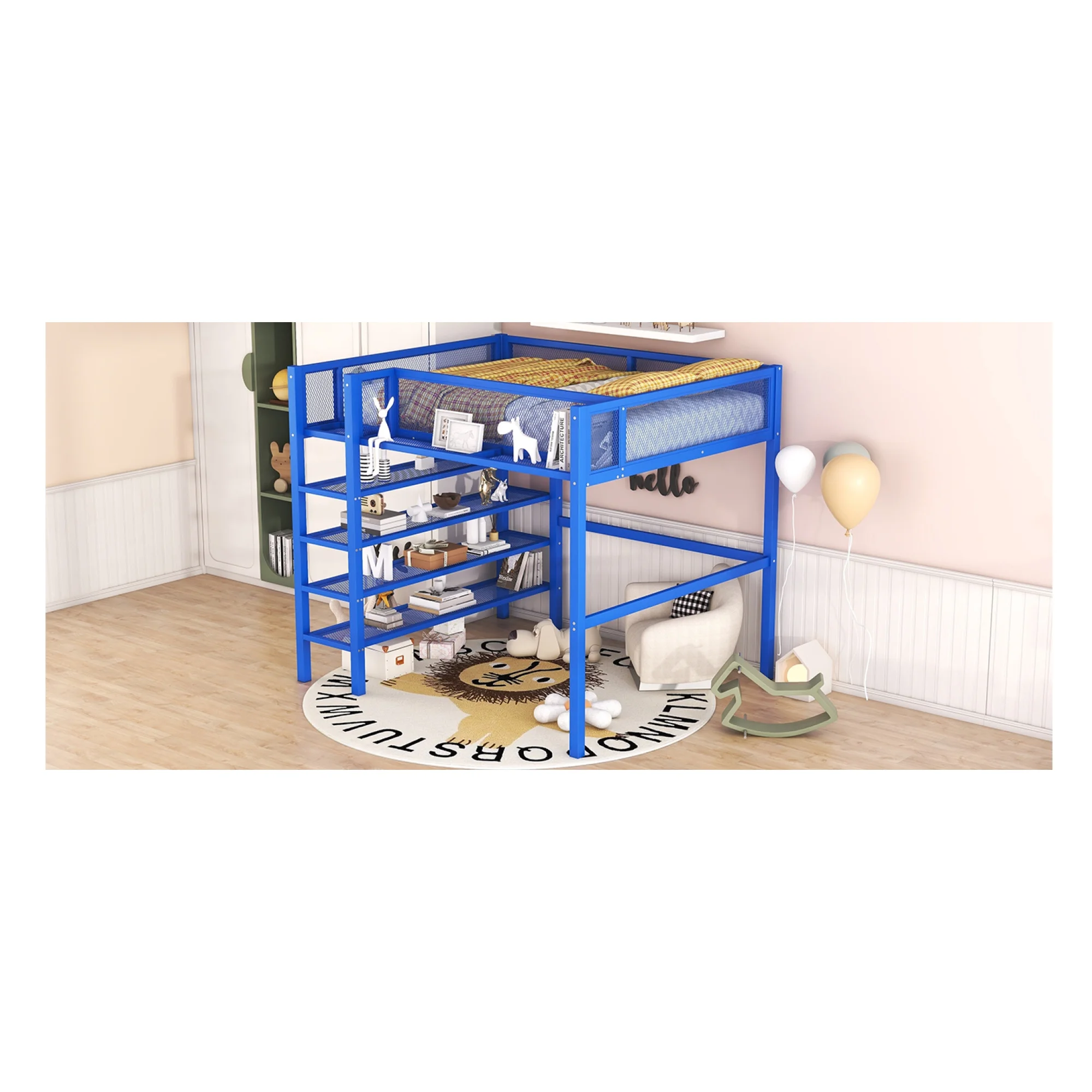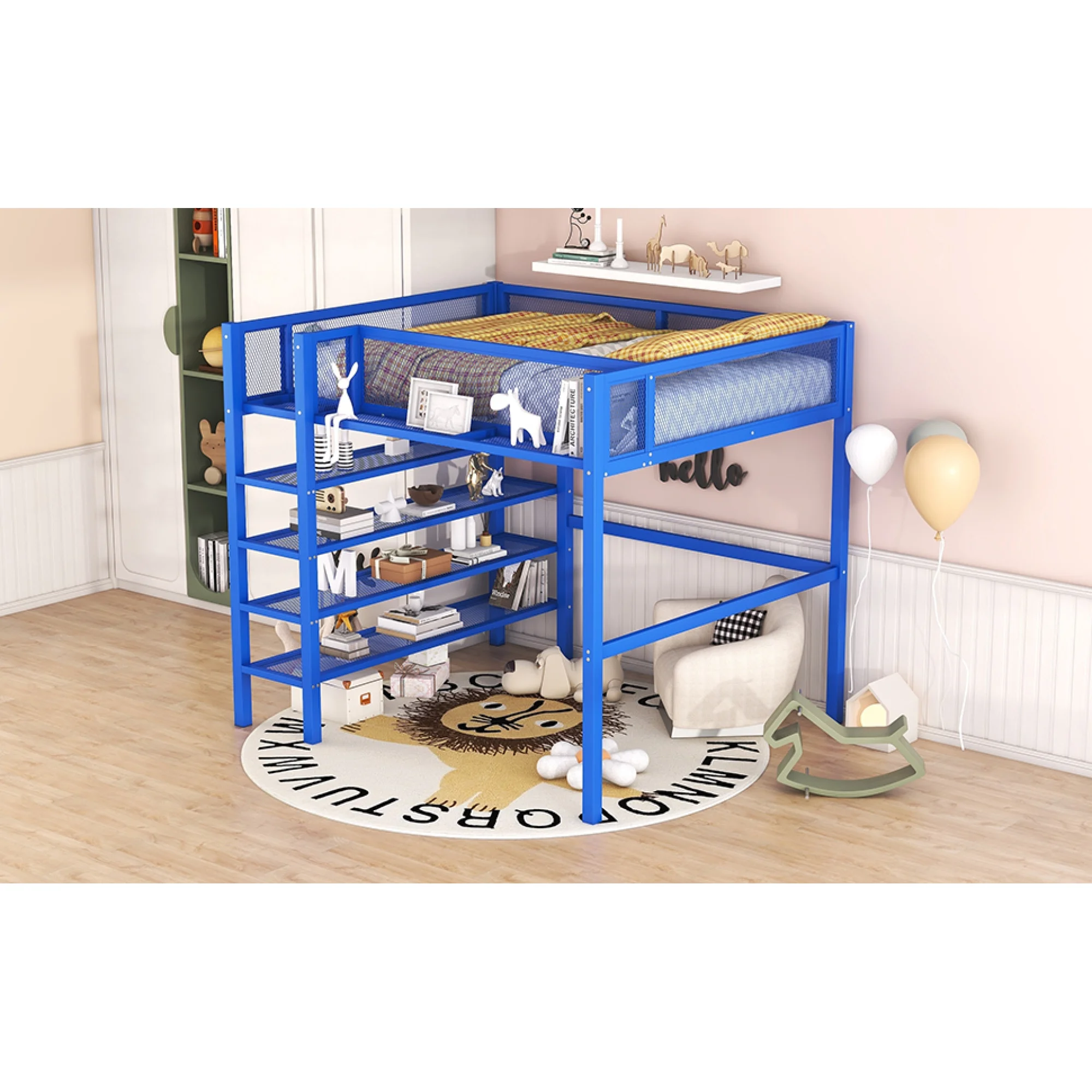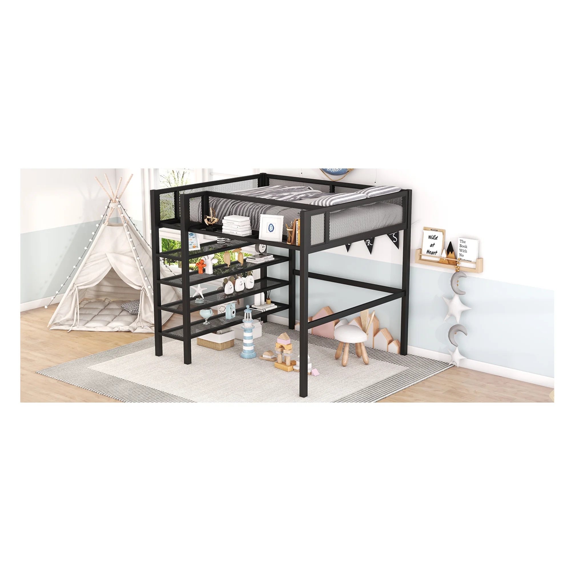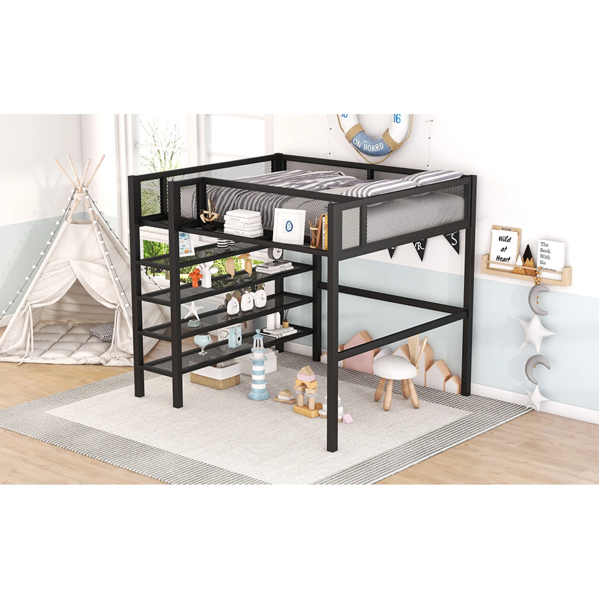Full Size Loft Bed With Desk Ad Whiteboard, Metal Loft Bed With 3 Shelves Ad Ladder, Black
