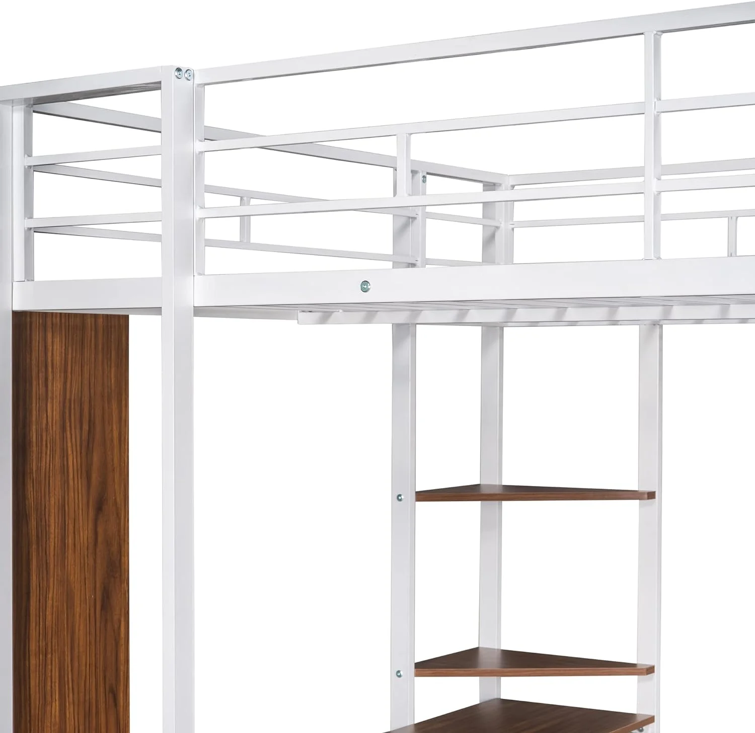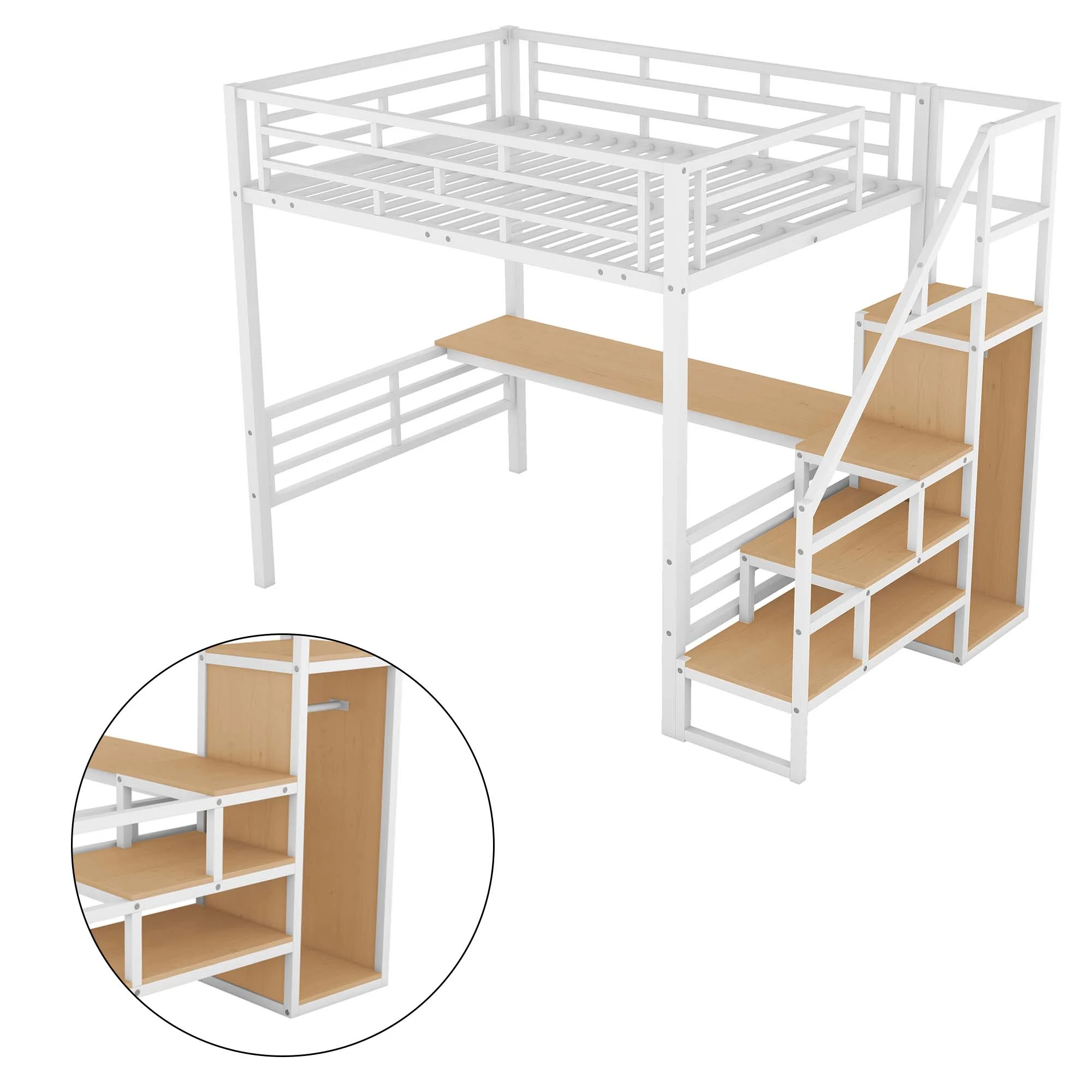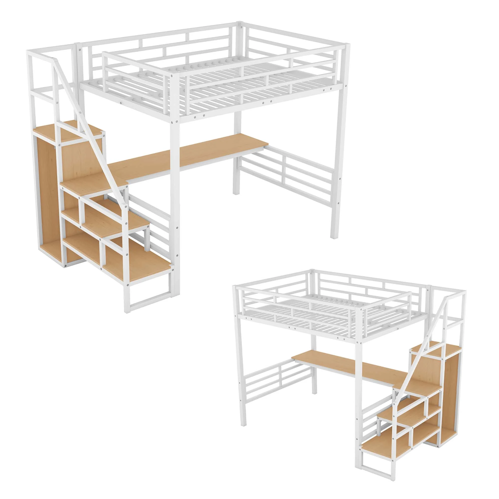 Aukfa Full Size Metal Loft Bed with Desk and Wardrobe, Staircase Loft Bed for Kids Teens - White