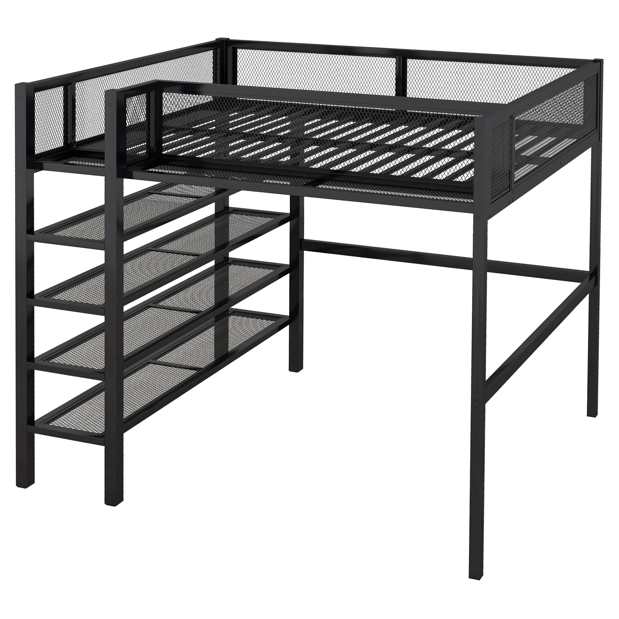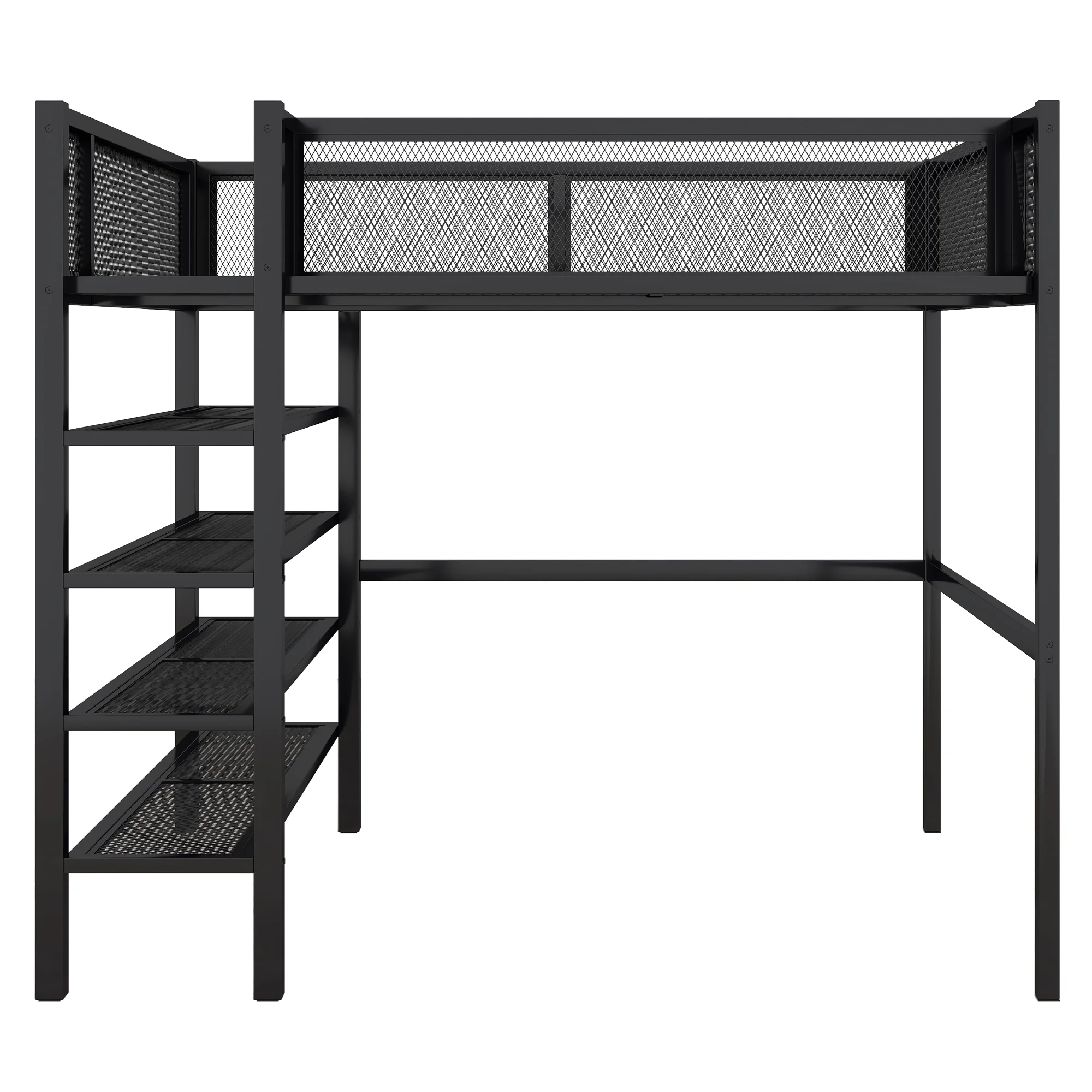 Momspeace Full Size Metal Loft Bed with Desk and 2-Tier Shelves and Grid Panel, Textilene Guardrail, Black