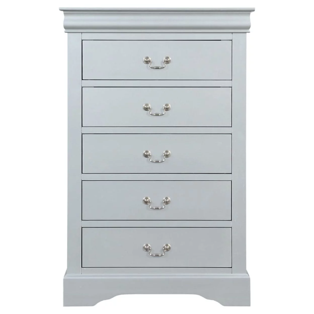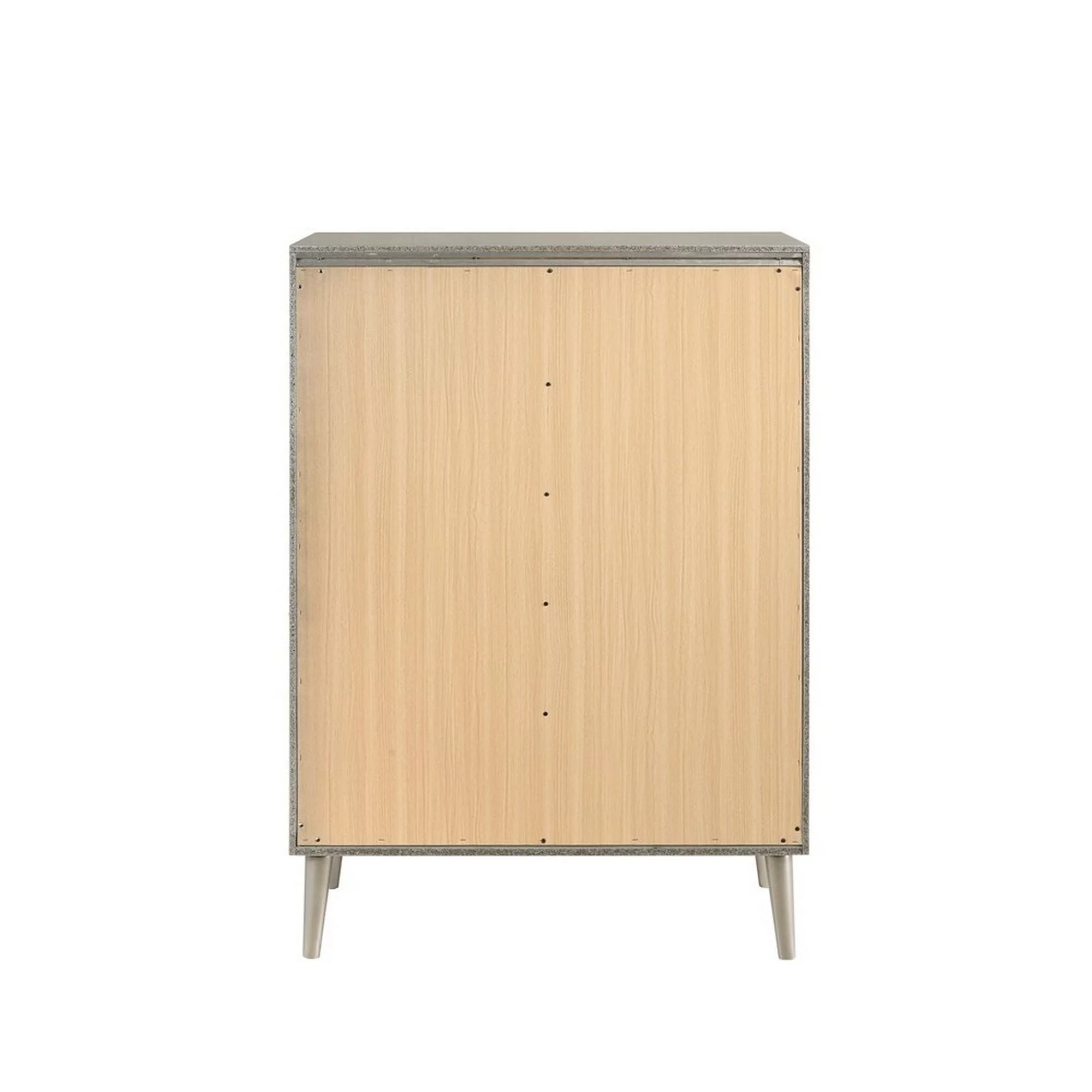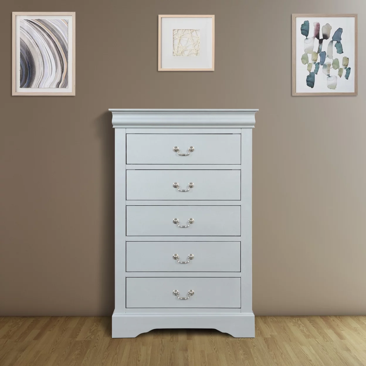 Better Home Products Chest Five Drawer with Pine Legs in Gray and Silver Oak Finish.