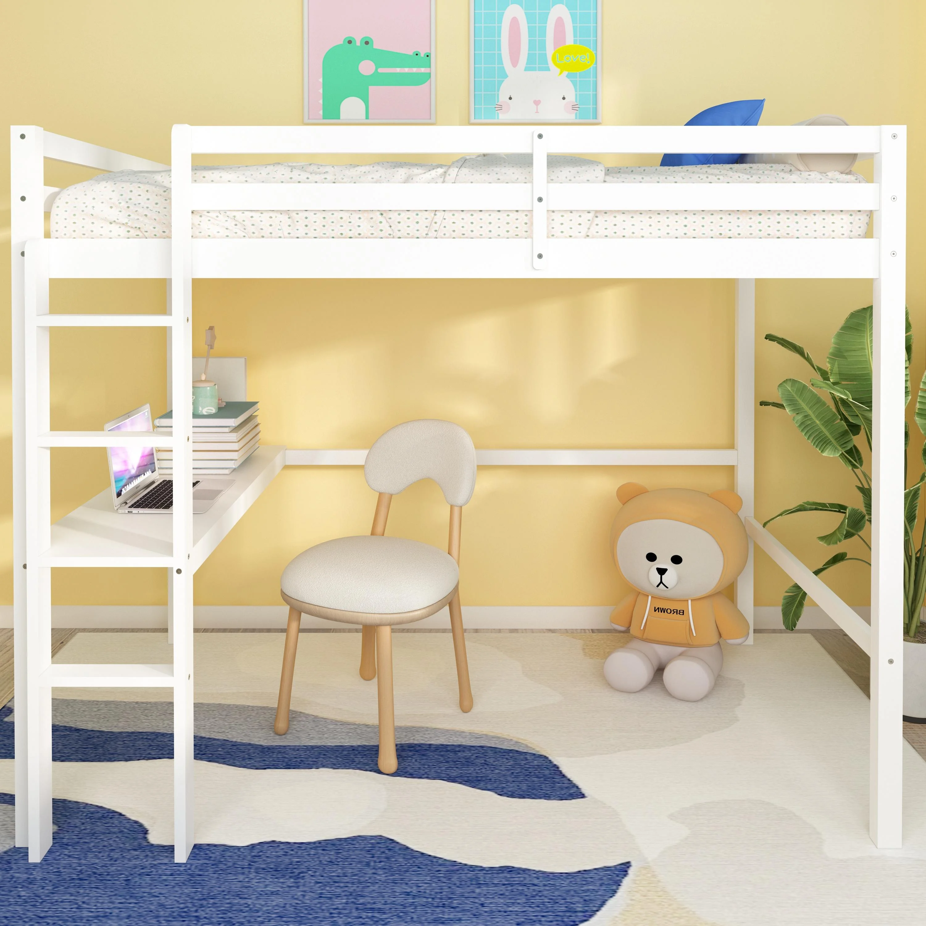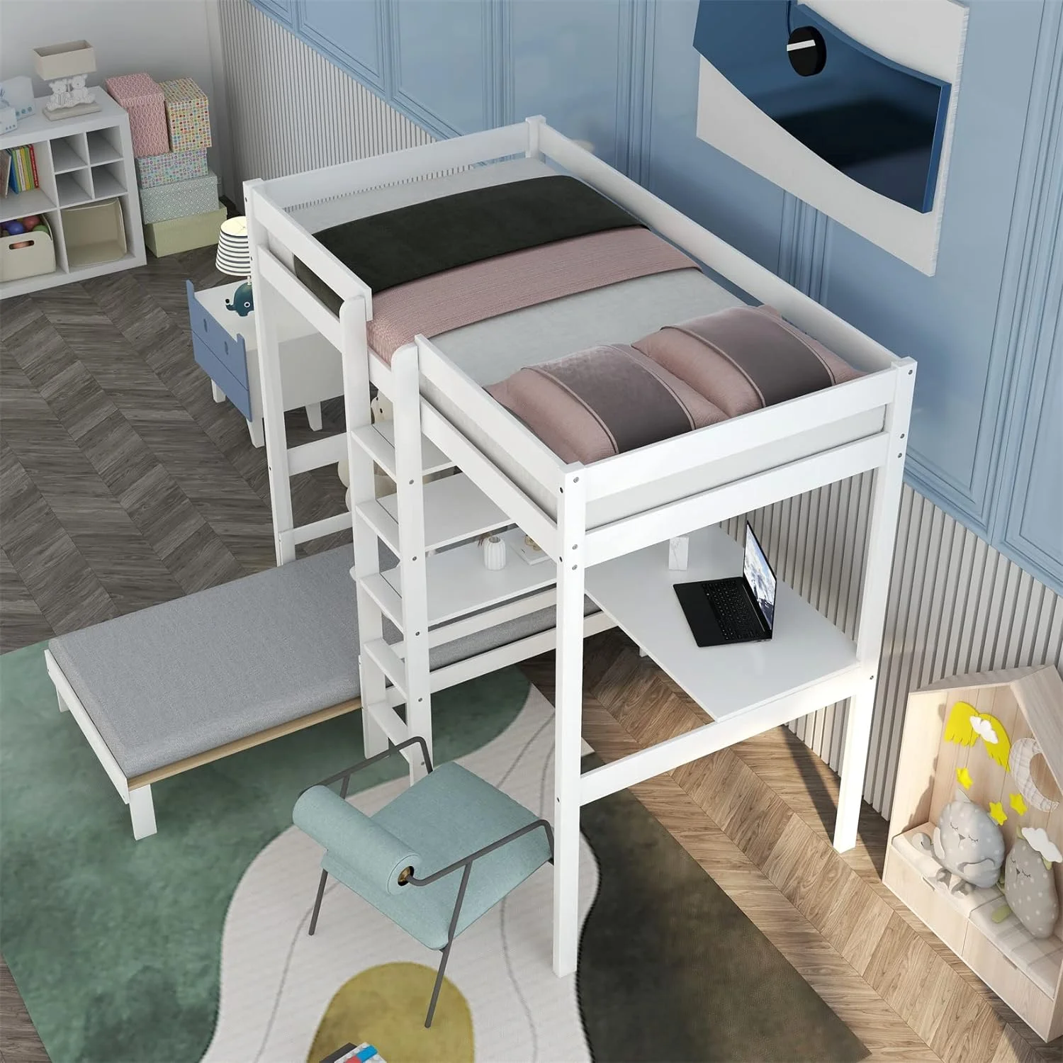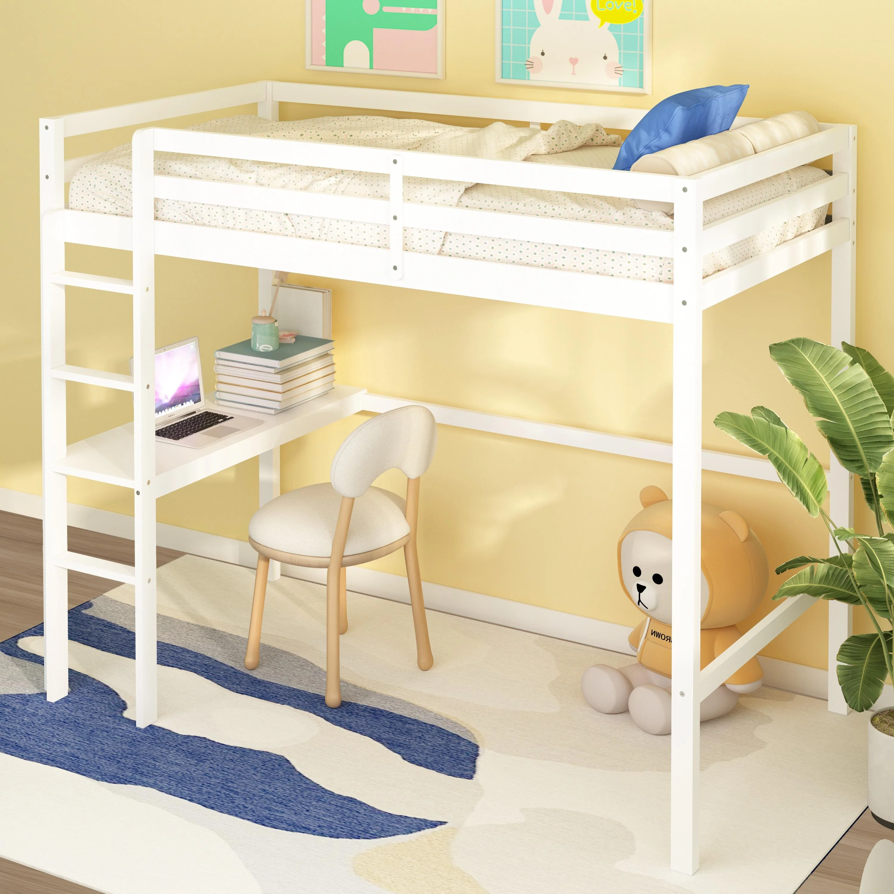 CHURANTY Solid Wood Twin Low Loft Bed with Desk and Storage Drawers Cabinet Rolling Portable Desk