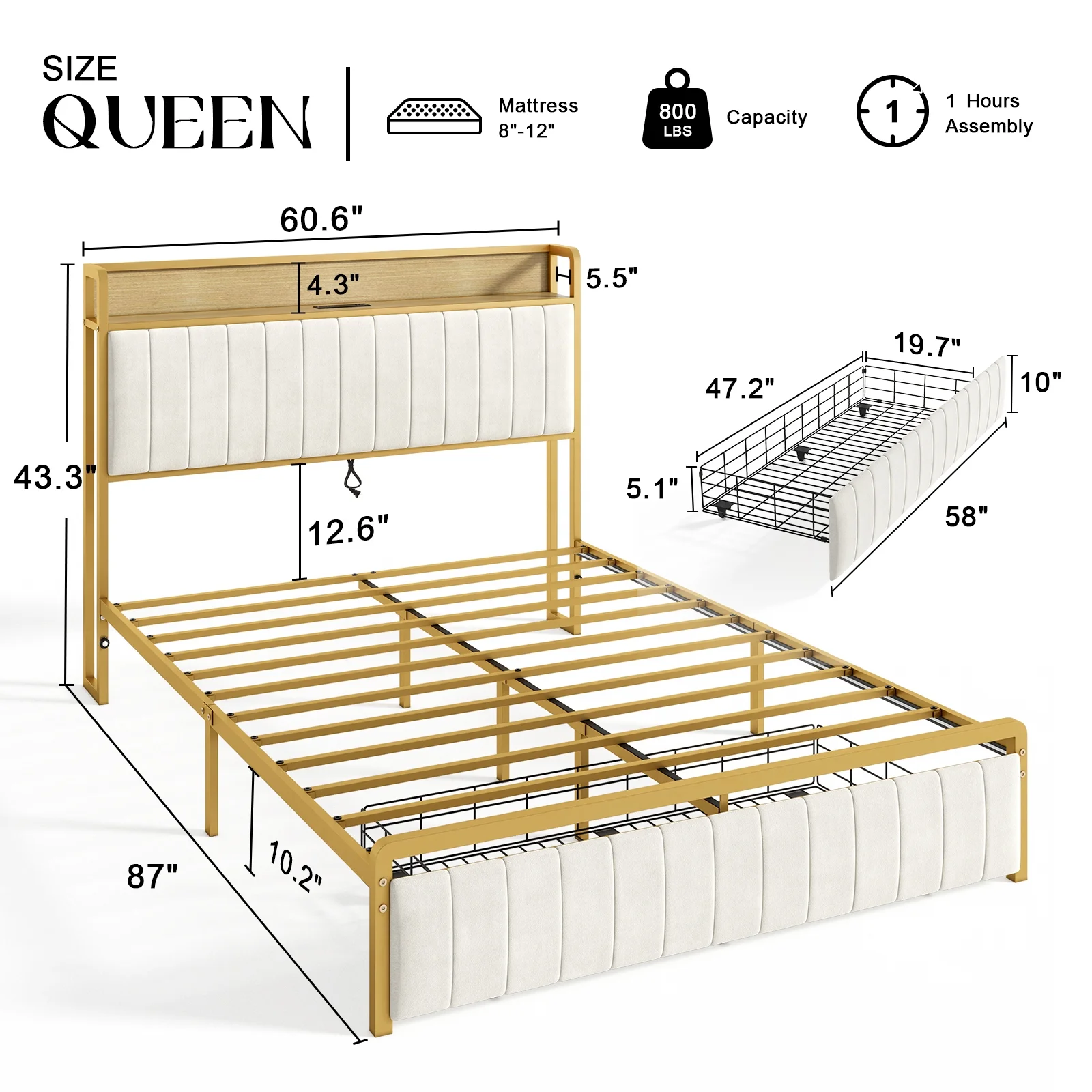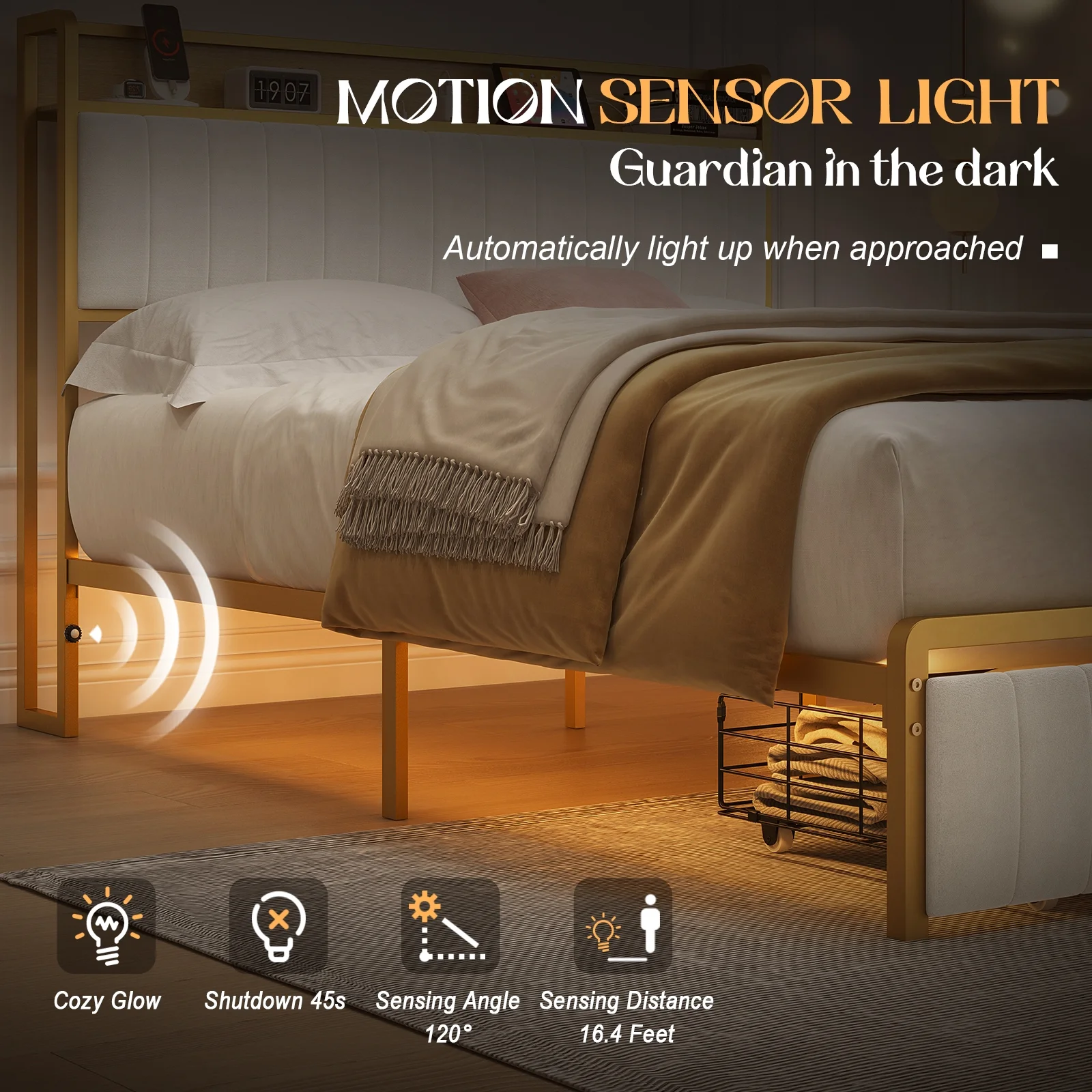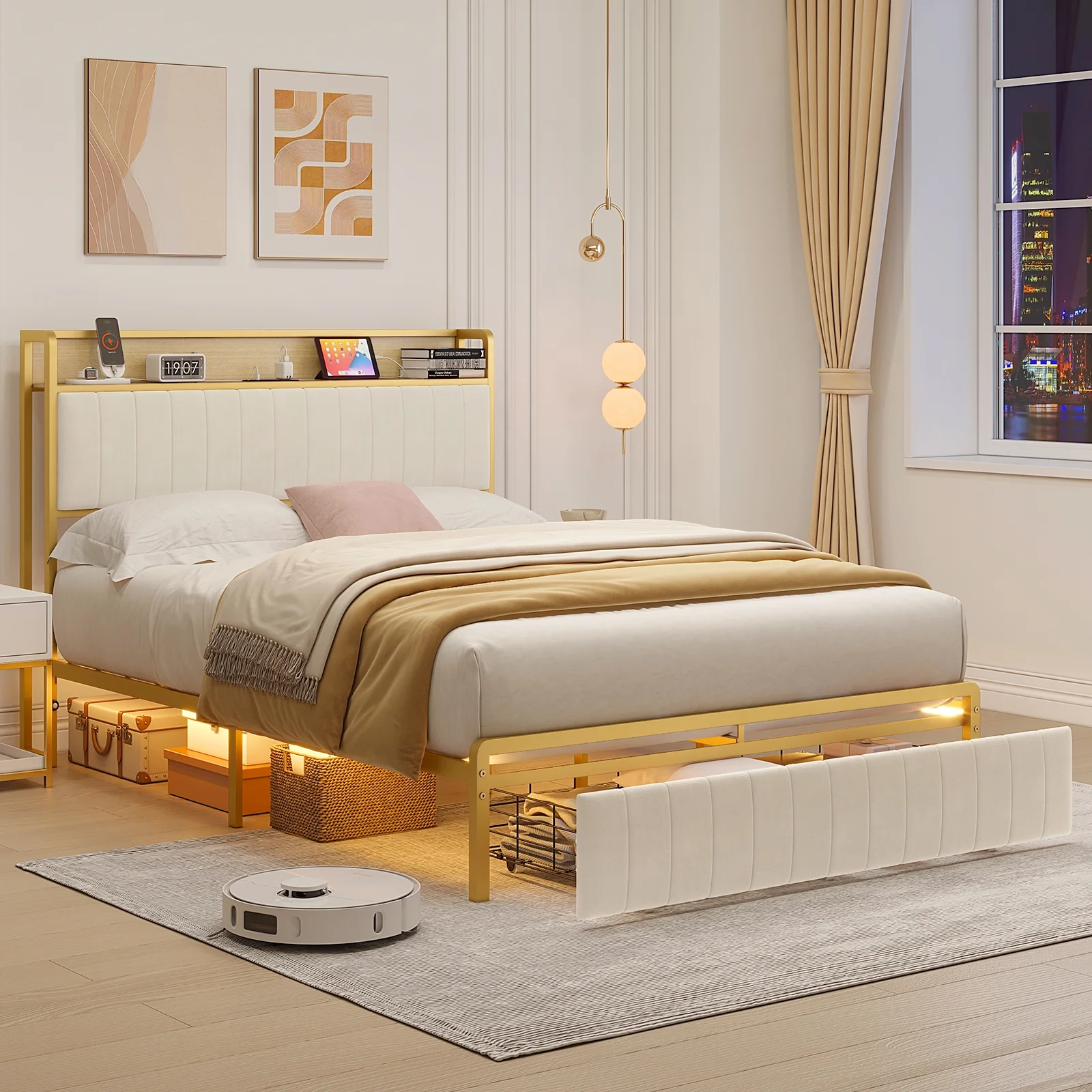 AMERLIFE Queen Size Storage LED Bed Frame with Motion Light, Drawer and Charging, Gold & Beige