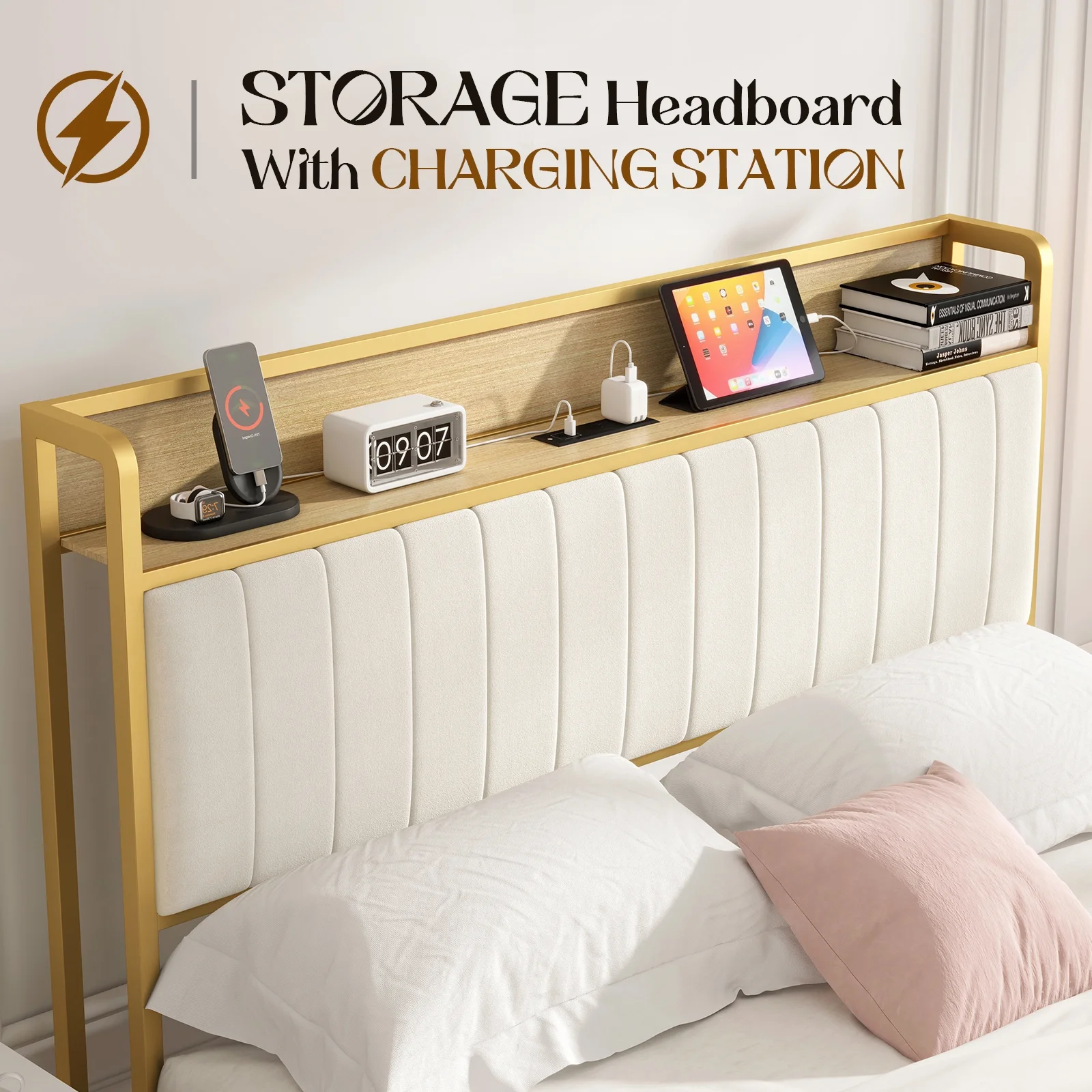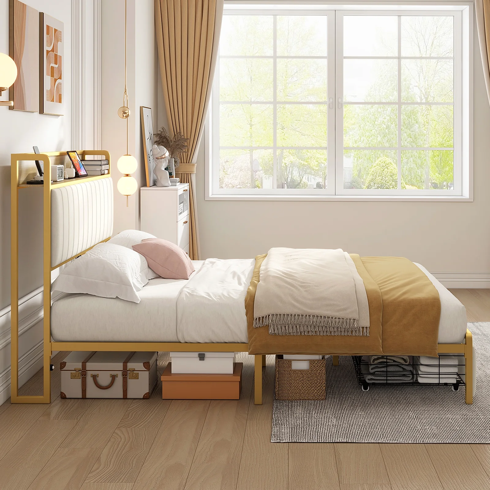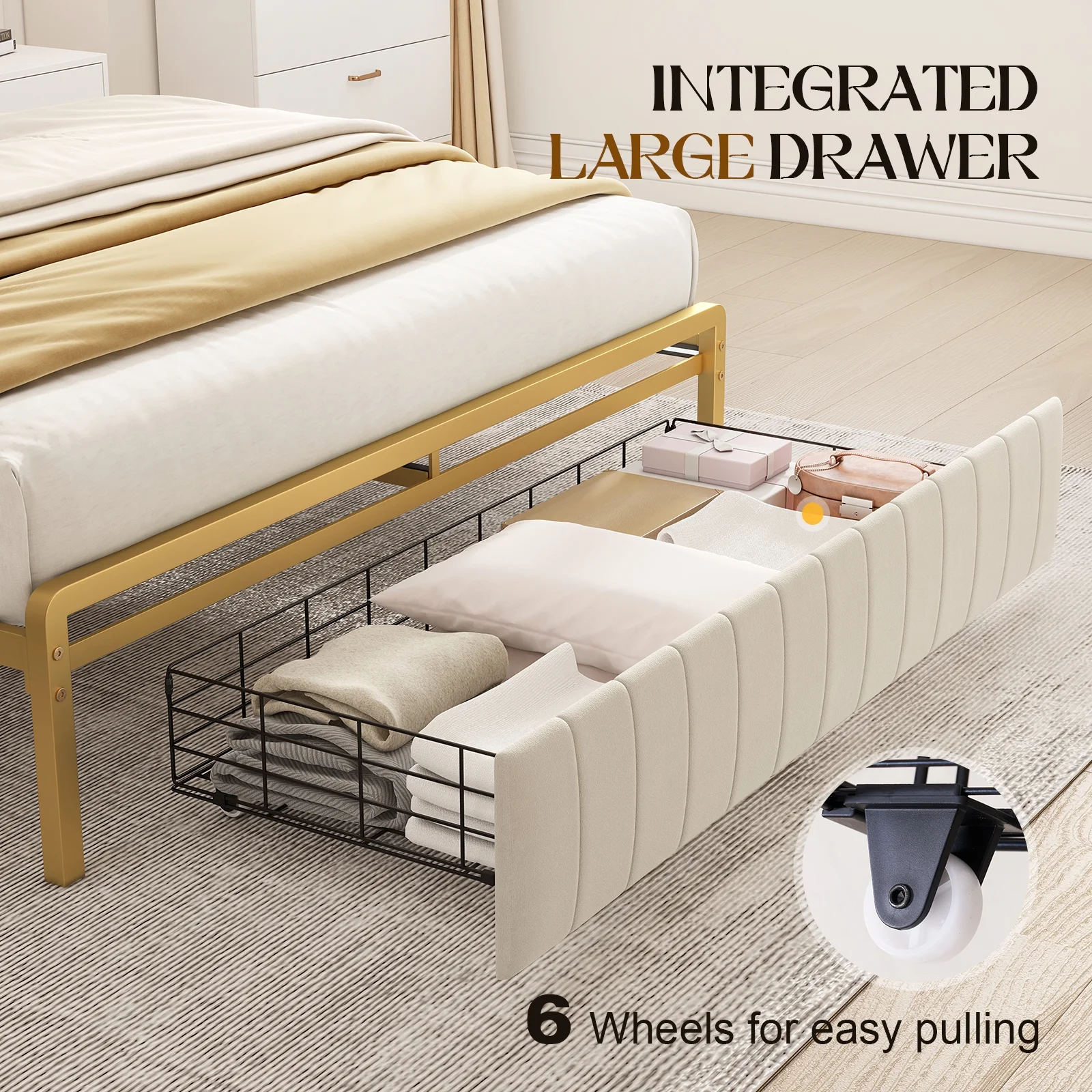 AMERLIFE Queen Size Storage LED Bed Frame with Motion Light, Drawer and Charging, Gold & Beige