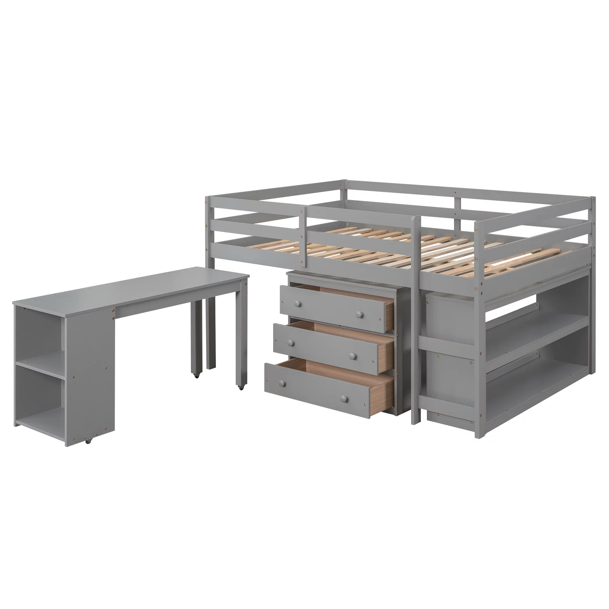 Churanty Wooden Full Loft Bed with Cabinet and Rolling Portable Desk, Low Study Loft Bed with Drawers,Gray