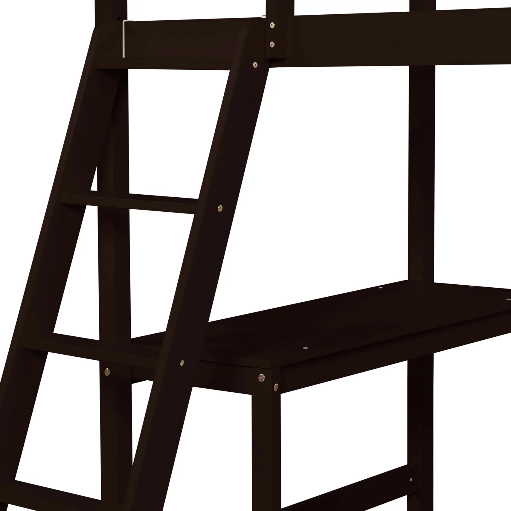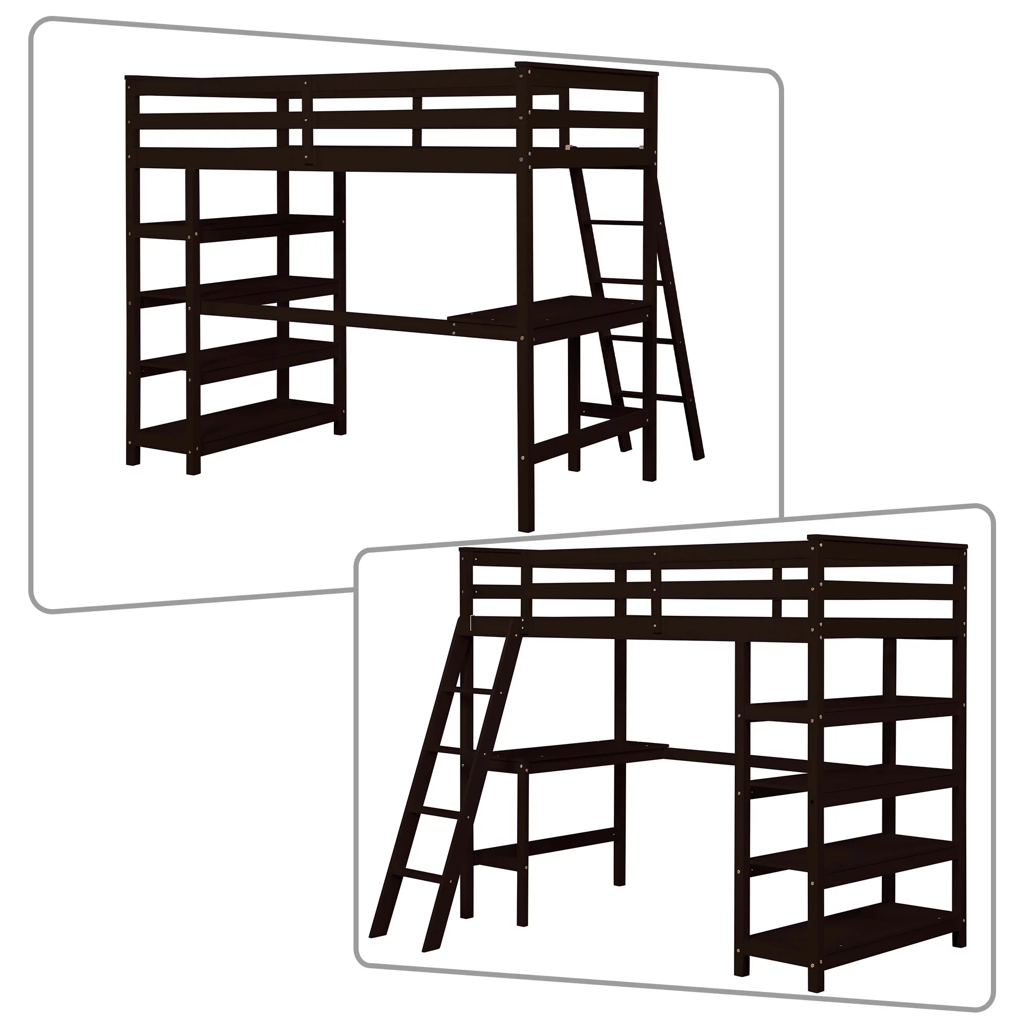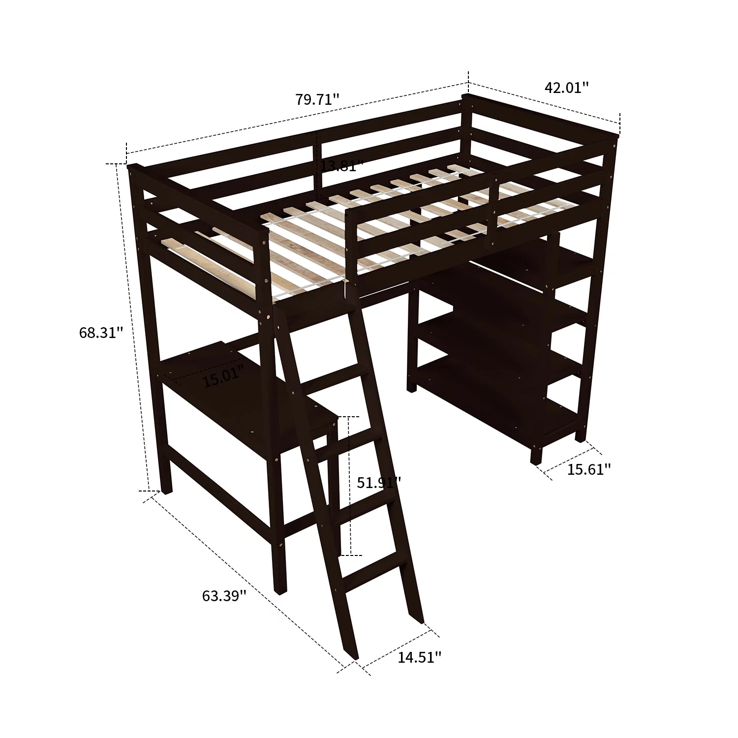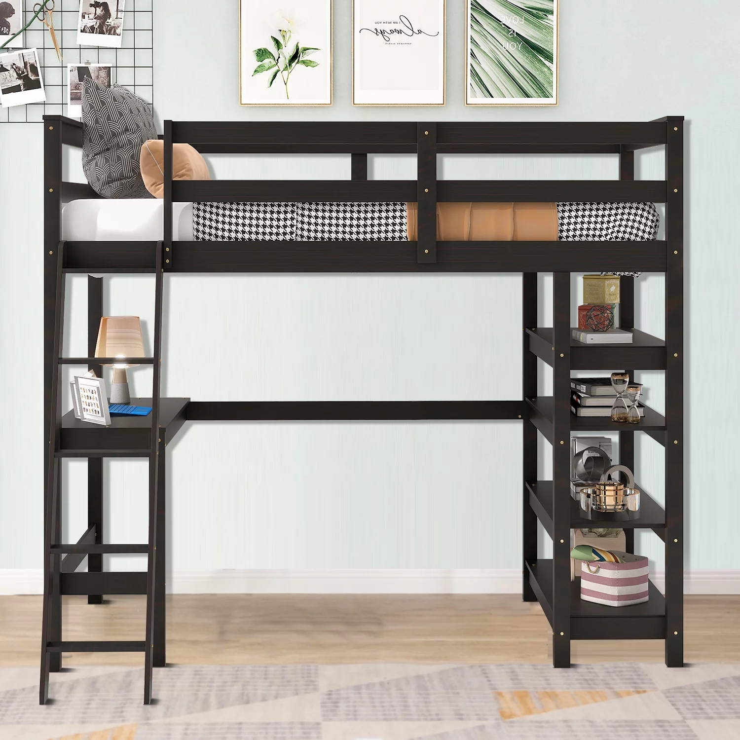 Minimalist and Multifunctional Twin-size Wooden Loft Bed with A Ladder, A desk and 4 Shelves, Espresso