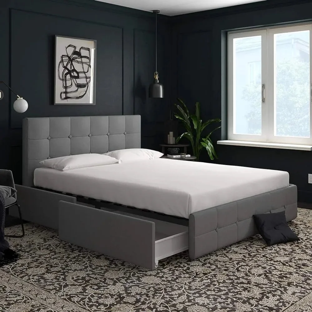 Upholstered Platform Bed With Underbed Storage Drawers and Button Tufted Headboard and Footboard King Size Bed Frame Queen Home