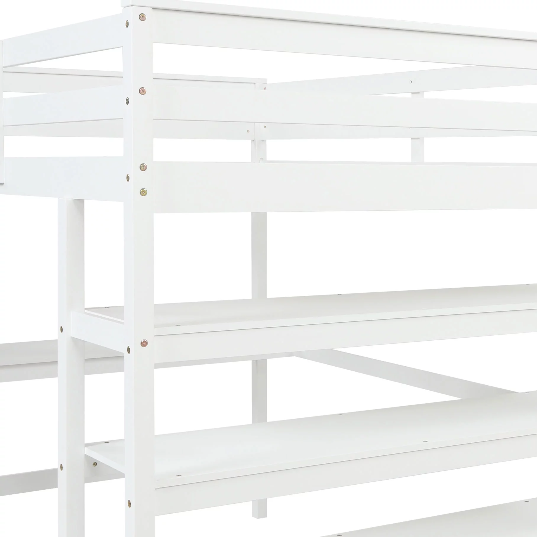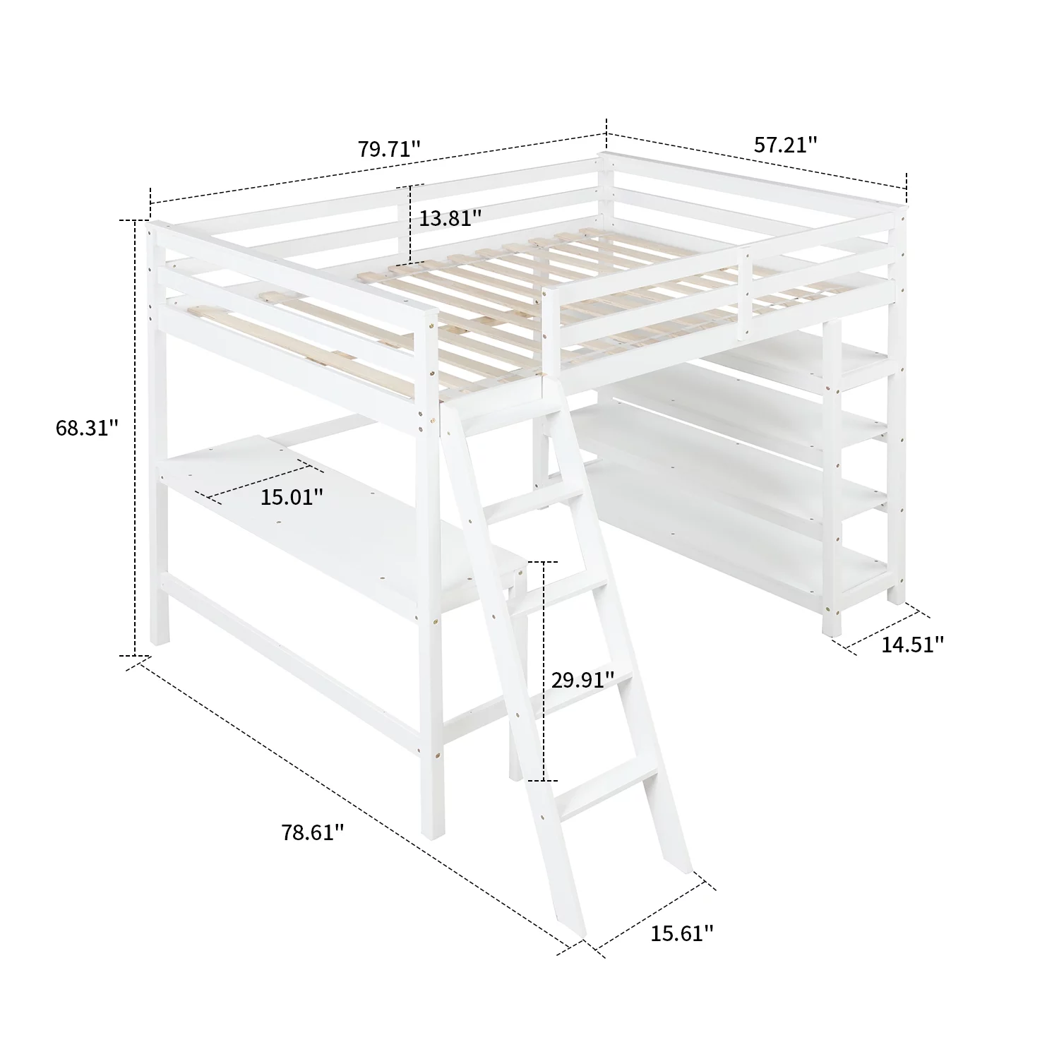 Minimalist and Multifunctional Full-size Wooden Loft Bed with A Ladder, A desk and 4 Shelves, White