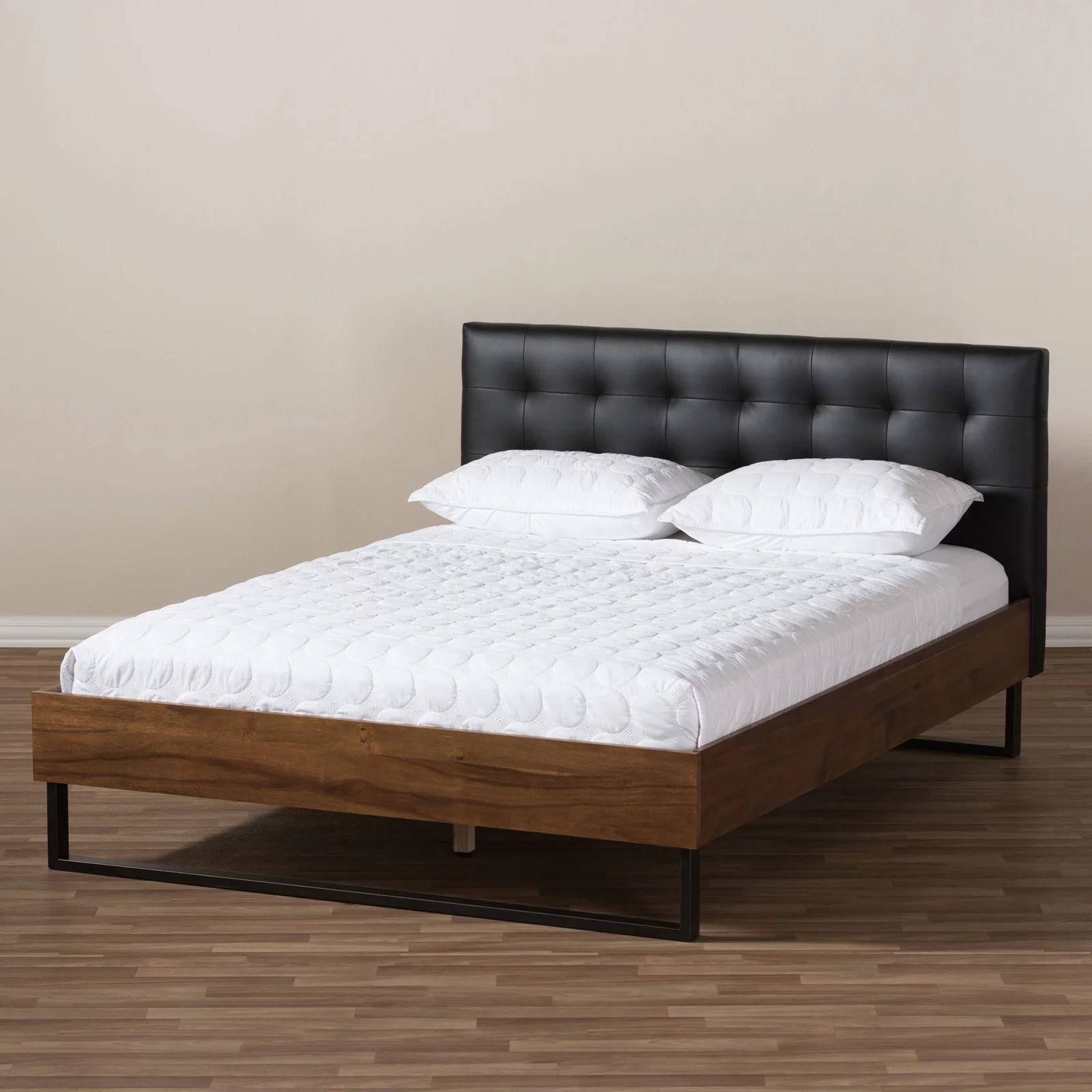 Baxton Studio Mitchell Rustic Industrial Walnut Wood Black Faux Leather Dark Bronze Metal King Size Platform Bed