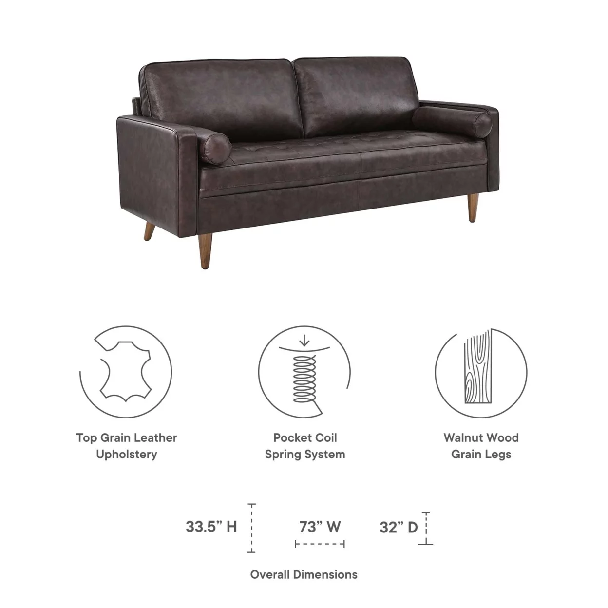 Modway Valour 81" Modern Style Top Grain Leather Sofa in Brown Finish
